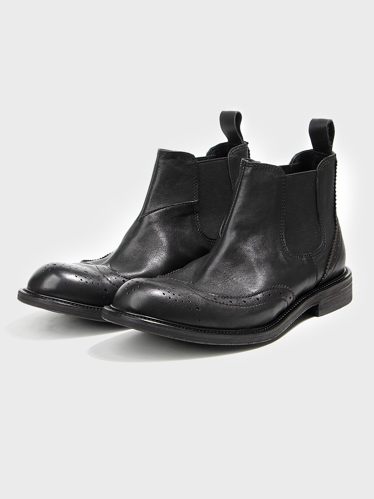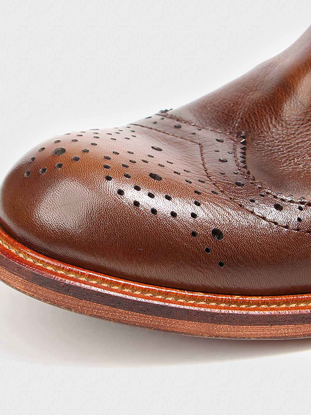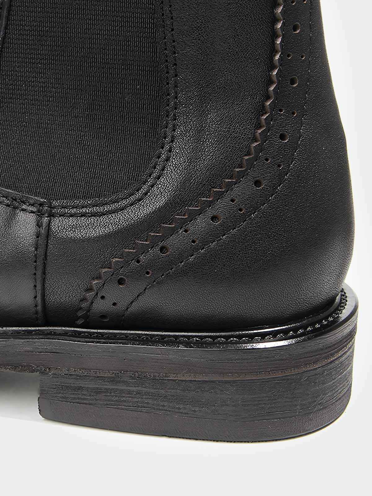 このブーツは、ブローグ(Brogue)の伝統的な彫刻デザインを採用しています。足型にフィットするデザインで、履きやすさとスタイリッシュなシルエットを両立しています。サイドゴアが付いており、脱ぎ履きが簡単で、ハイカットデザインが足首に良好なサポートを提供します。適切なヒールの高さは快適さを保ちつつ、着用者の身長比率を高めます。