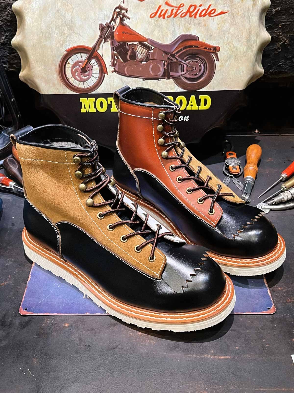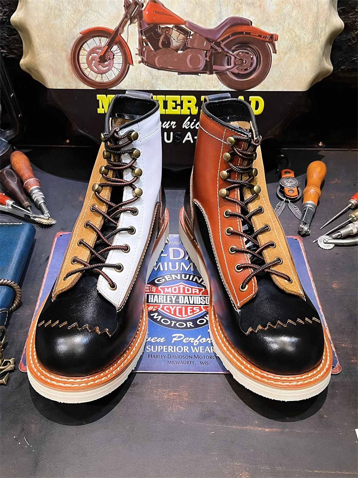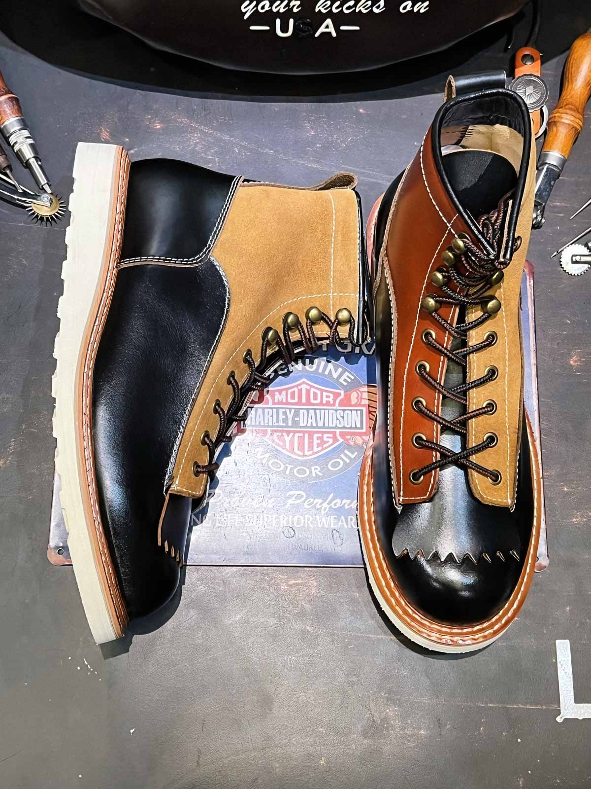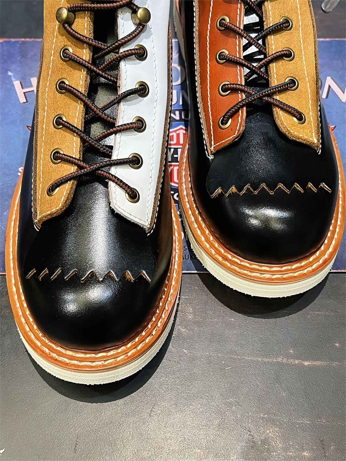 このバイカーブーツは、様々な色と素材を組み合わせたデザインで、アメリカンヴィンテージスタイルを強調しています。使用するうちに現れる黒いティーコアレザーの底色は、クラシックなモーターサイクルシューズによく見られるデザインです。履き心地と実用性を考慮して設計されたこのシューズは、最初は少し硬いかもしれませんが、時間と共に足になじんできます。