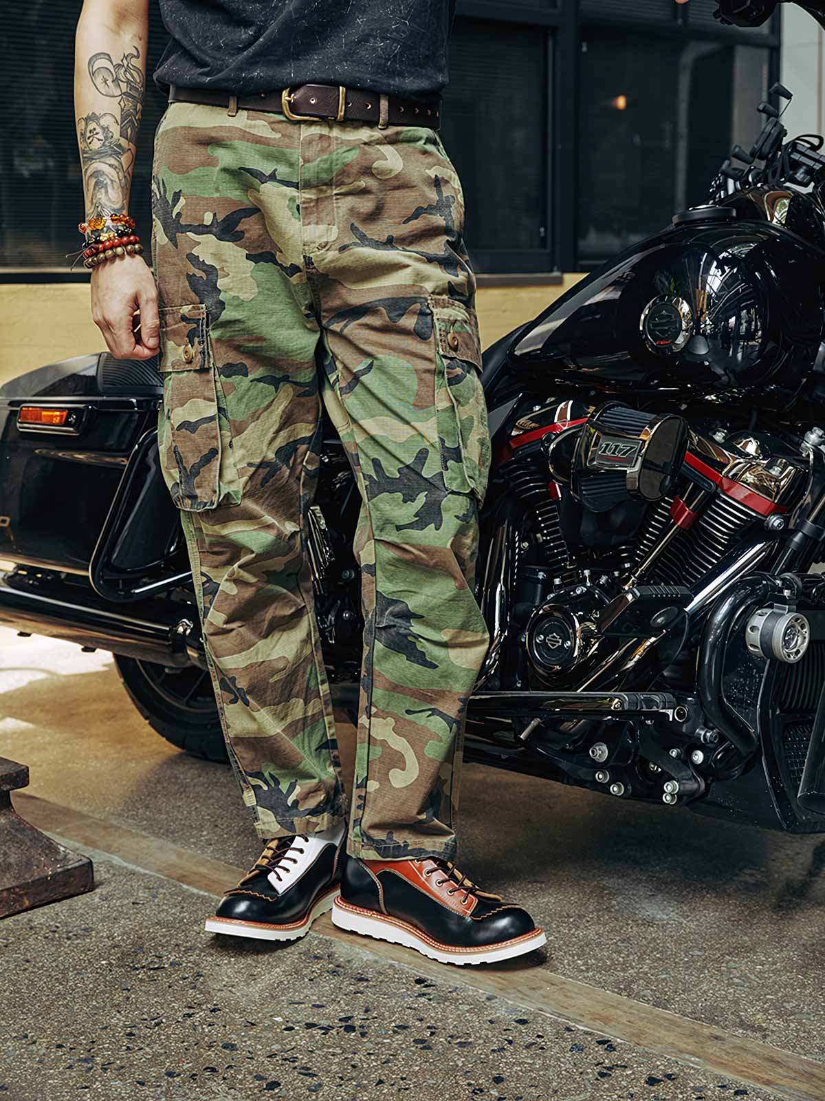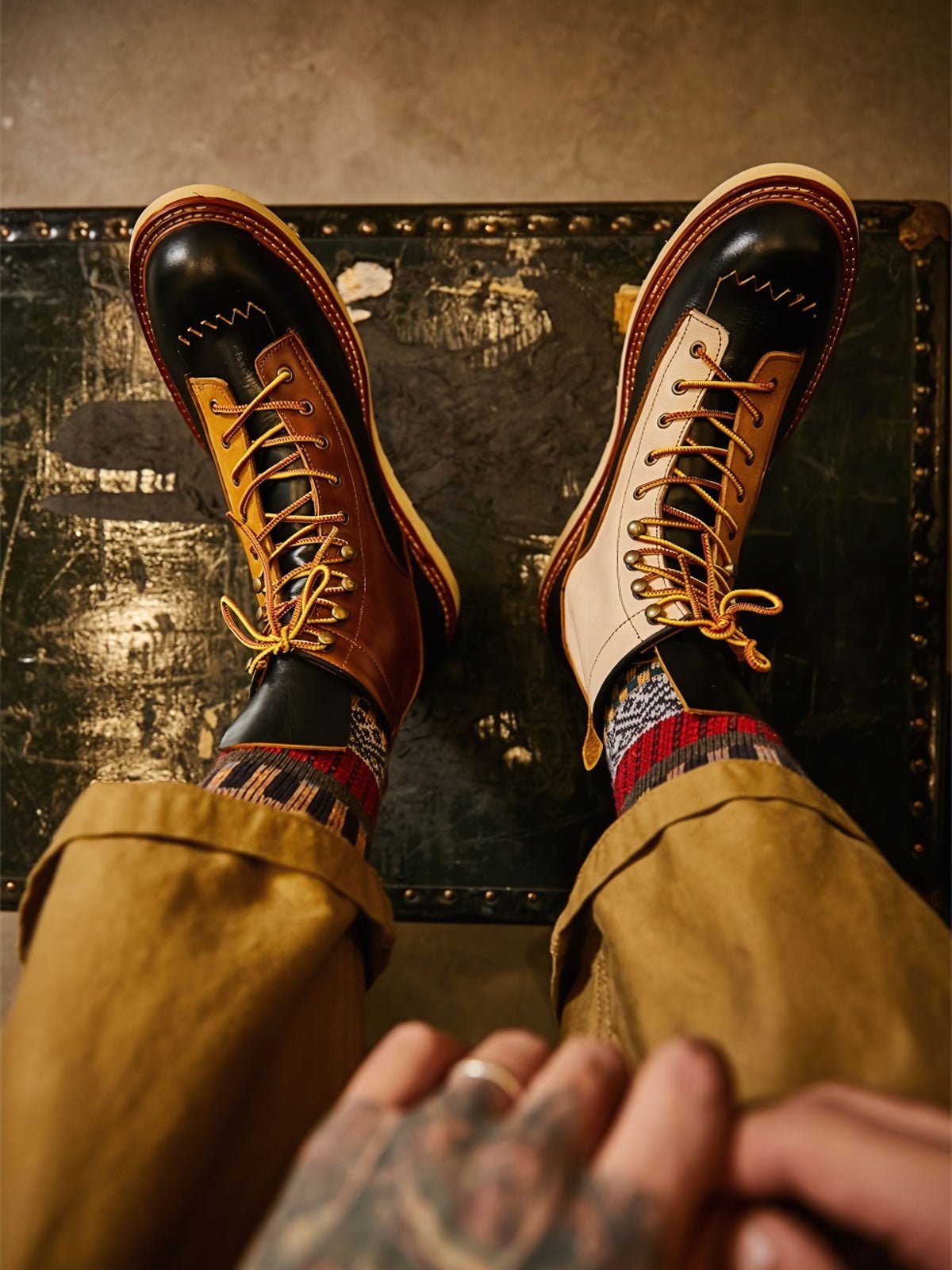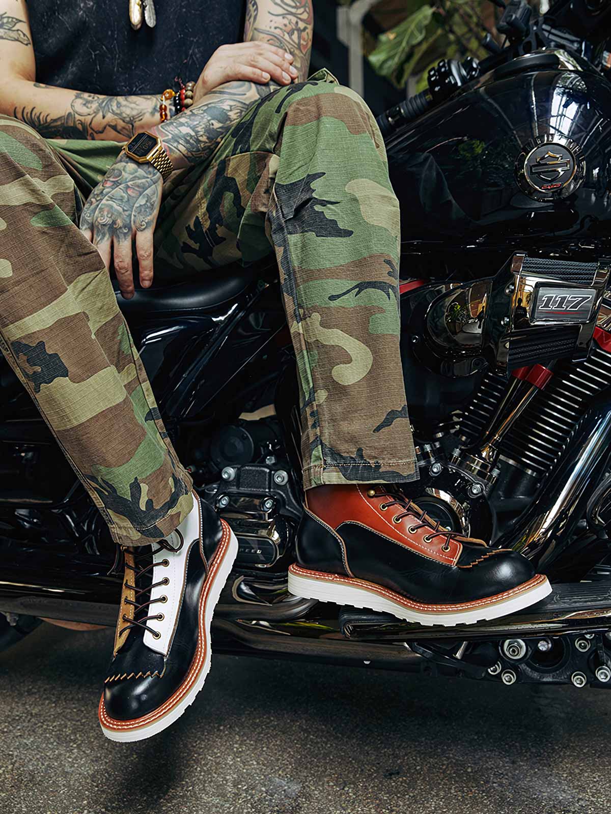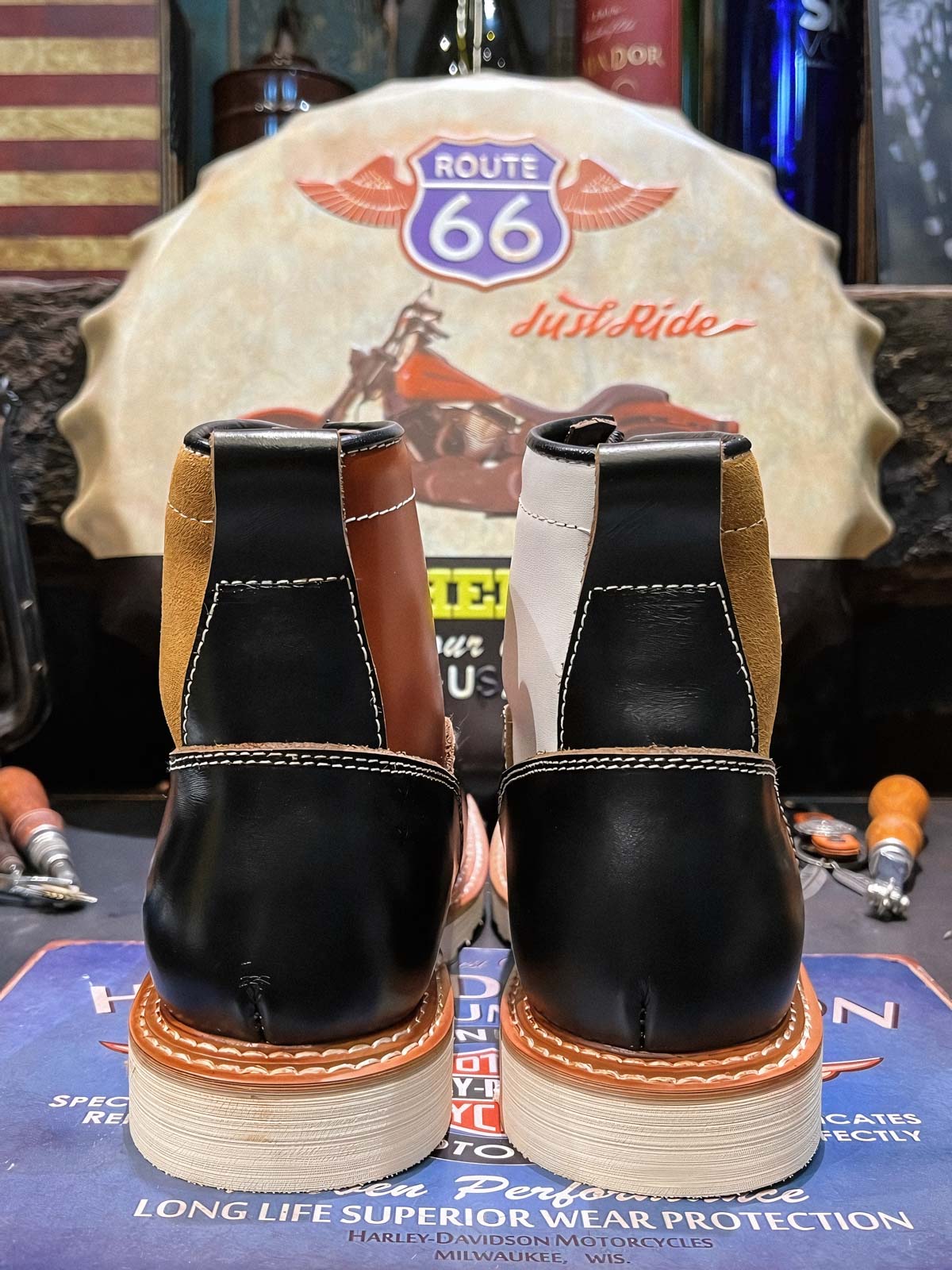 このバイカーブーツは、様々な色と素材を組み合わせたデザインで、アメリカンヴィンテージスタイルを強調しています。使用するうちに現れる黒いティーコアレザーの底色は、クラシックなモーターサイクルシューズによく見られるデザインです。履き心地と実用性を考慮して設計されたこのシューズは、最初は少し硬いかもしれませんが、時間と共に足になじんできます。