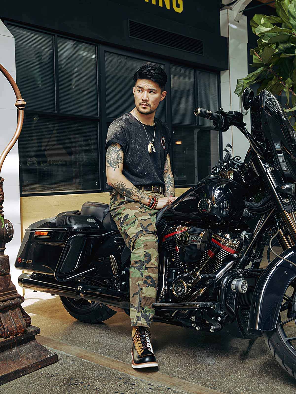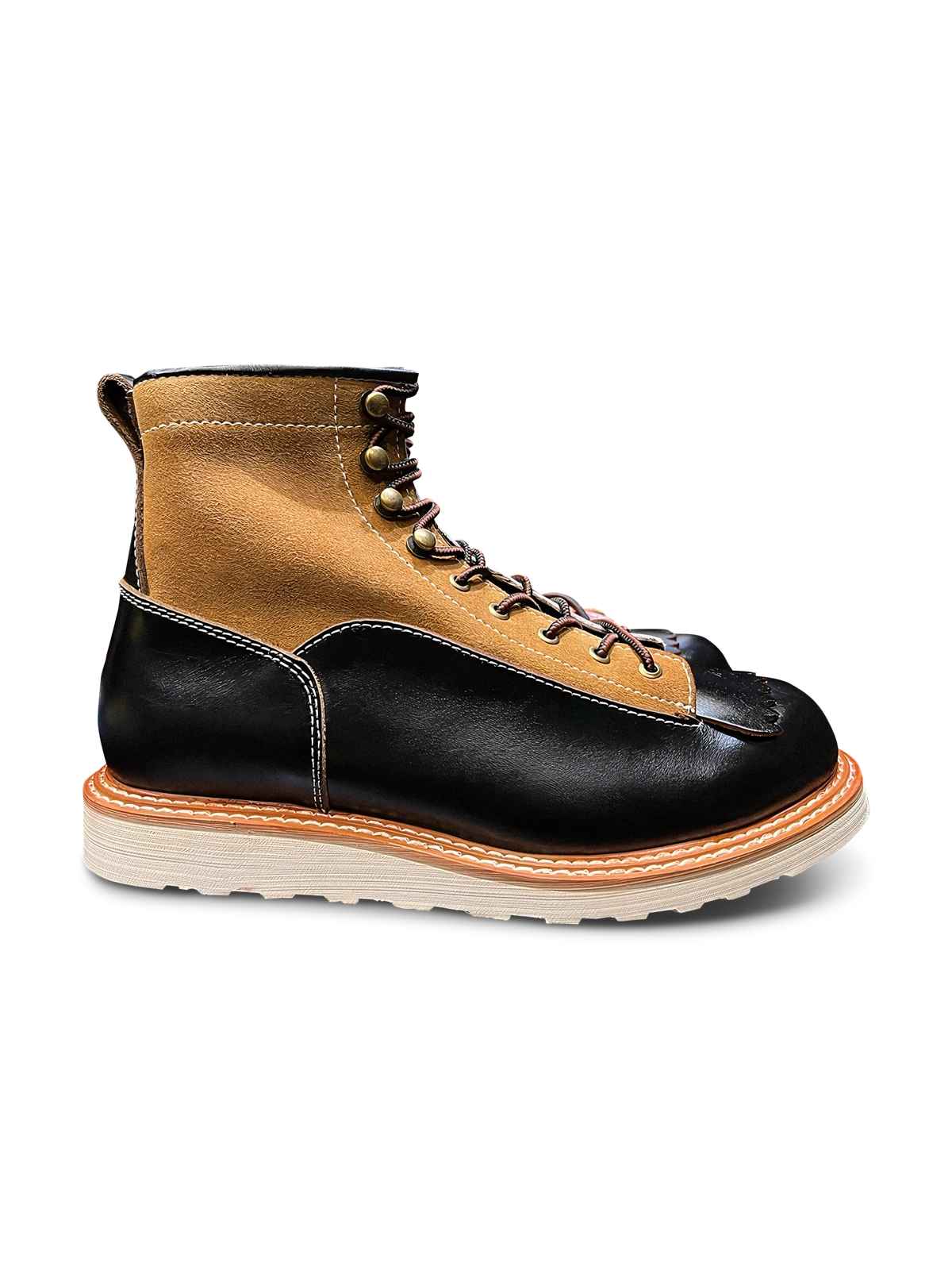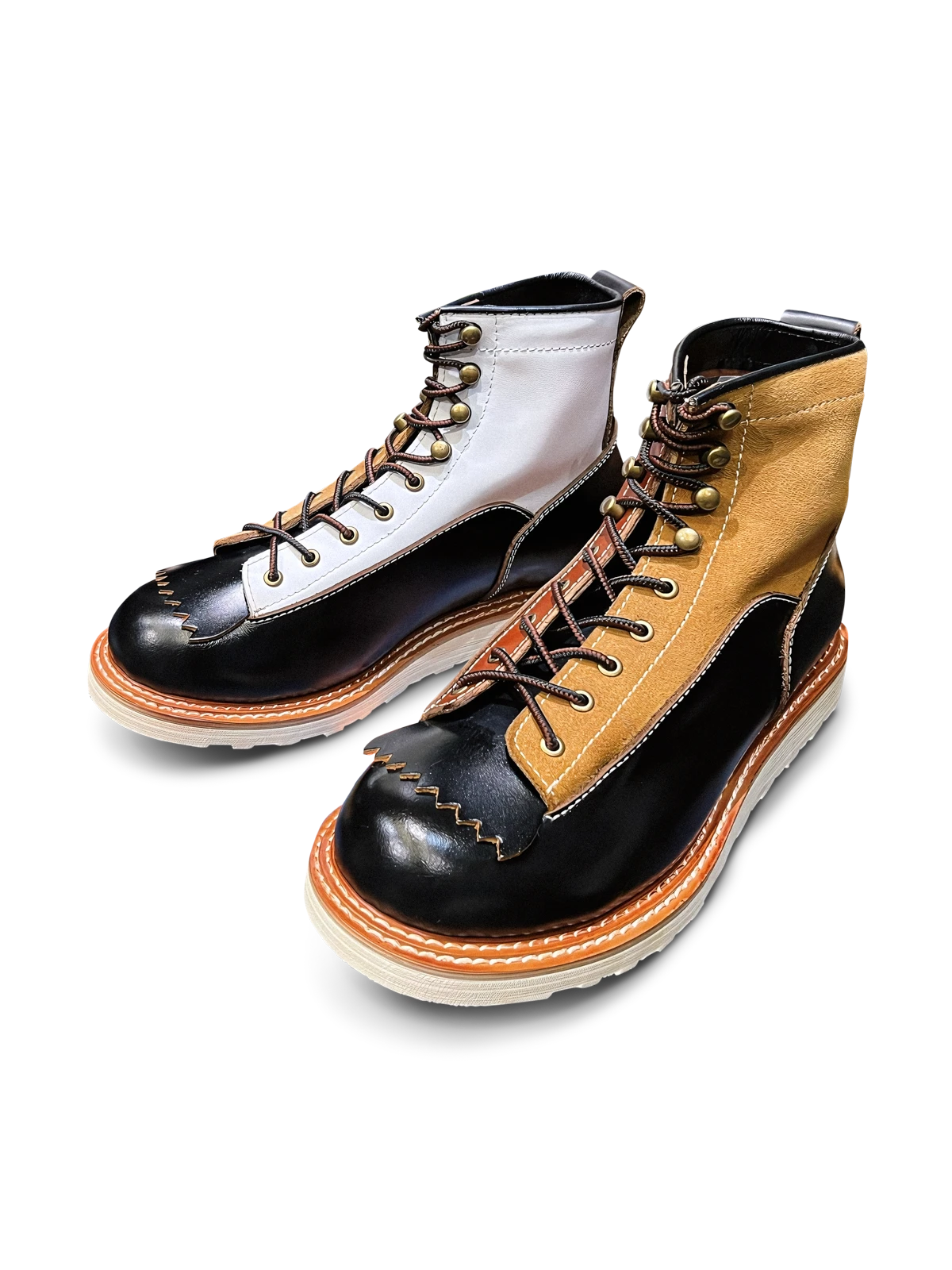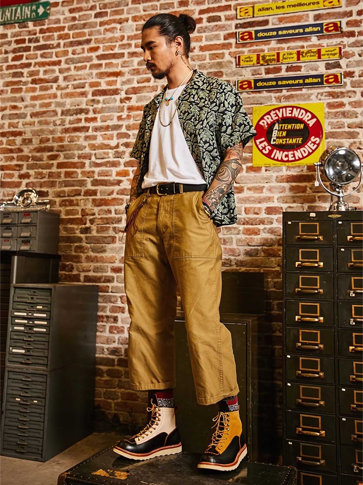 このバイカーブーツは、様々な色と素材を組み合わせたデザインで、アメリカンヴィンテージスタイルを強調しています。使用するうちに現れる黒いティーコアレザーの底色は、クラシックなモーターサイクルシューズによく見られるデザインです。履き心地と実用性を考慮して設計されたこのシューズは、最初は少し硬いかもしれませんが、時間と共に足になじんできます。