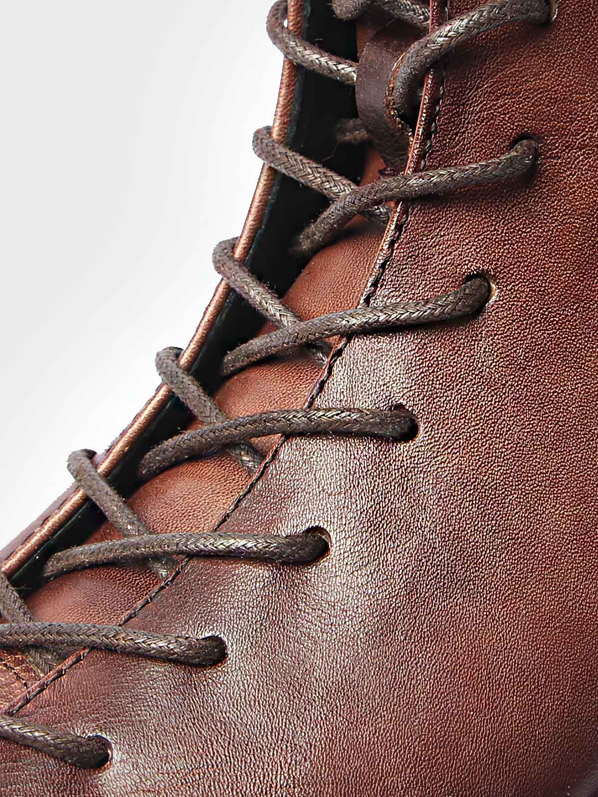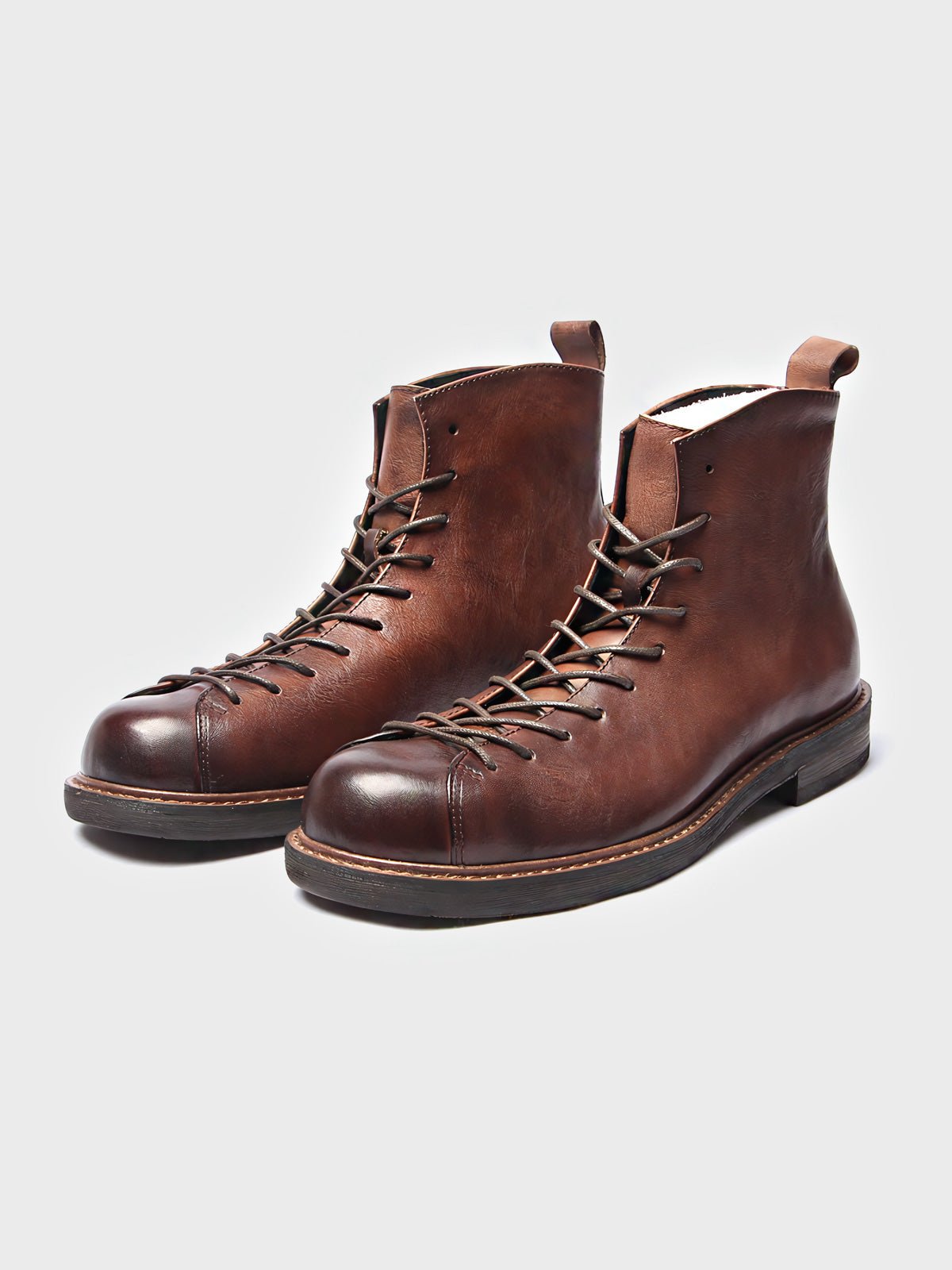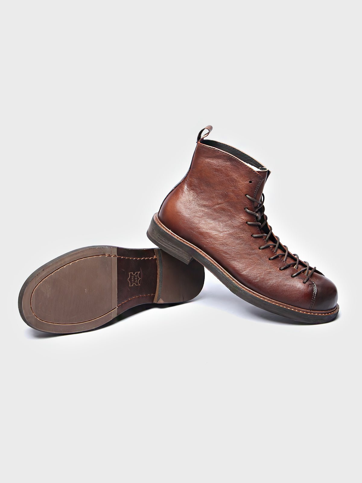 このハイカットメンズブーツは、トップグレードの牛革で作られており、独特のワックス加工により、ヴィンテージで落ち着いた雰囲気を醸し出しています。ワックス加工された革は、靴の表面に特有の光沢を与えるだけでなく、耐久性と防水性を向上させ、秋冬の湿気の多い天候に特に実用的です。内側にはトップグレードの豚革を使用しており、この素材はその柔らかさと通気性で高品質の靴作りに広く用いられています。履き心地の良さと良好な内部環境を足に提供します。インソールにもトップグレードの牛革を使用し、足の接触部分の快適性と耐久性をさらに確保しています。