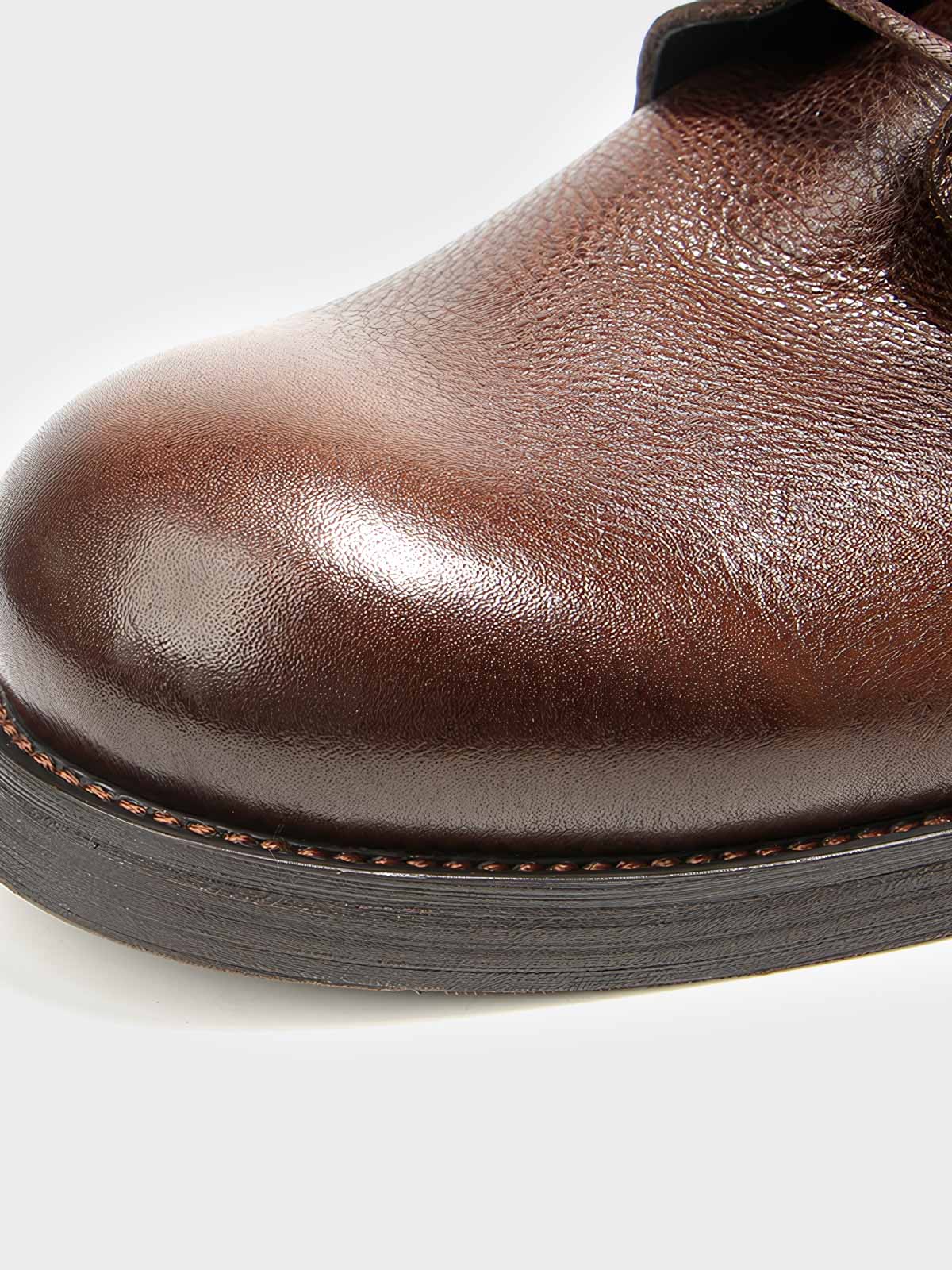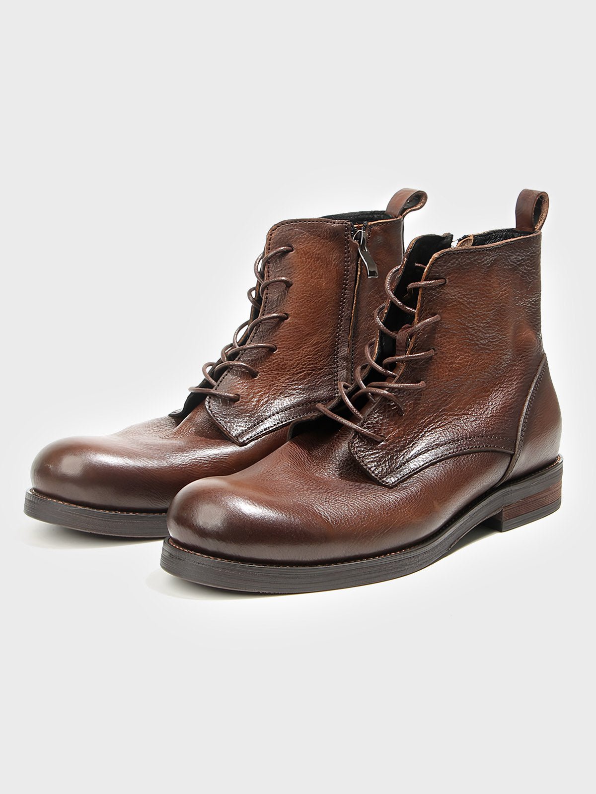 選ばれたトップグレインの牛革は丁寧に選ばれ、手作業でのエイジング加工により、靴の色合いと質感にユニークな変化をもたらします。内側のジッパーは着脱の便利さを提供するだけでなく、ファッションの一要素としても機能します。