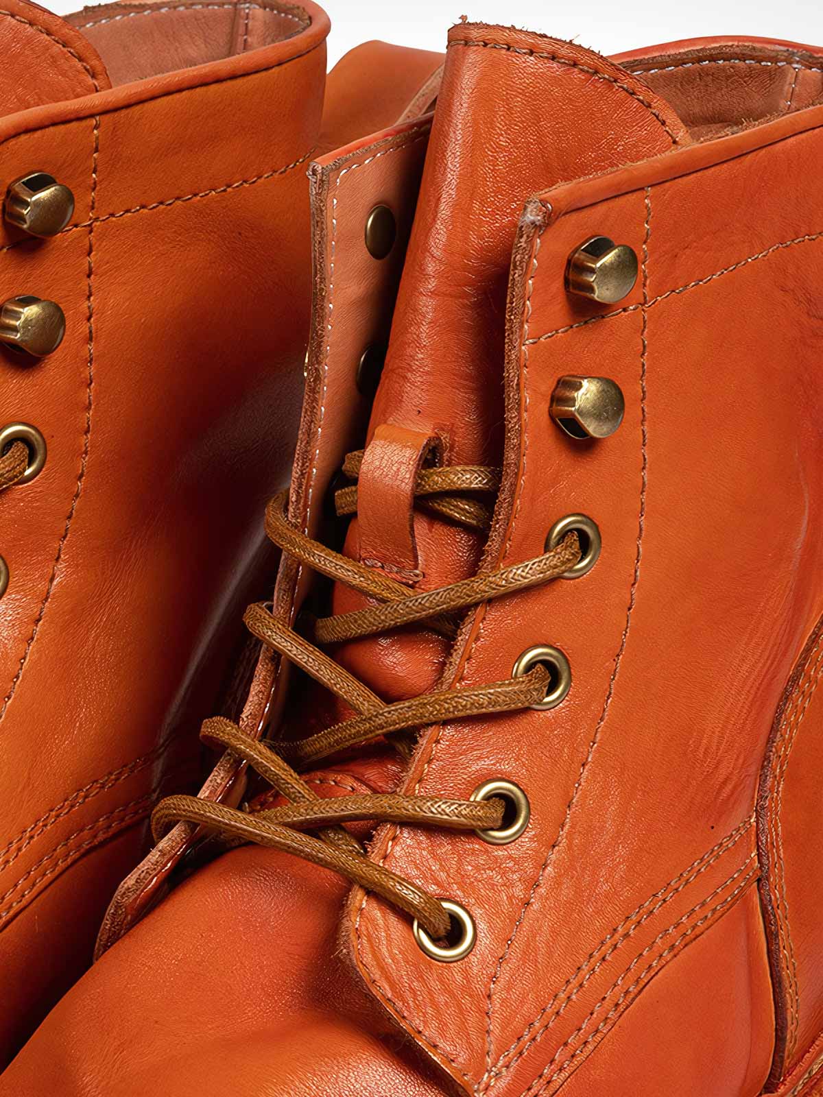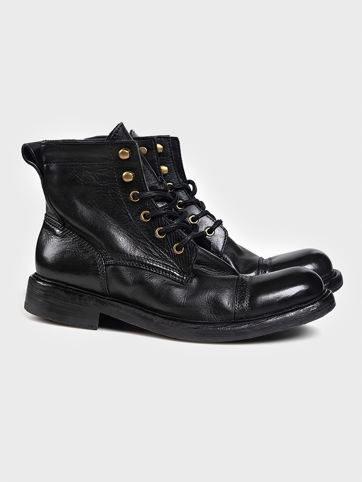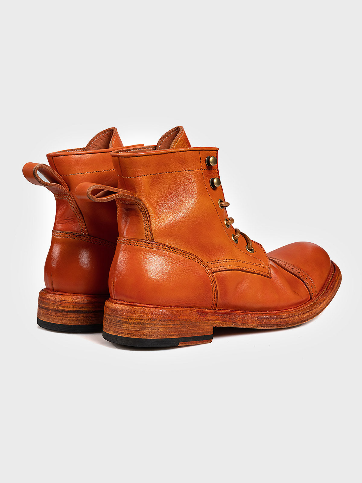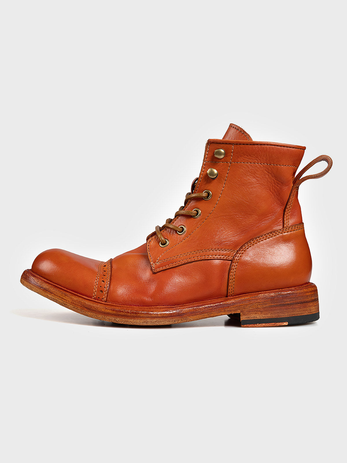 この牛革ブーツは、19世紀末から20世紀初頭の工業革命時代の労働者のブーツデザインを踏襲しています。クラシックな牛革ブーツデザインと丁寧に磨かれた木型は、長時間の着用に快適さを保証します。厳選された一枚牛革は、外観上、時間の経過と共に豊かな色合いを示すだけでなく、自然な弾力性も足に良好なサポートと快適な包み込み感を提供します。