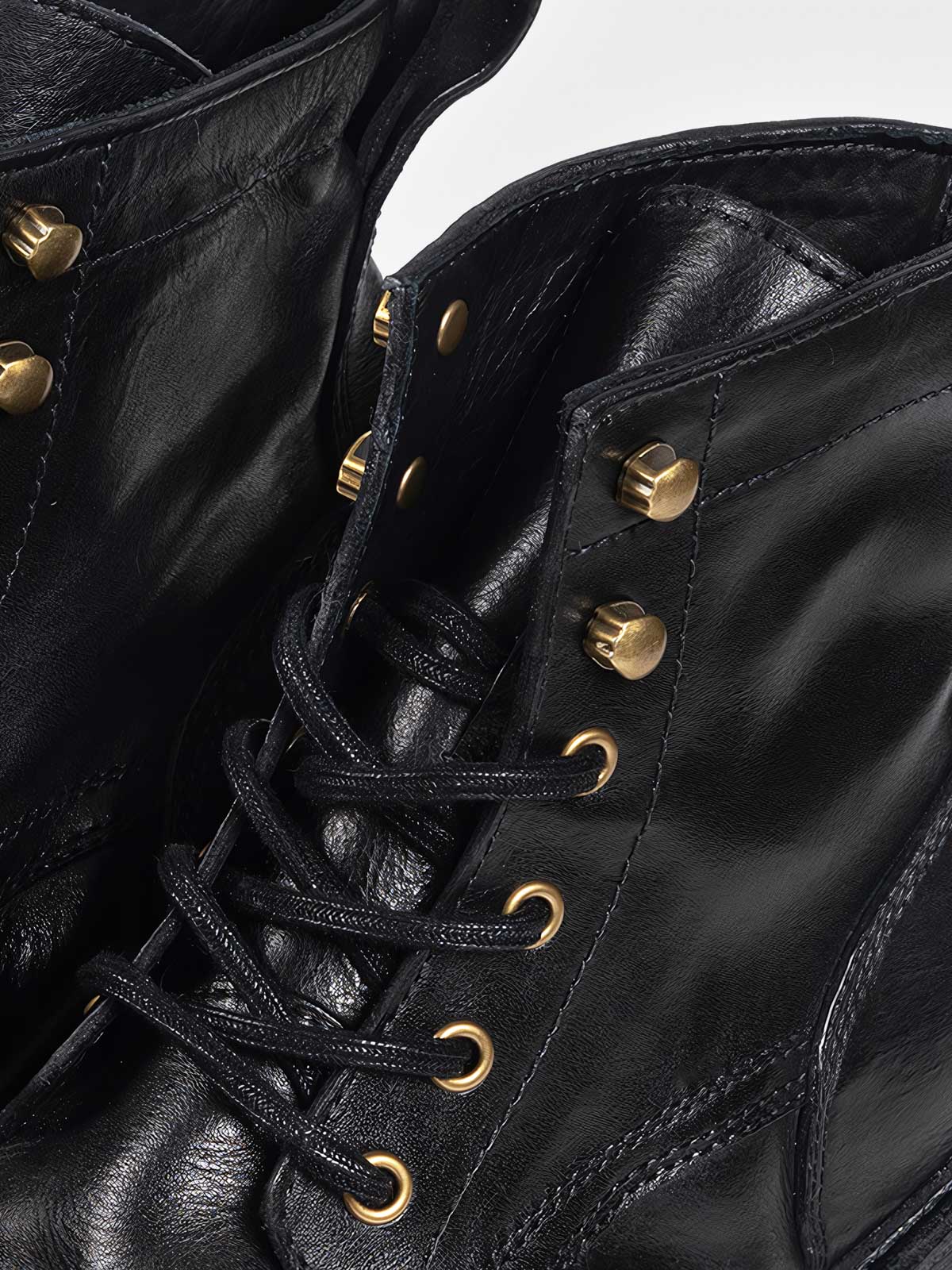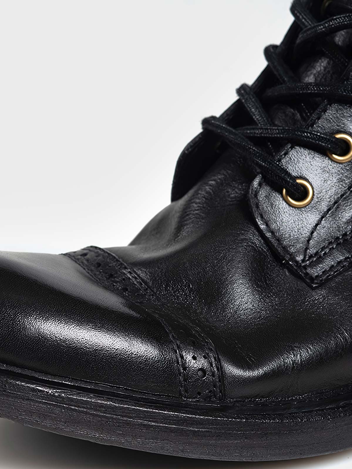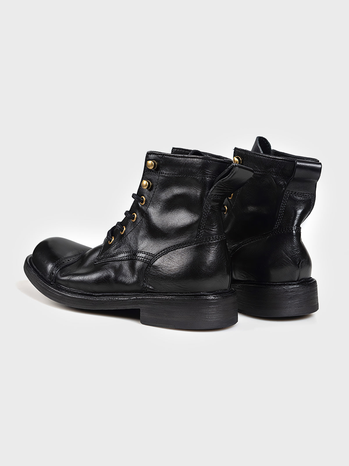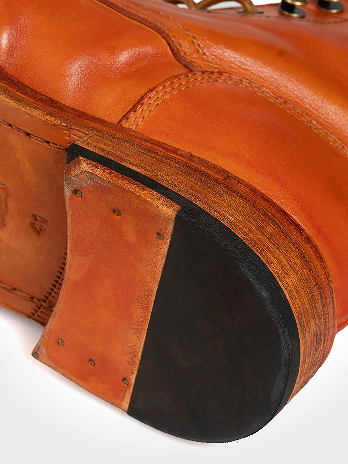 この牛革ブーツは、19世紀末から20世紀初頭の工業革命時代の労働者のブーツデザインを踏襲しています。クラシックな牛革ブーツデザインと丁寧に磨かれた木型は、長時間の着用に快適さを保証します。厳選された一枚牛革は、外観上、時間の経過と共に豊かな色合いを示すだけでなく、自然な弾力性も足に良好なサポートと快適な包み込み感を提供します。