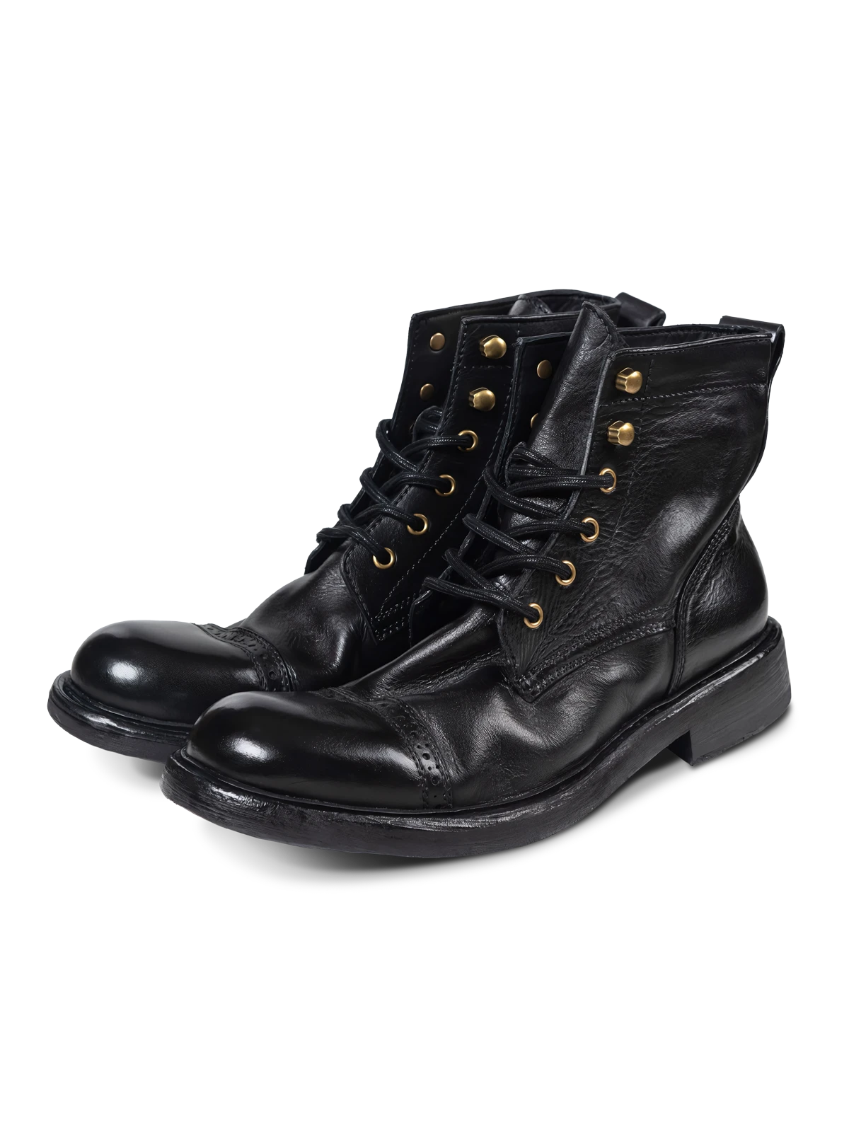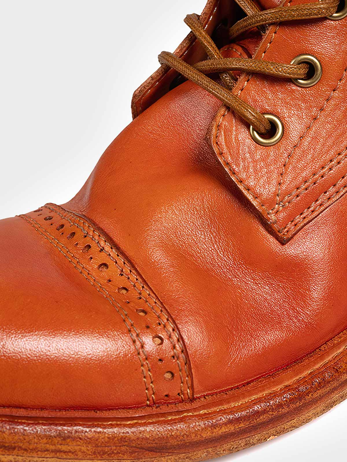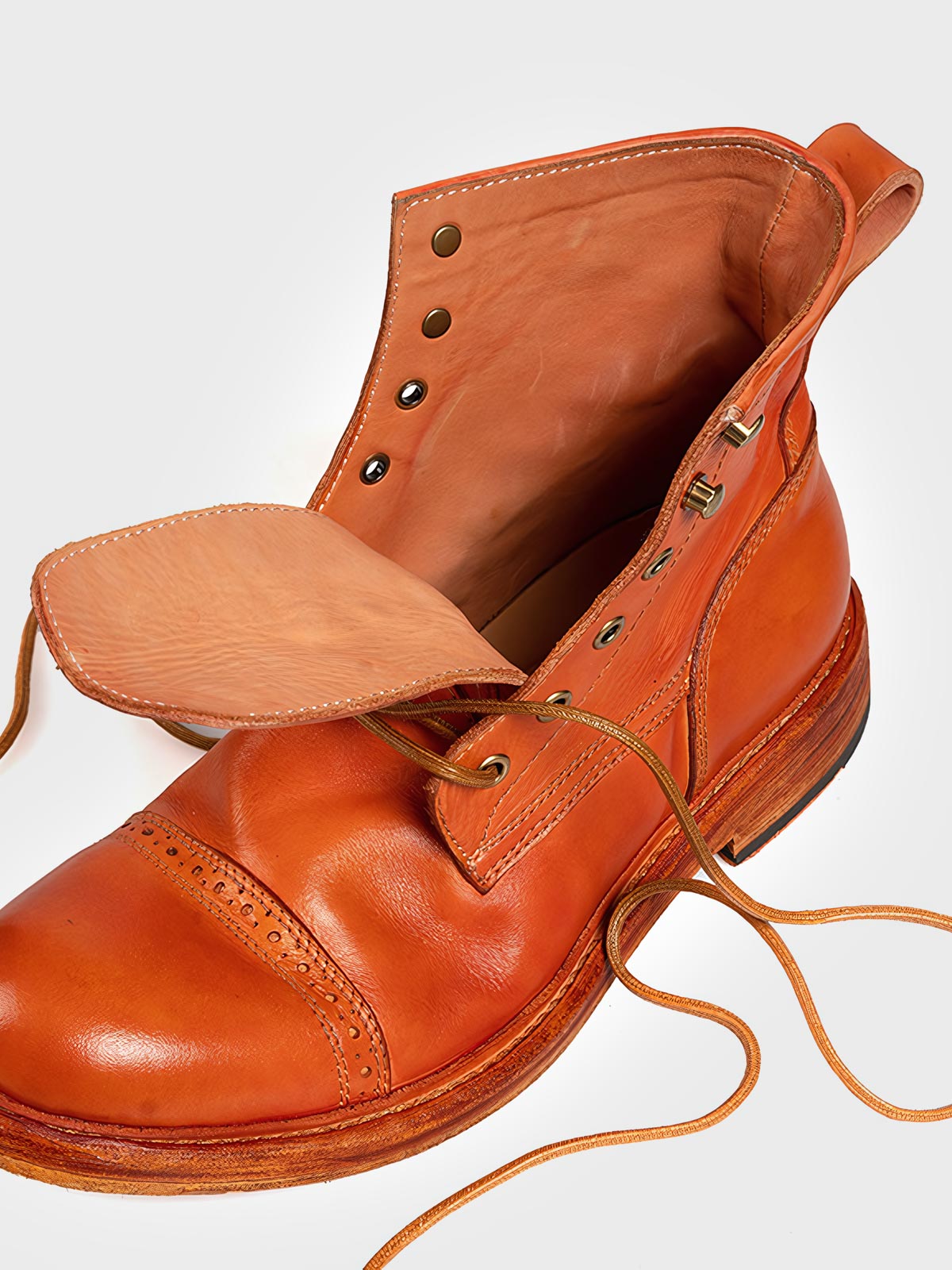 使用されている一枚牛革素材は、自然なテクスチャーと暖かみのある色合いを示し、着用が増えると皮革は徐々に独特の個性を示します。銅色の金属バックルと耐久性のある靴紐はレトロな感触を加え、手縫いの靴底は卓越した職人技を示します。