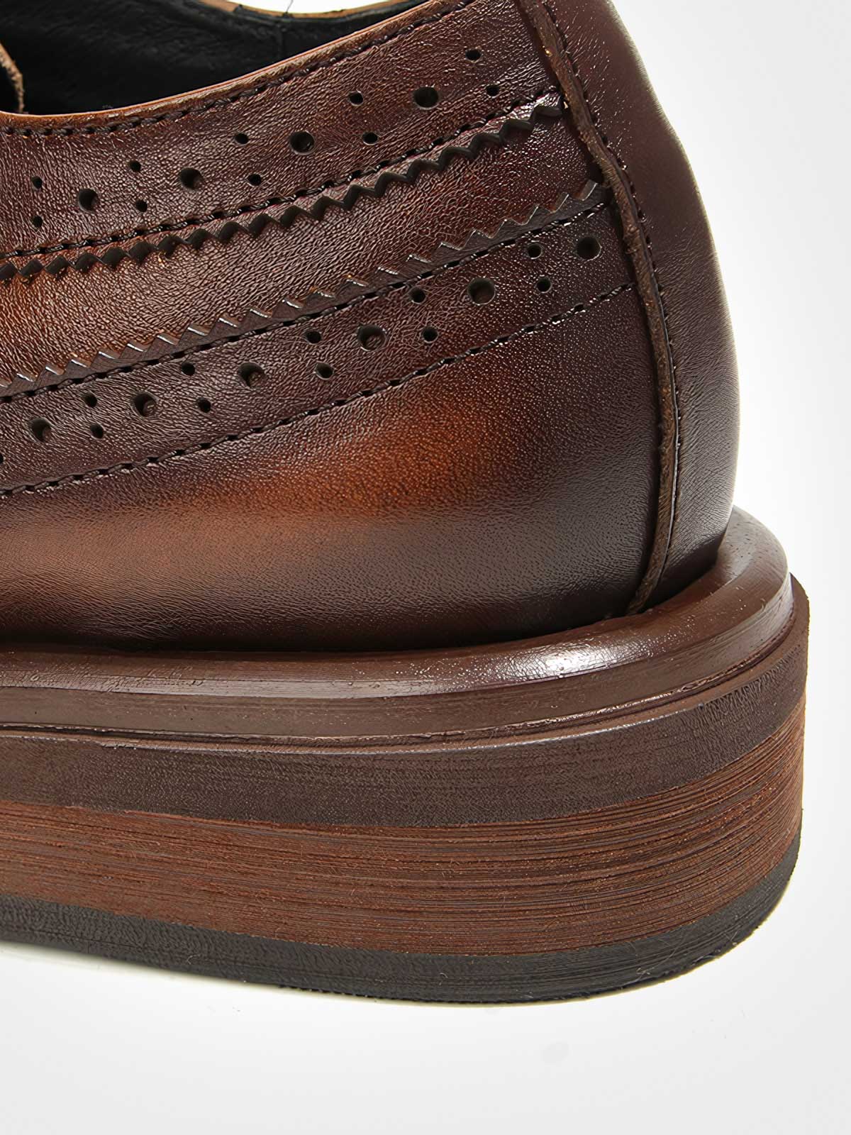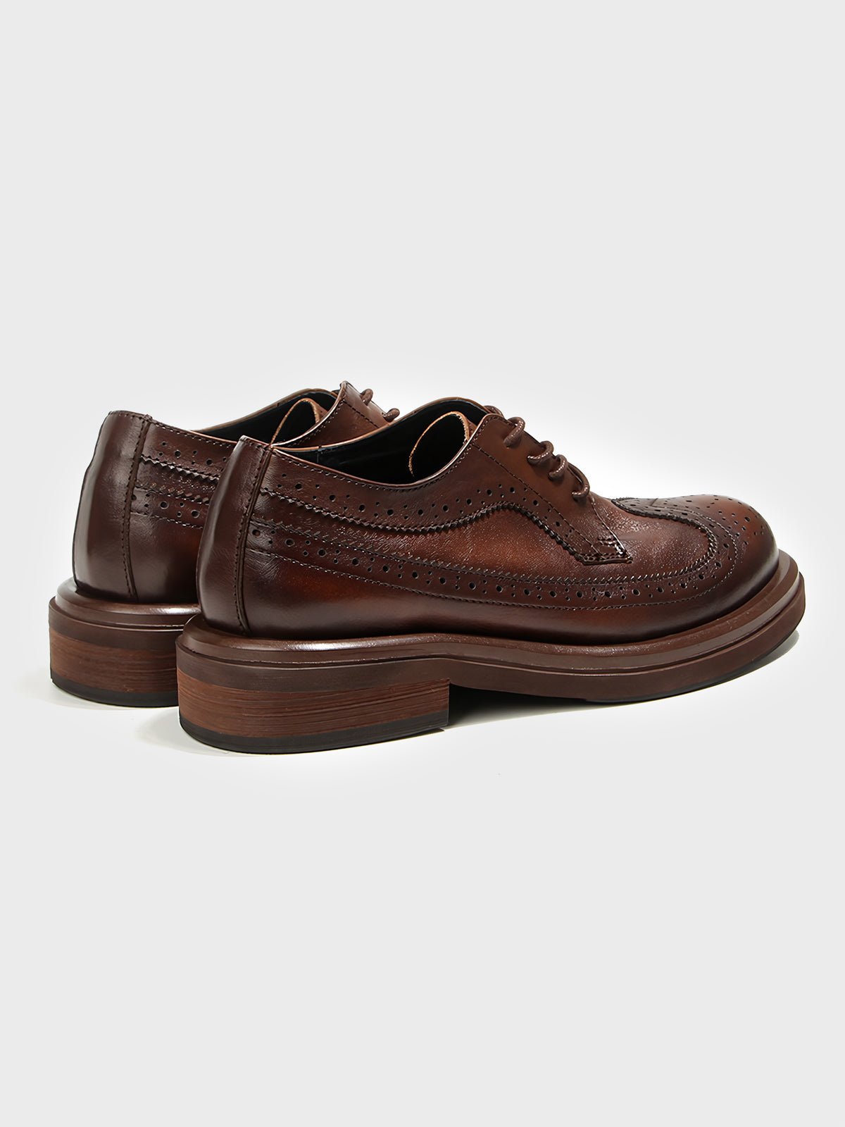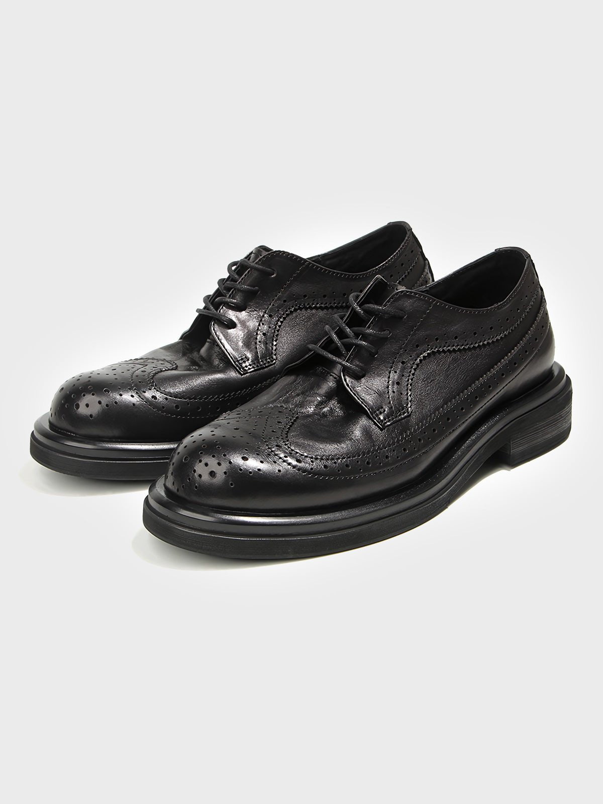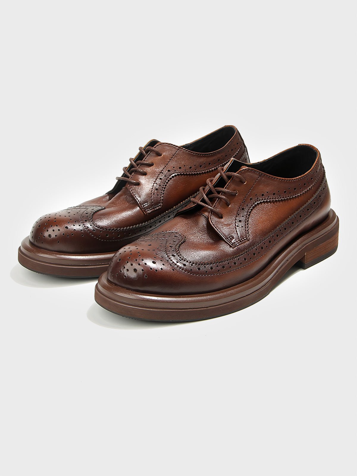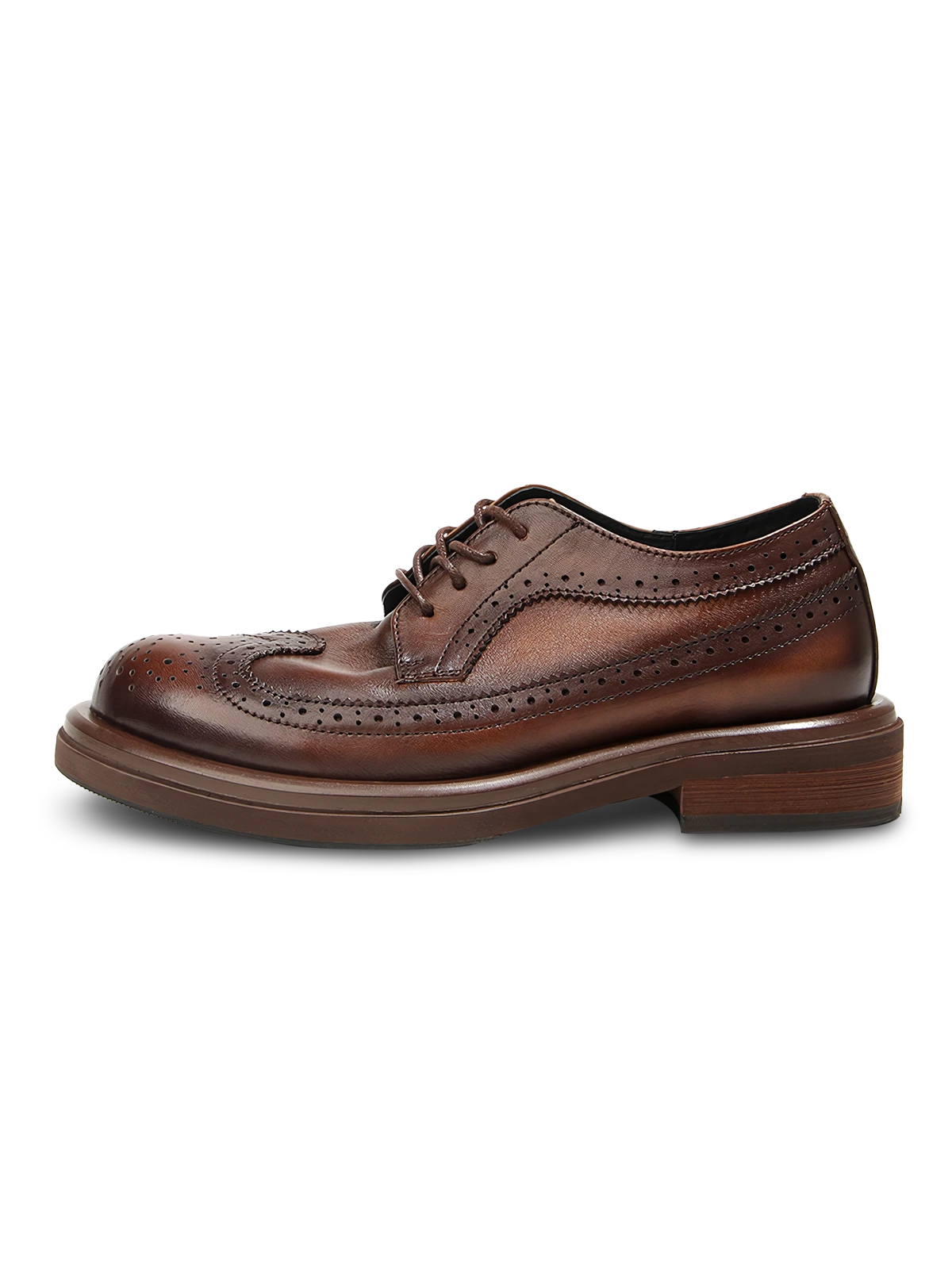 靴面に使用される一枚牛革は、レジンレザー・ラブ色加工を施すことで、さらに質感と耐久性を高めています。ブローグ式の精緻な彫刻は、シューズに装飾性を加えるだけでなく、高度な技術をも示しています。靴底にはEVA素材とラバーソールを組み合わせており、本木製のヒールが安定性と耐久性を強化しています。この組み合わせの底は、クラシックなシューズの美しさを保ちつつ、現代のシューズの快適性も考慮しています。