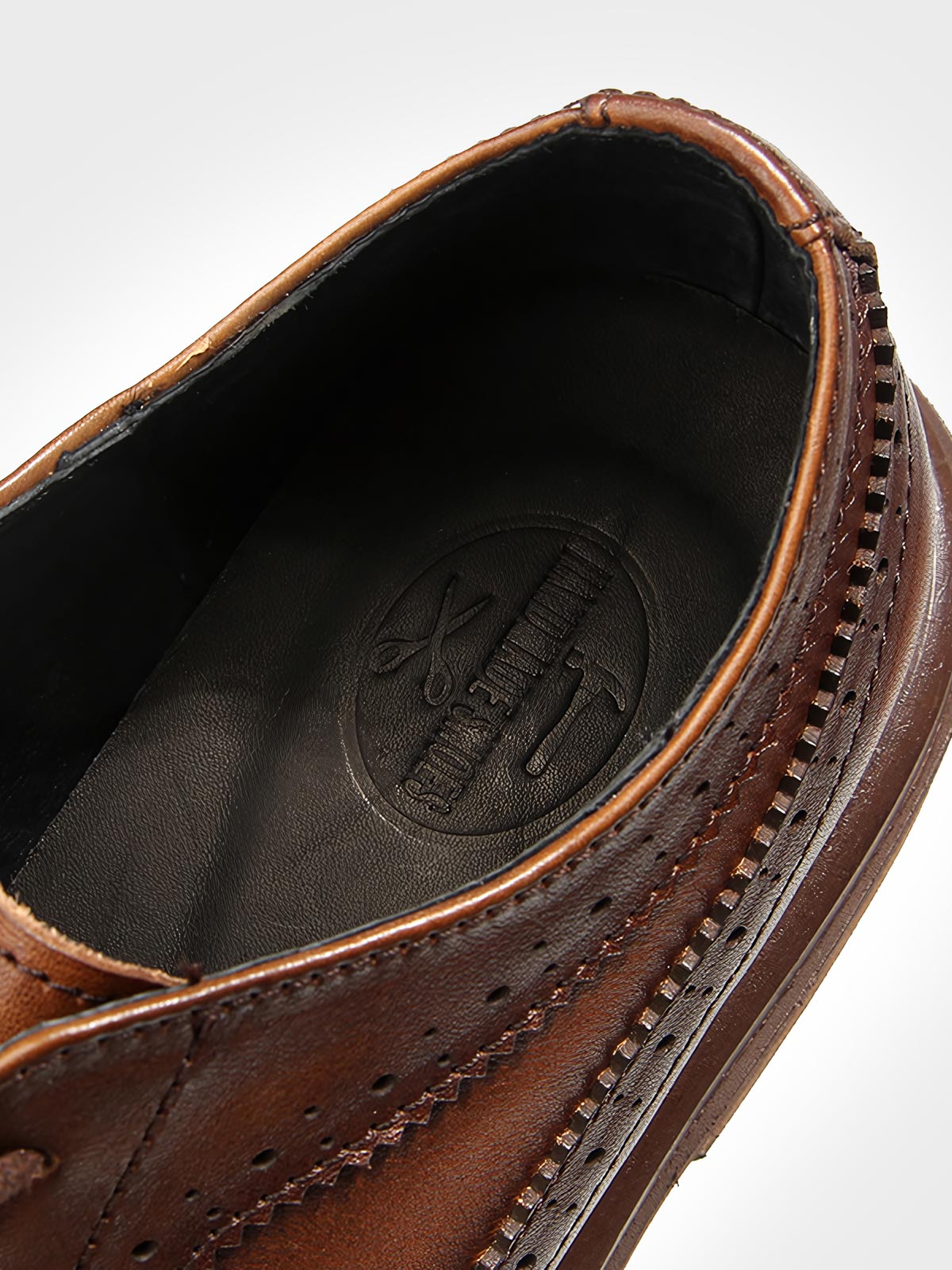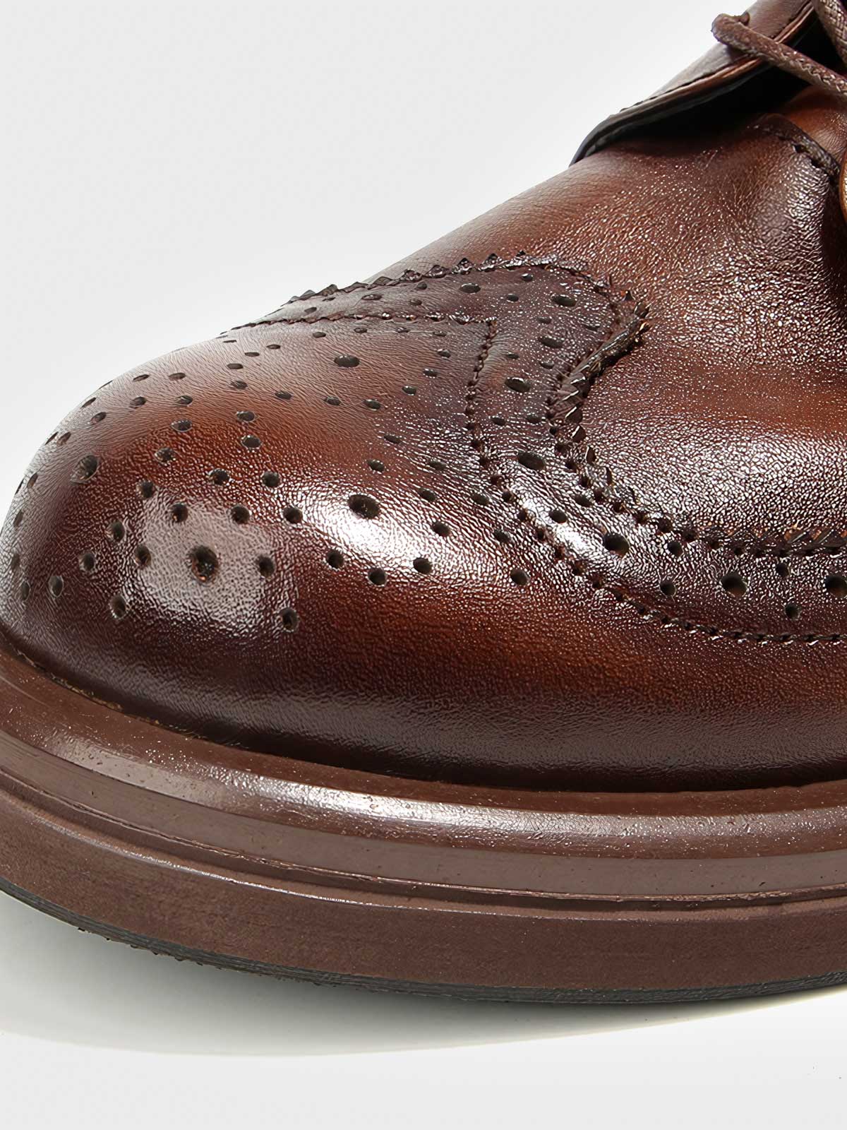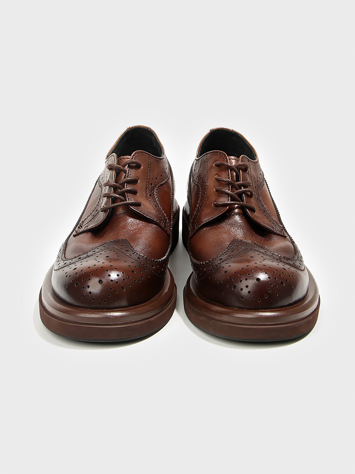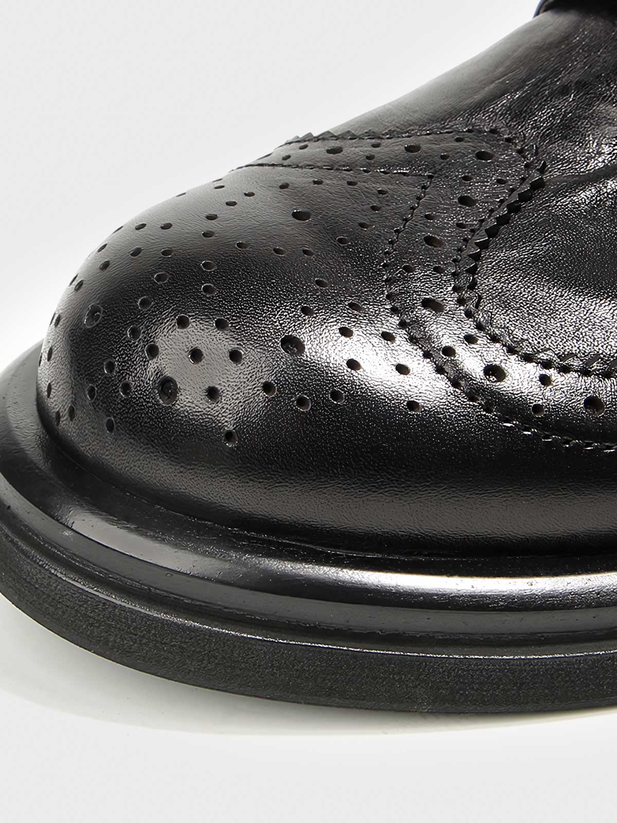 靴面に使用される一枚牛革は、レジンレザー・ラブ色加工を施すことで、さらに質感と耐久性を高めています。ブローグ式の精緻な彫刻は、シューズに装飾性を加えるだけでなく、高度な技術をも示しています。靴底にはEVA素材とラバーソールを組み合わせており、本木製のヒールが安定性と耐久性を強化しています。この組み合わせの底は、クラシックなシューズの美しさを保ちつつ、現代のシューズの快適性も考慮しています。