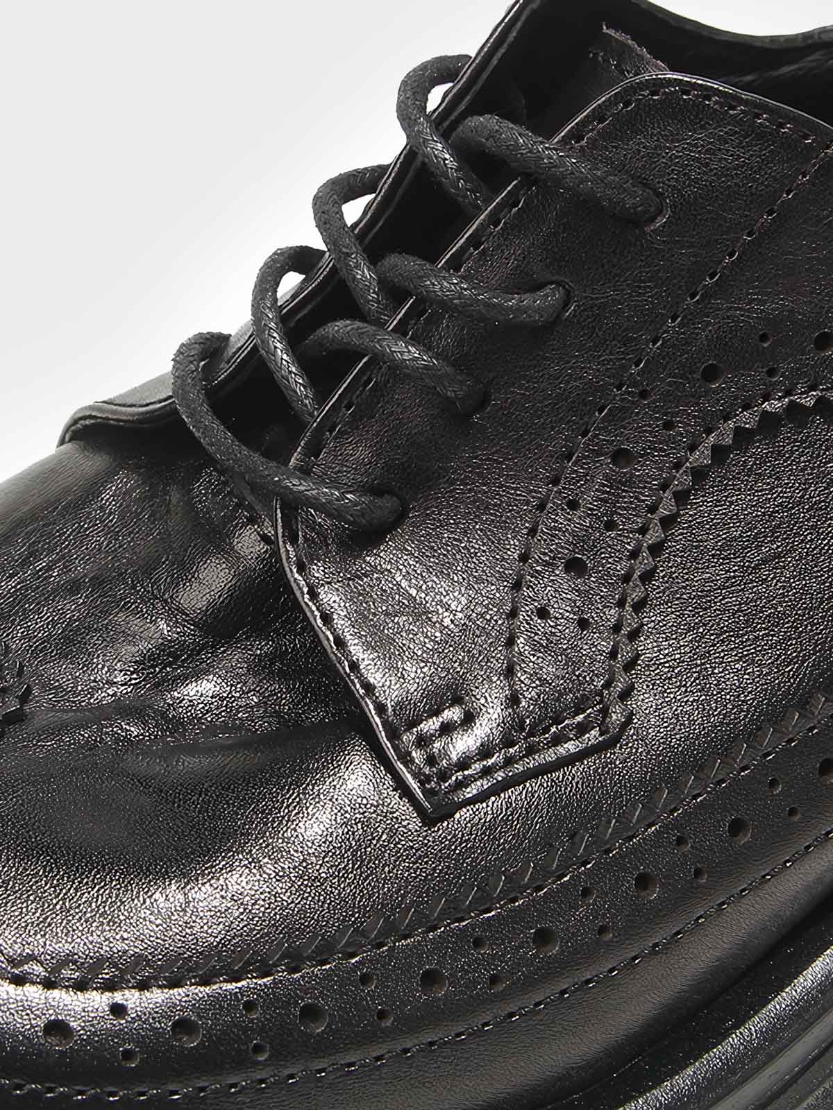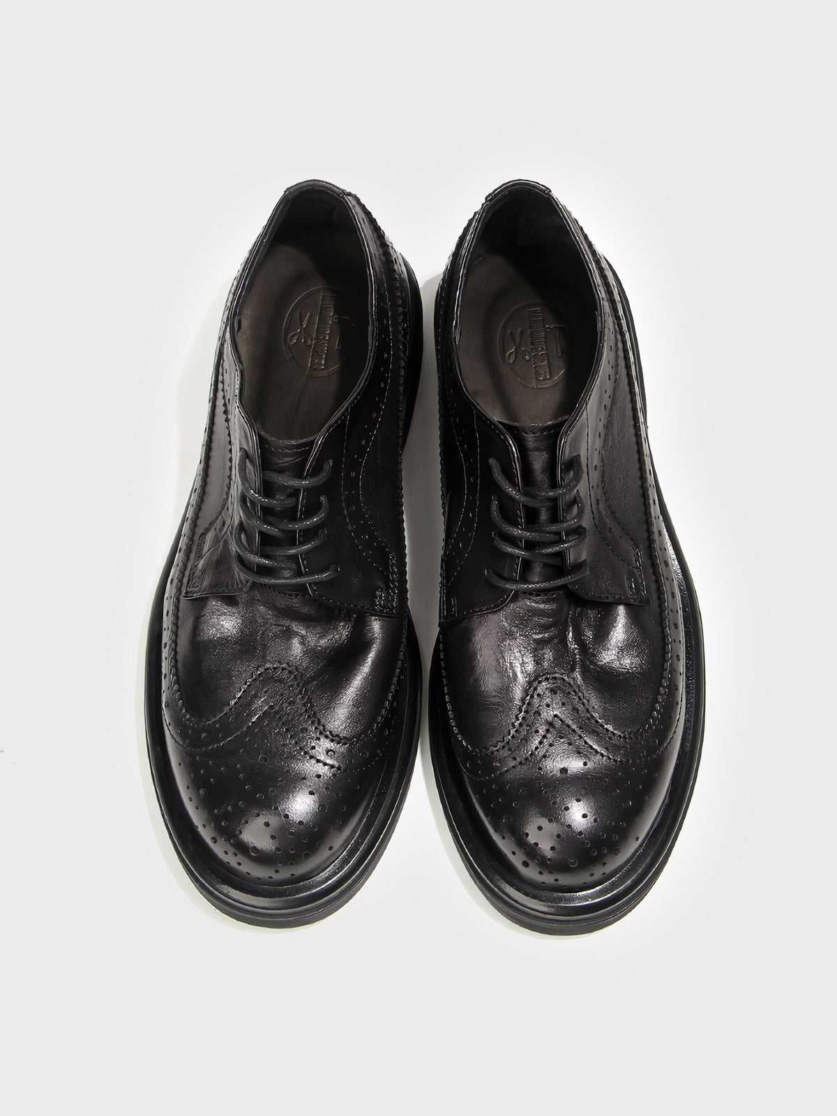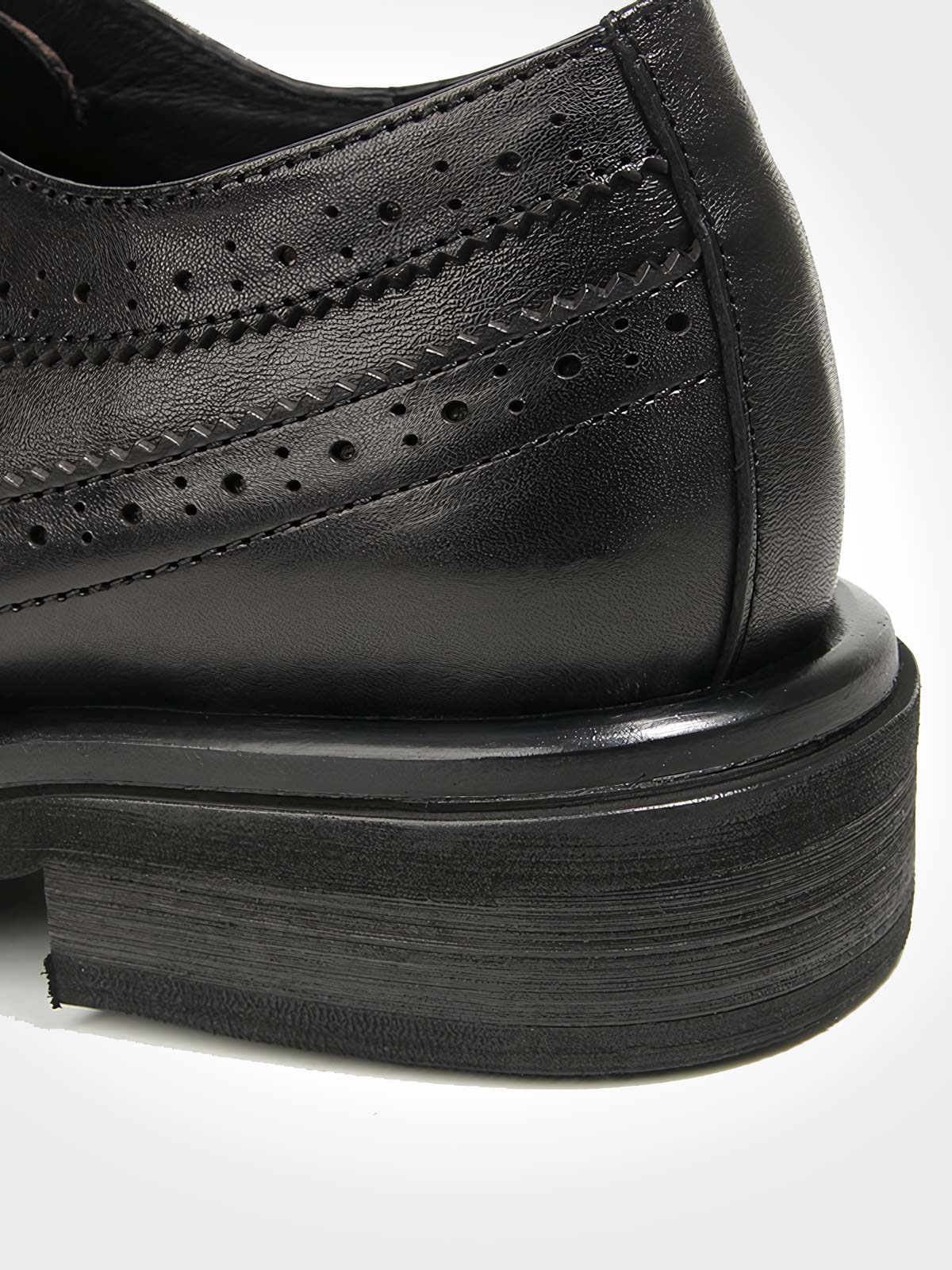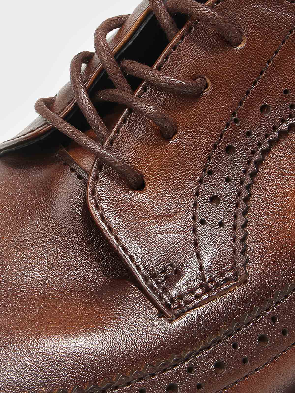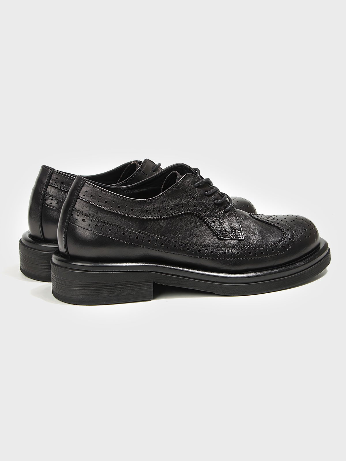 靴面に使用される一枚牛革は、レジンレザー・ラブ色加工を施すことで、さらに質感と耐久性を高めています。ブローグ式の精緻な彫刻は、シューズに装飾性を加えるだけでなく、高度な技術をも示しています。靴底にはEVA素材とラバーソールを組み合わせており、本木製のヒールが安定性と耐久性を強化しています。この組み合わせの底は、クラシックなシューズの美しさを保ちつつ、現代のシューズの快適性も考慮しています。