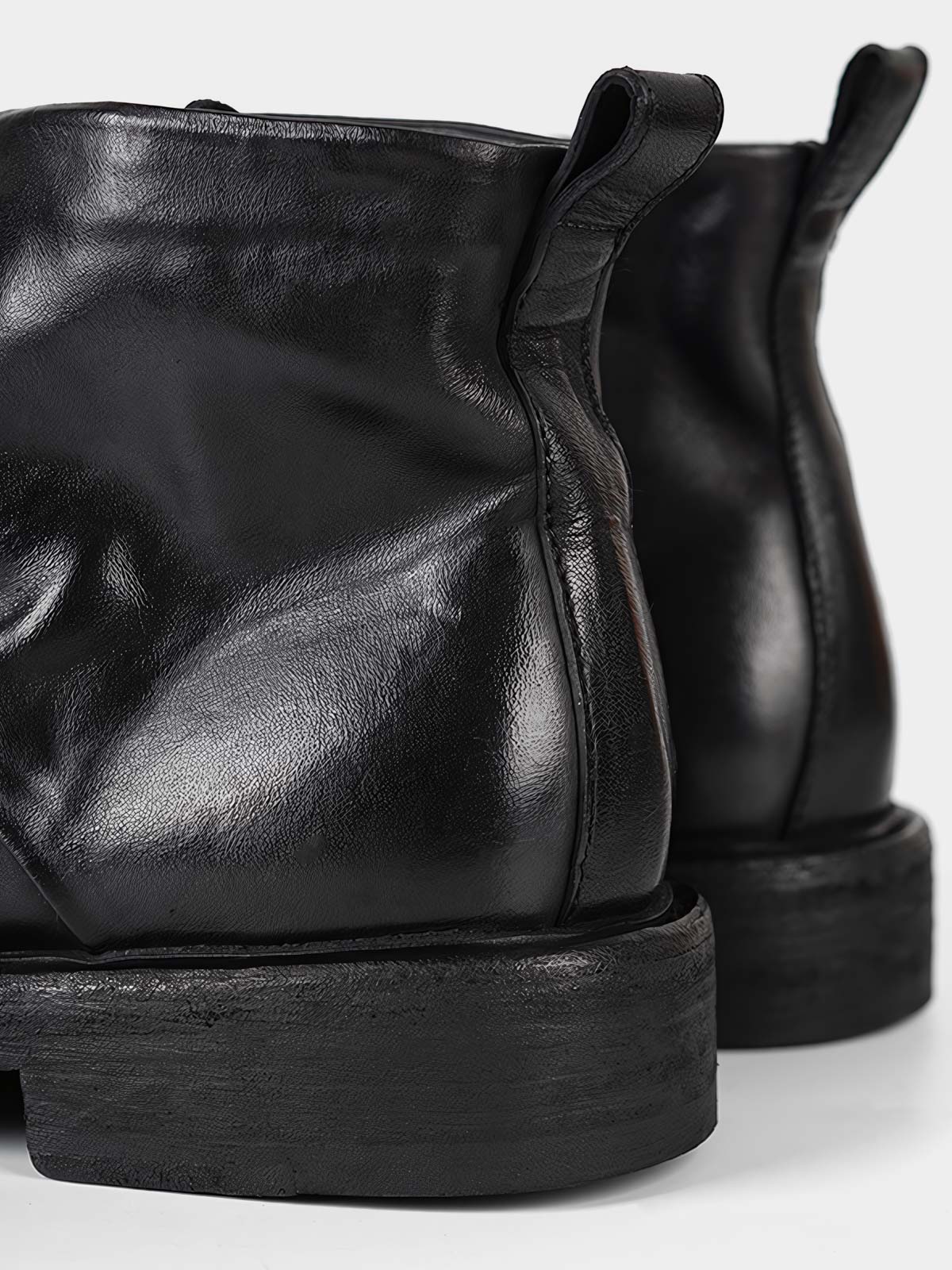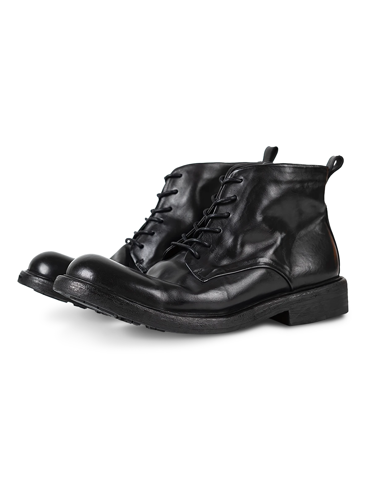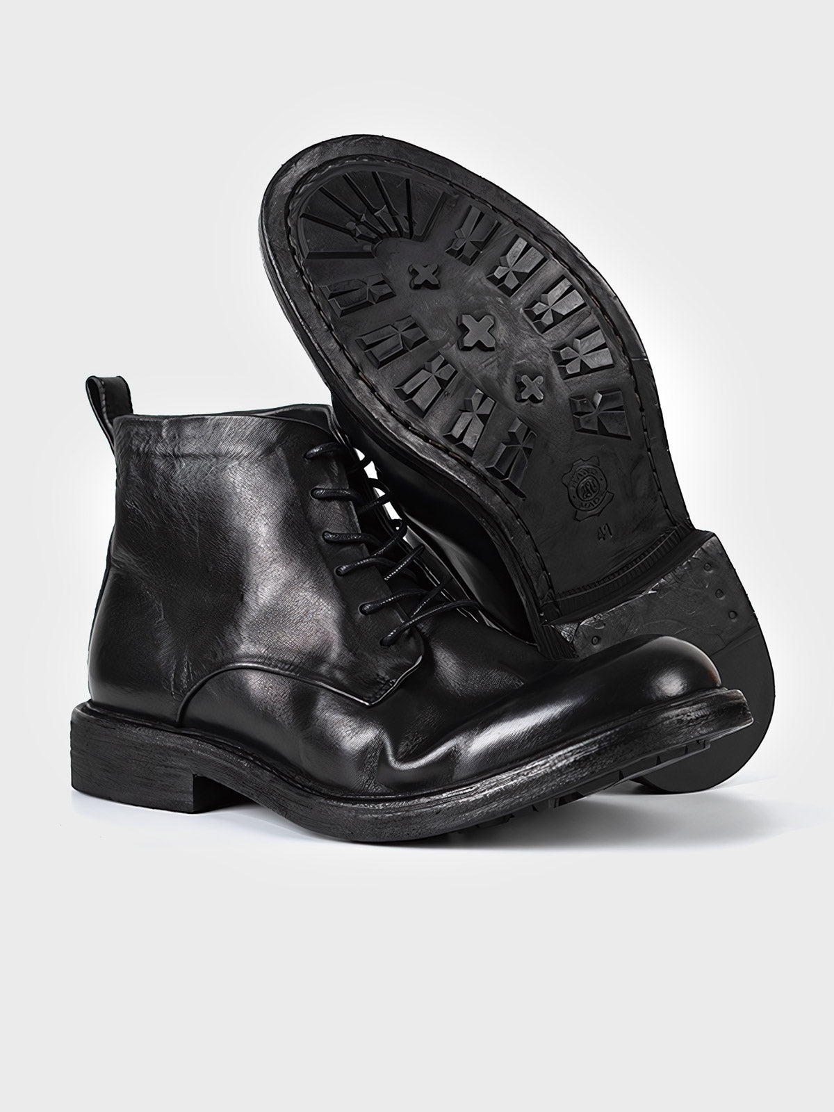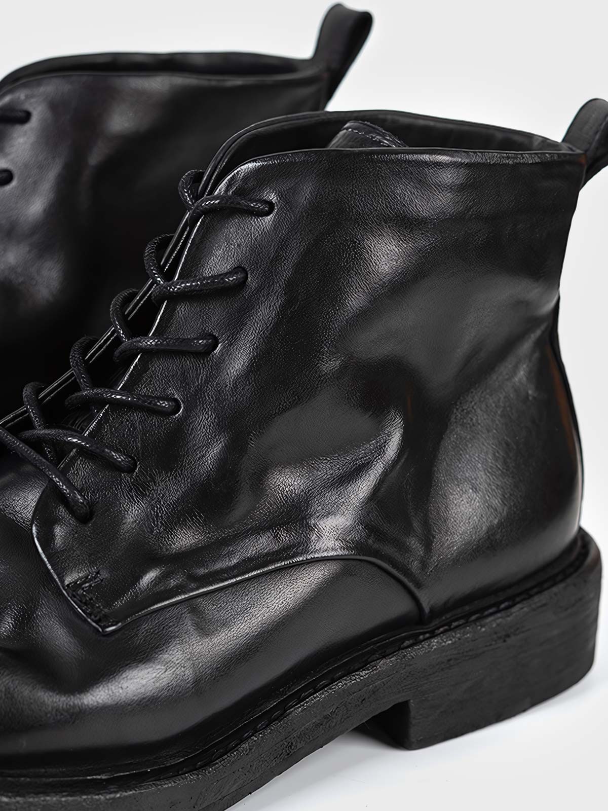 使用されるトップグレインレザーは、慎重に選択され処理され、天然革の質感と耐久性を保持しています。手作りのプロセスは、各工程の精密さを保証し、各ペアのブーツはユニークな工芸品です。ブラックレザーとクラシックなレースアップデザインは、このブーツに永遠のスタイルを与えています。