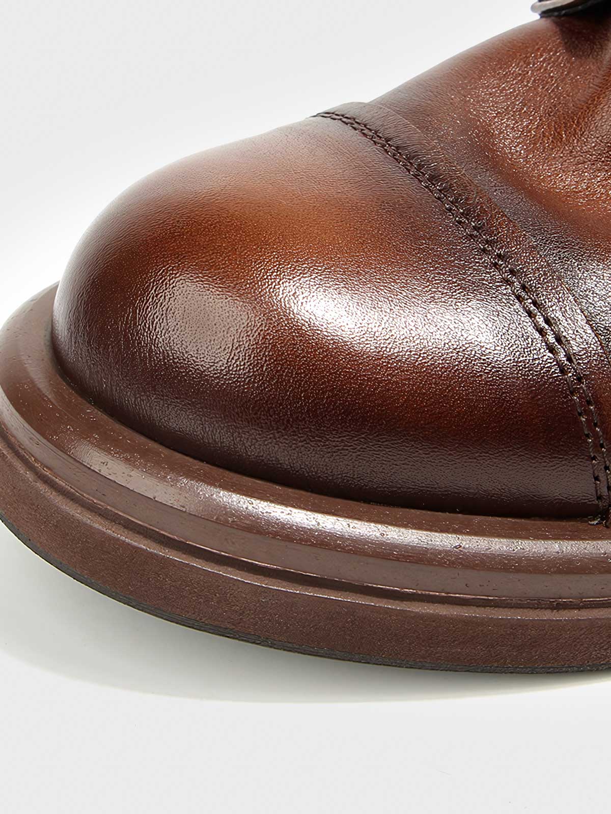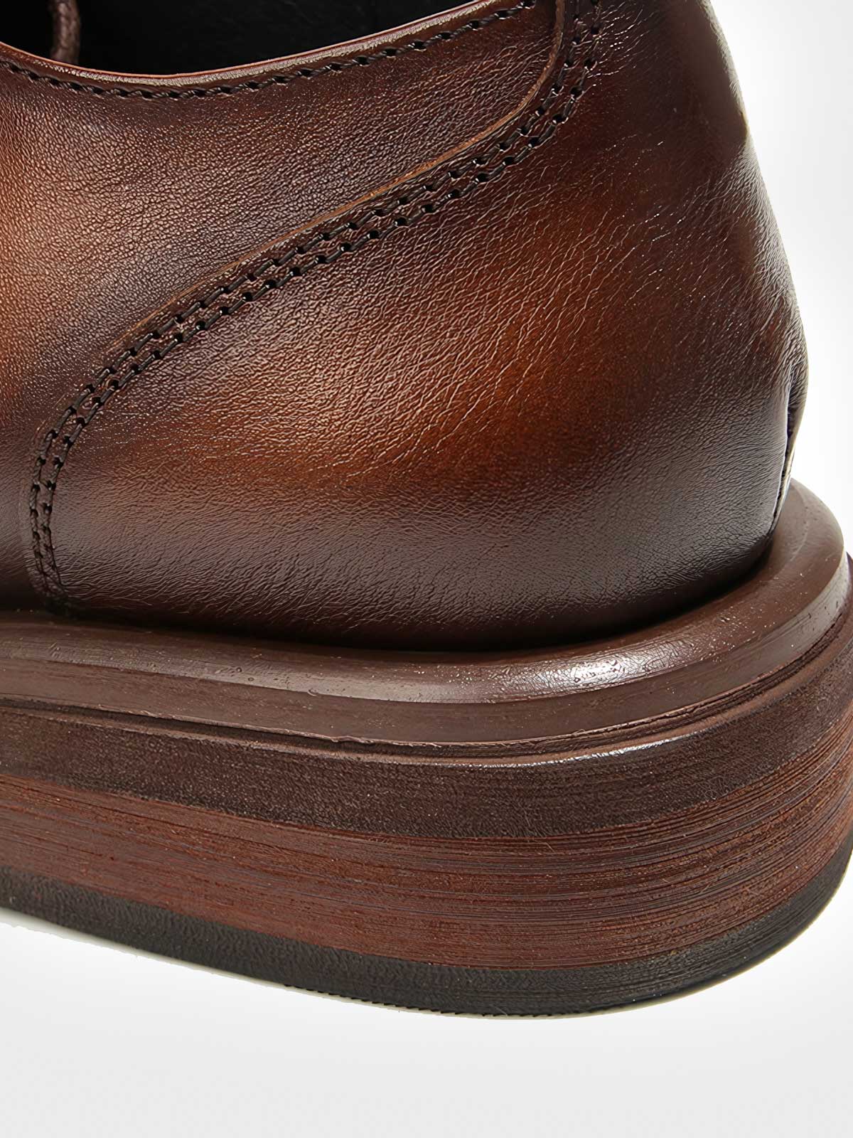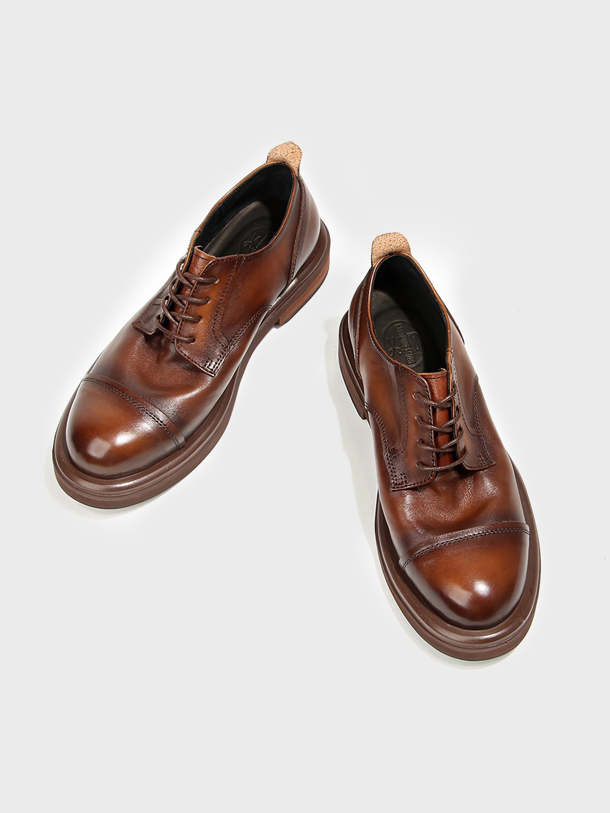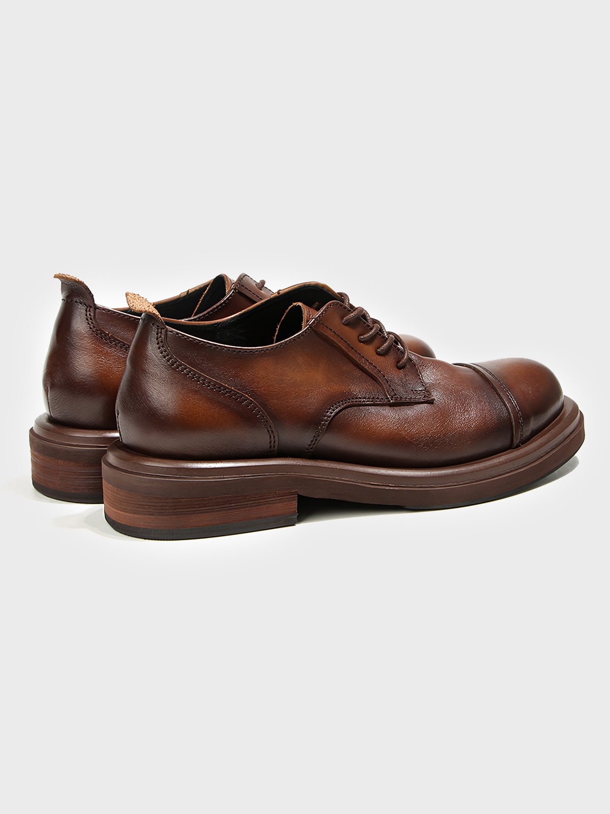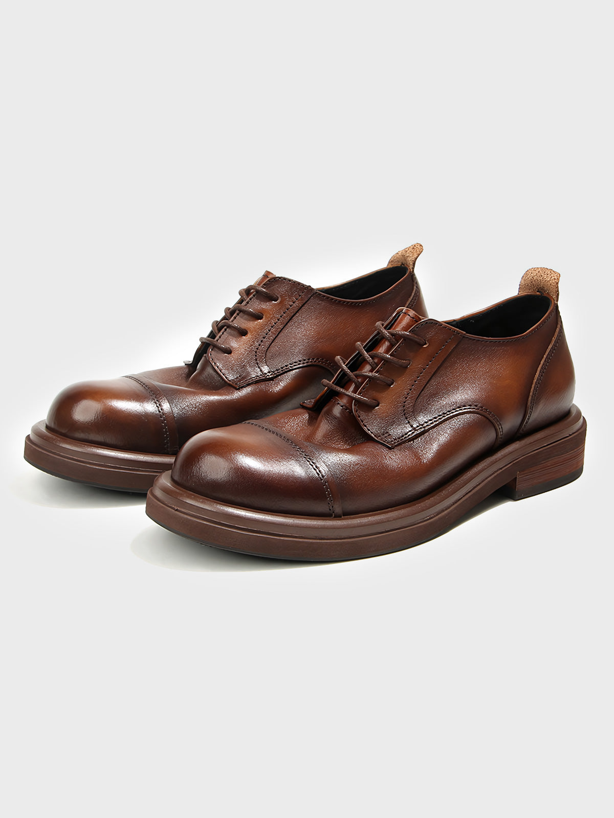 この手作りのエイジング加工は、古典的な靴作りの伝統に回帰しています。各ペアは職人によって手作りされた芸術品で、このデザインは靴に独特の個性を与え、時間の経過とともに着用によって靴の色合いが自然に変化し、それぞれの靴が着用者の生活の物語を記録します。シューズはクラシックなラウンドトゥデザインを採用し、快適さと美しさを兼ね備えています。堅牢な木製構造のソールと適切な幅の木型を使用し、安定したサポートと一日中の快適な着用感を提供します。