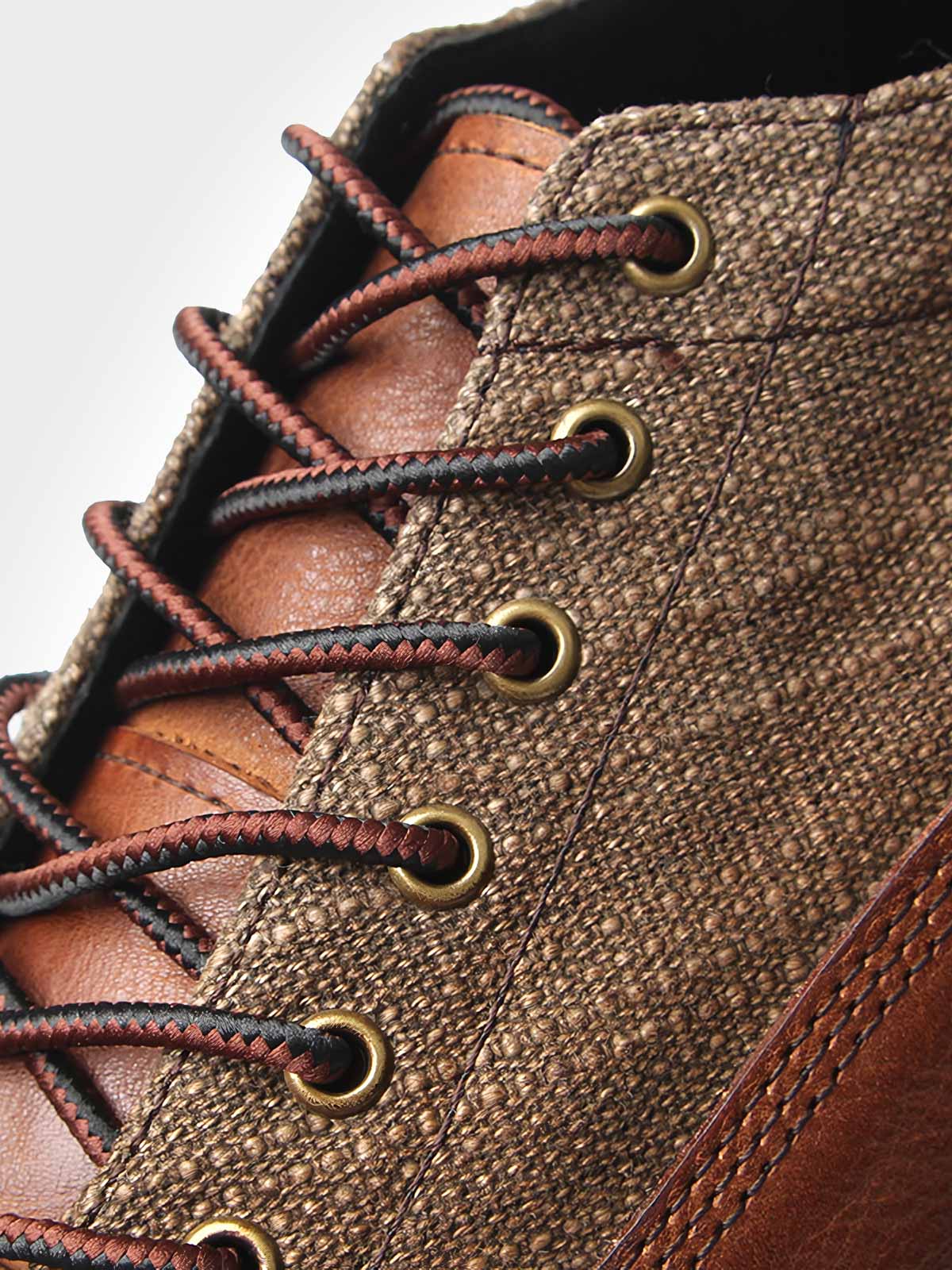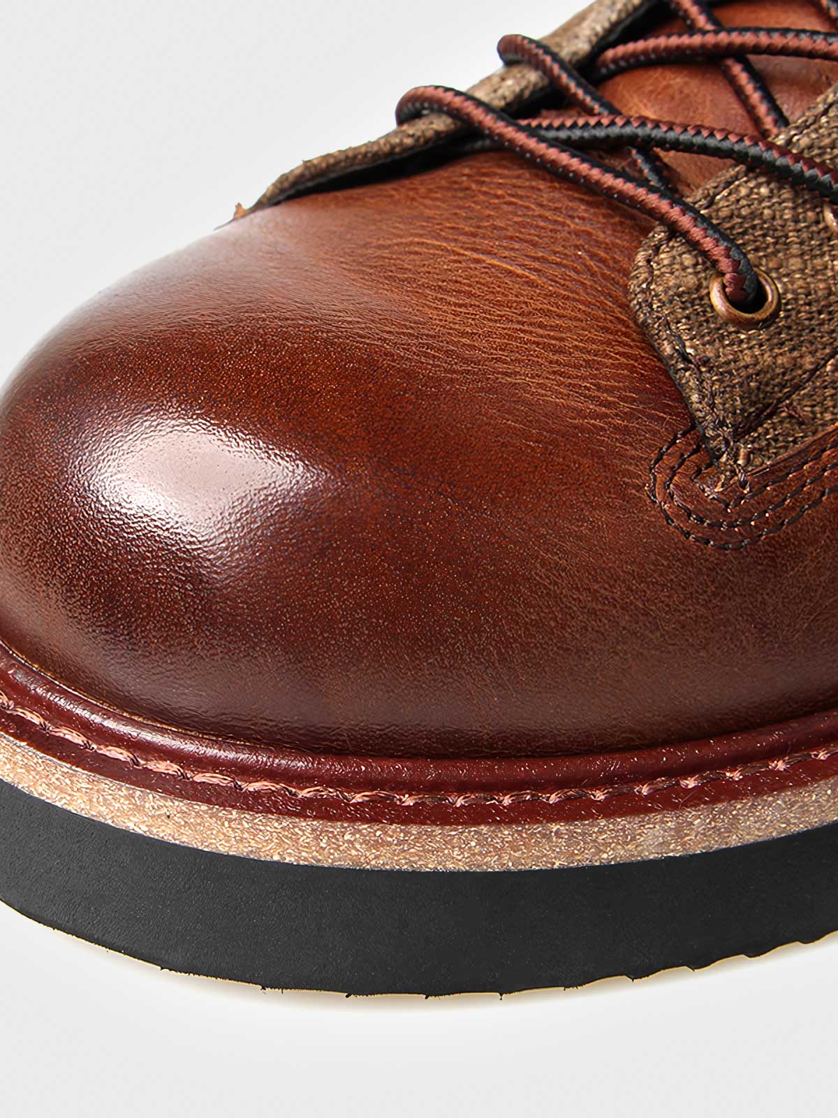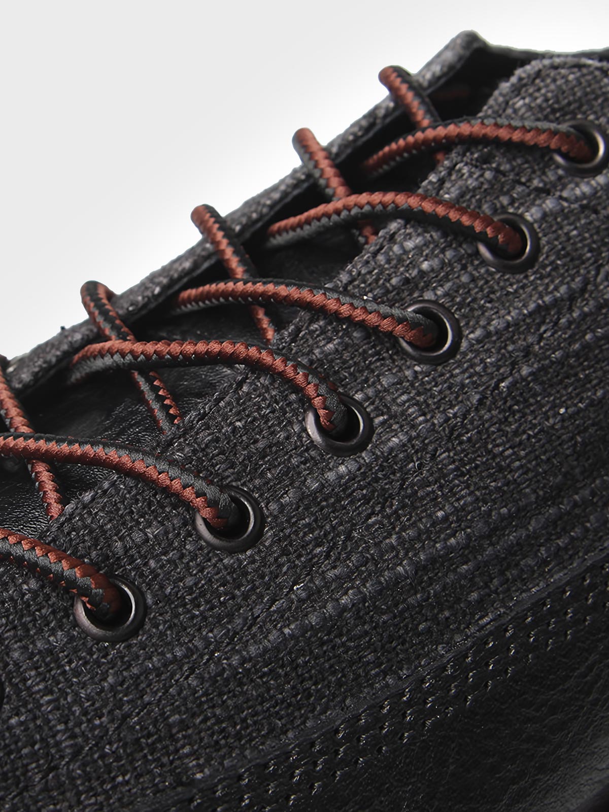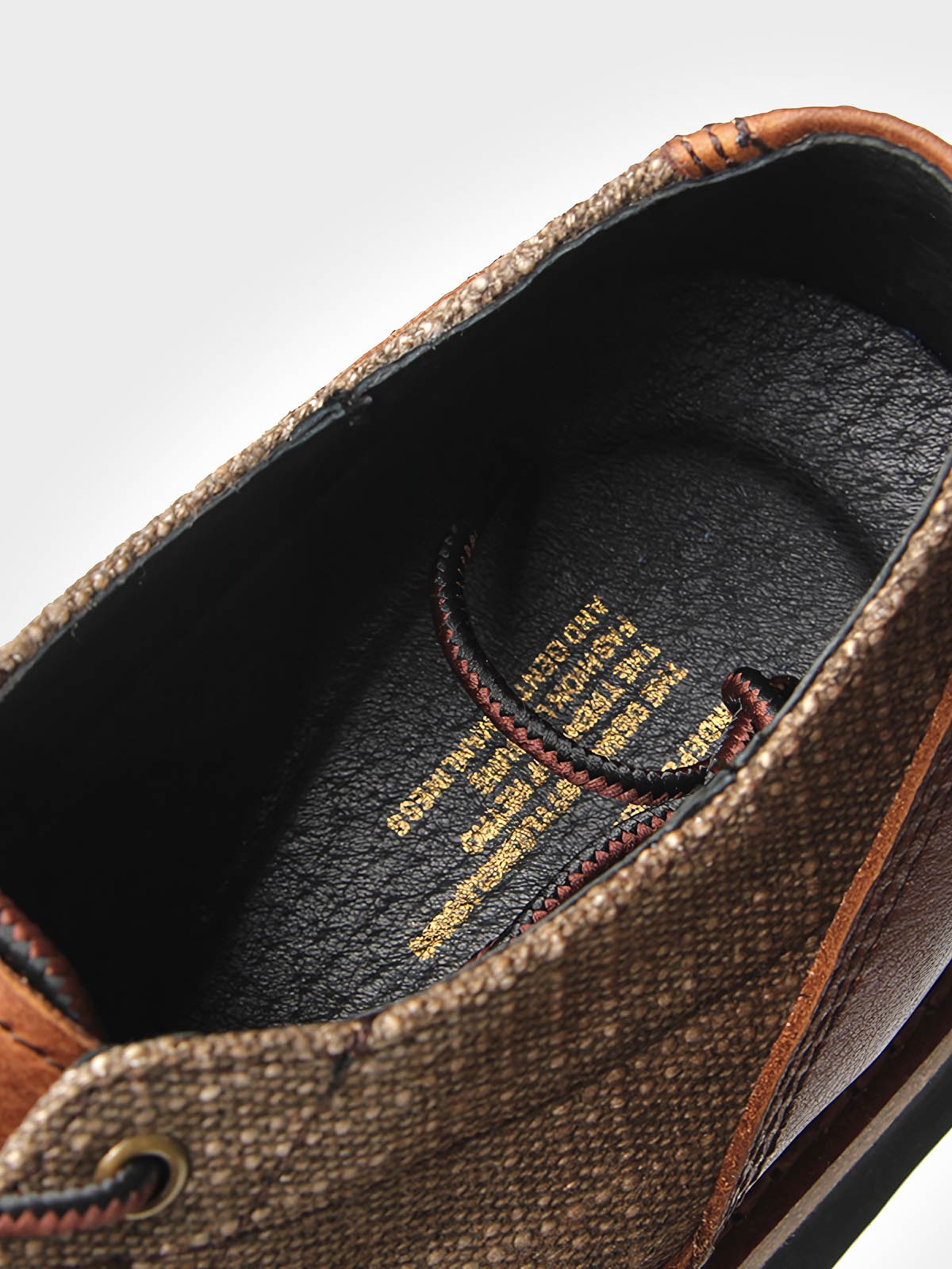 靴のアッパーには、柔軟性と耐久性を確保するために厳選されたトップレイヤーカウレザーを使用しています。パッチワーク部分の布地は、繊細かつ頑丈な織り素材を使用しており、靴の通気性を高めるとともに、工芸美を加えています。細やかなステッチと手作業による磨きのディテールは、職人の専門技術を示しています。