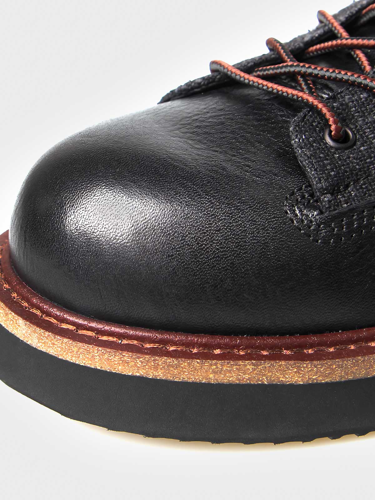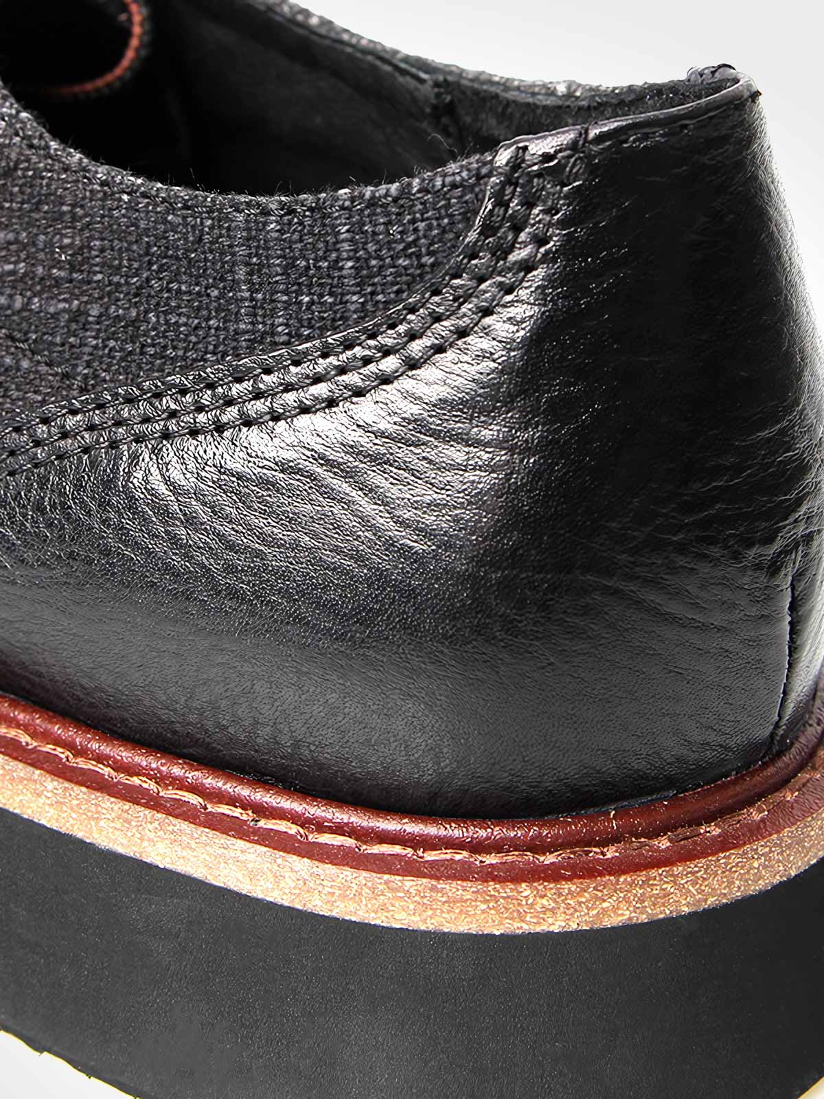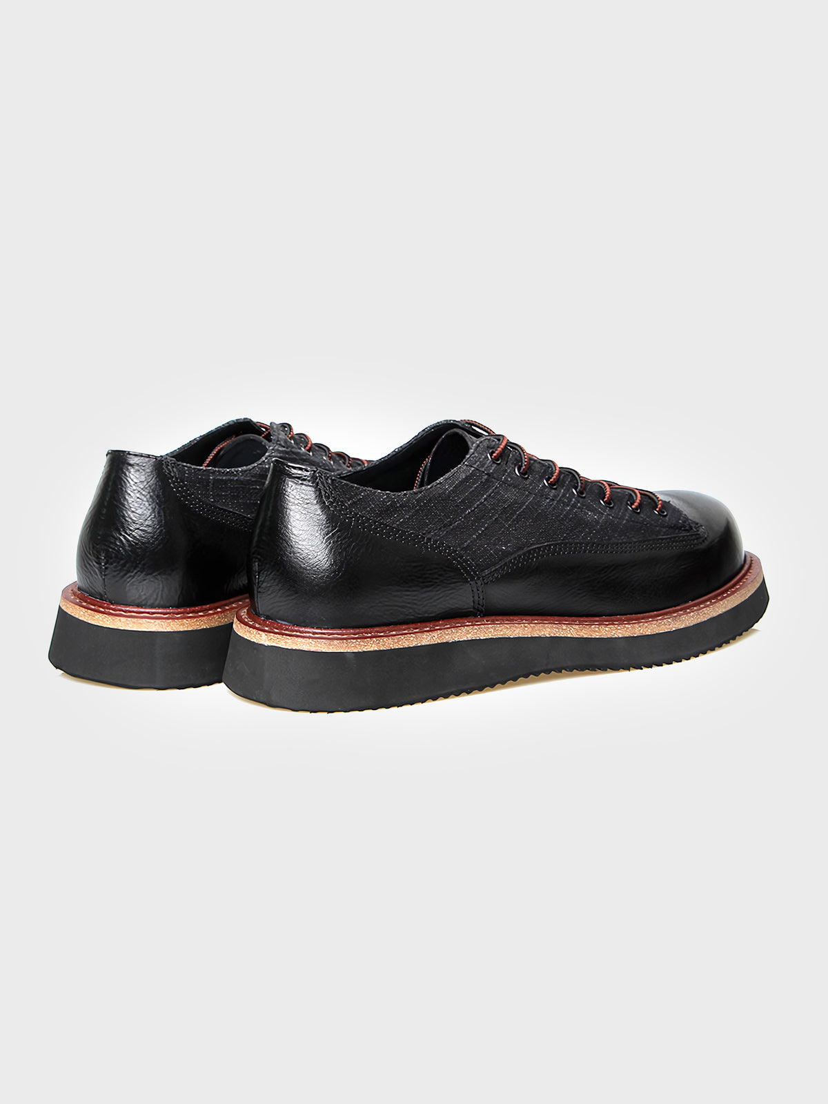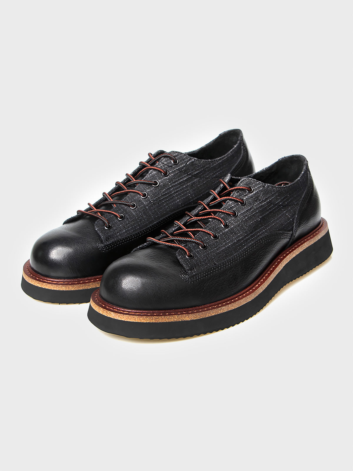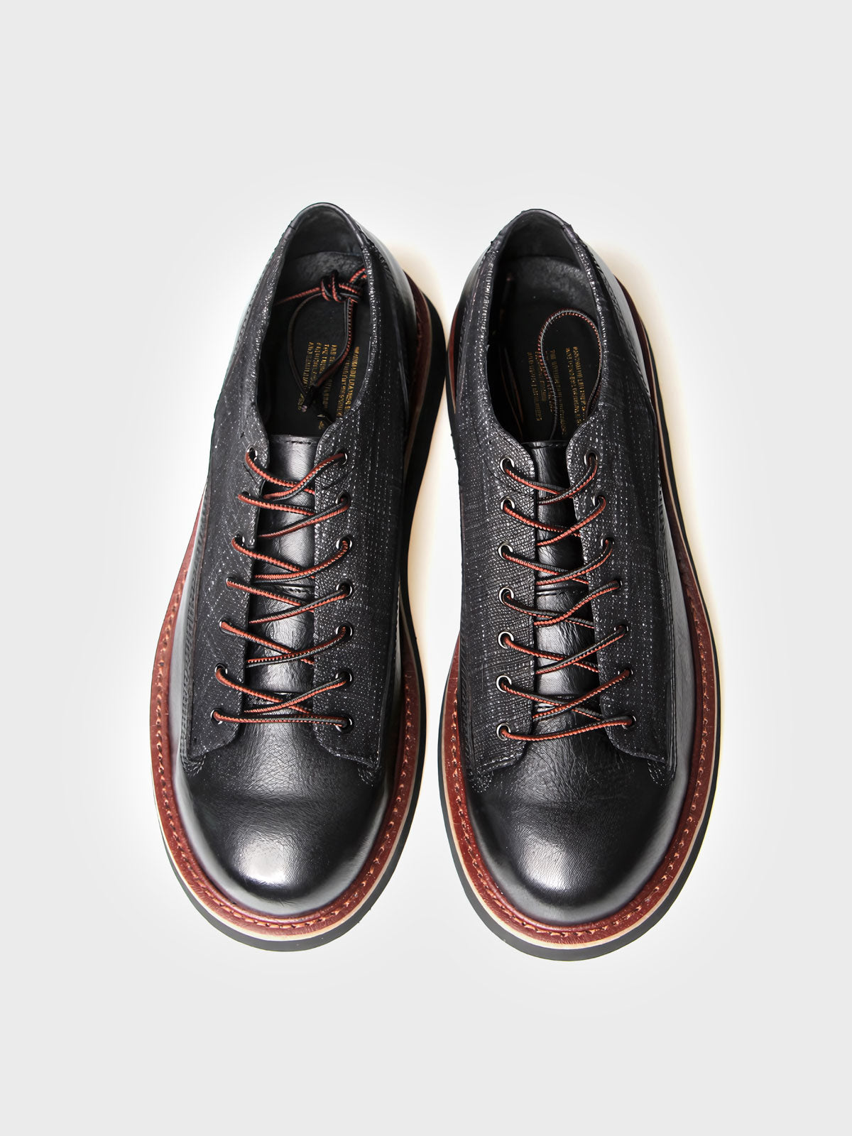 靴のアッパーには、柔軟性と耐久性を確保するために厳選されたトップレイヤーカウレザーを使用しています。パッチワーク部分の布地は、繊細かつ頑丈な織り素材を使用しており、靴の通気性を高めるとともに、工芸美を加えています。細やかなステッチと手作業による磨きのディテールは、職人の専門技術を示しています。