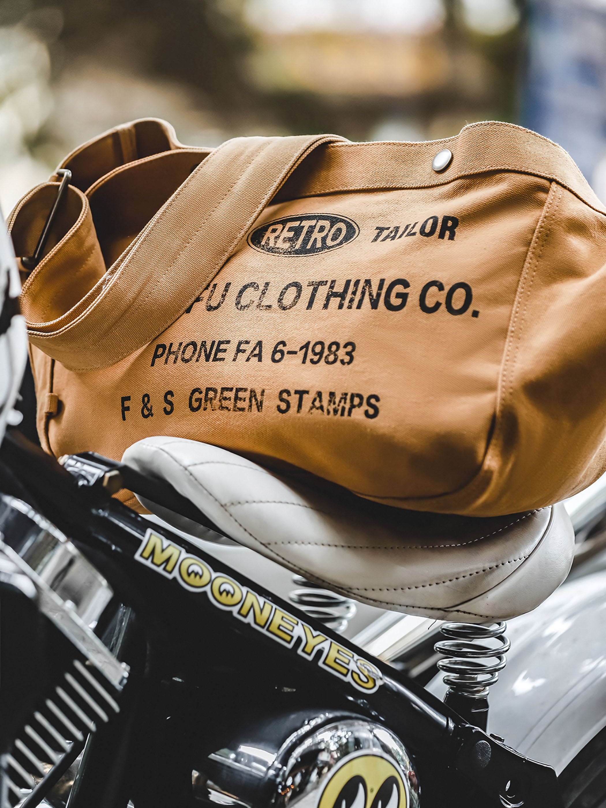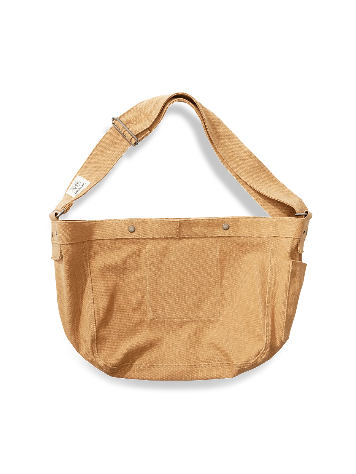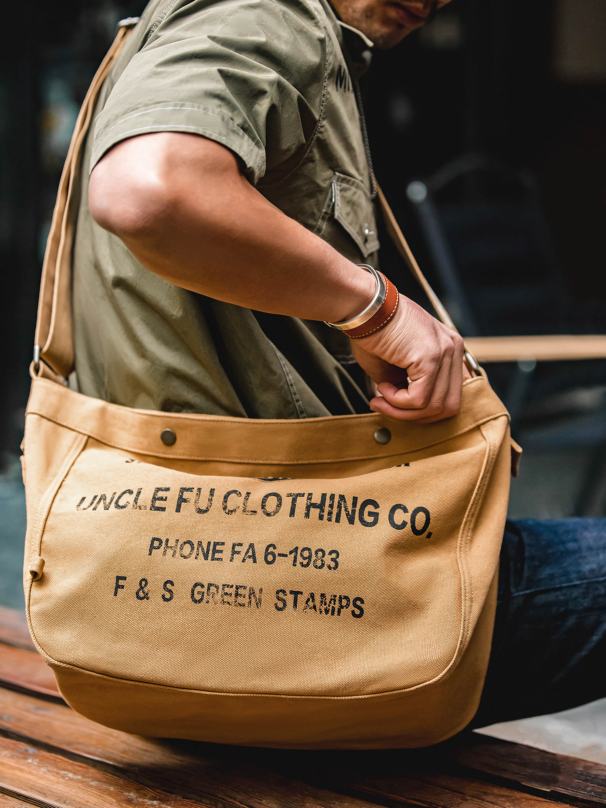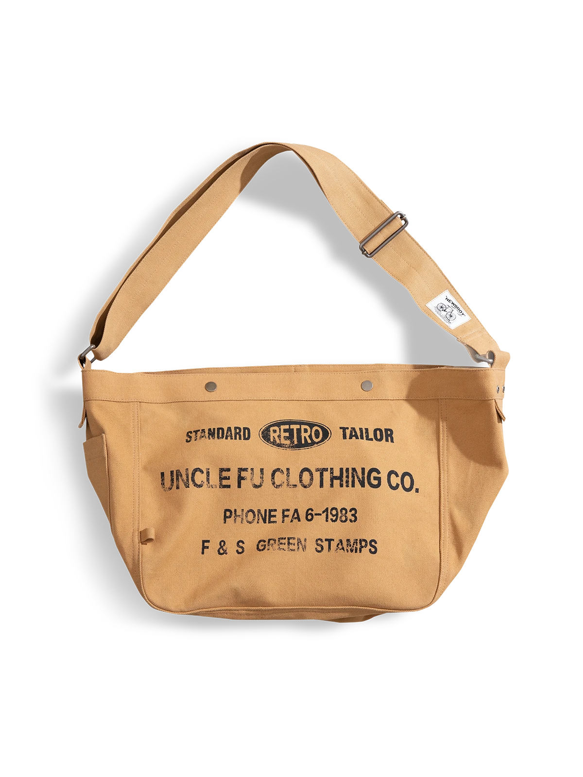このアイテムは60年代の新聞配達員のバッグからインスピレーションを受けており、クラシックなグラフィックをプリントすることでレトロな雰囲気を演出し、当時のムードを醸し出しています。前面には英字のデザインが施され、コーディネートのハイライトとなる一方、背面は単色のデザインであり、正反面の使い分けが柔軟にできるのも魅力です。