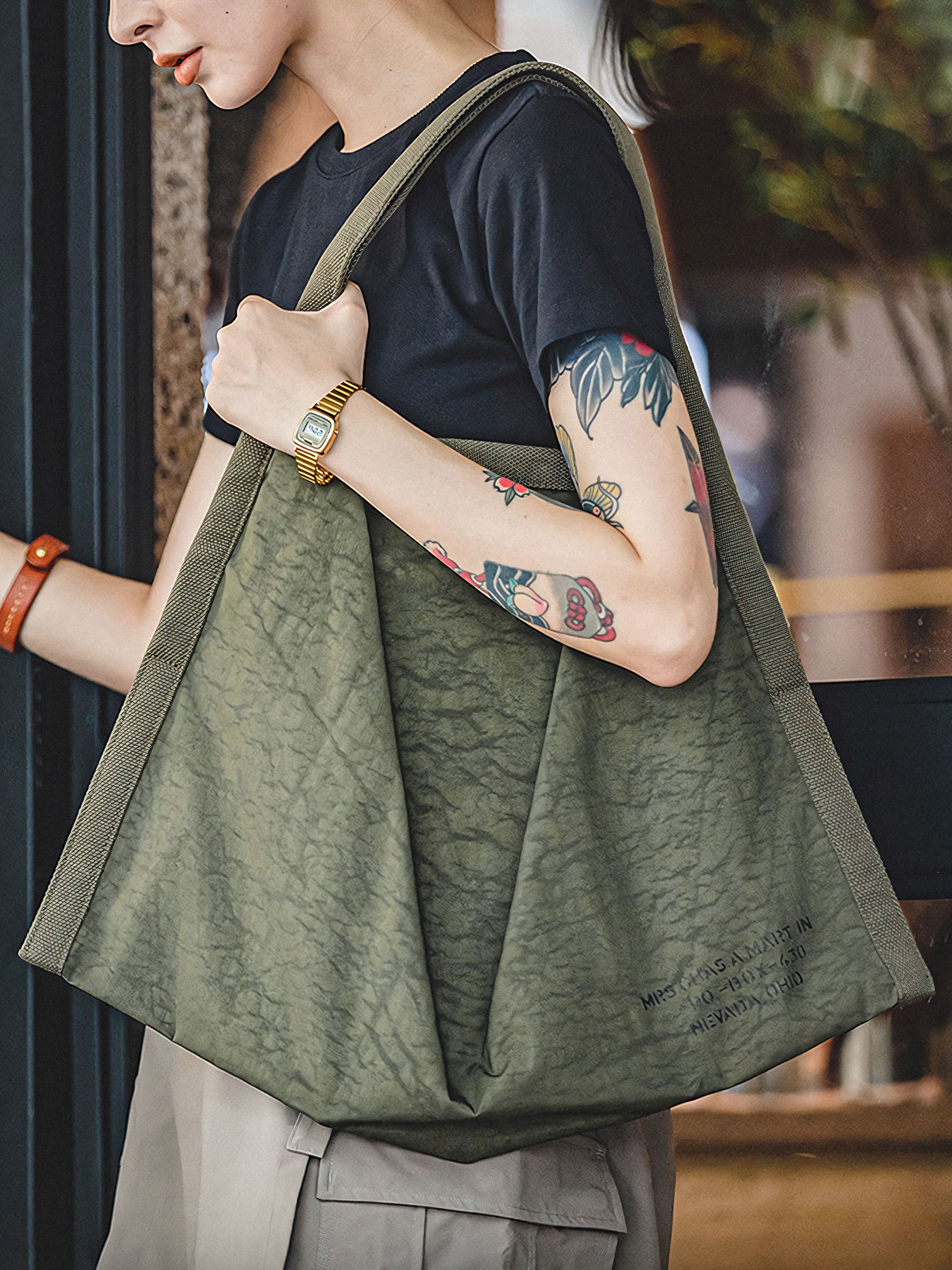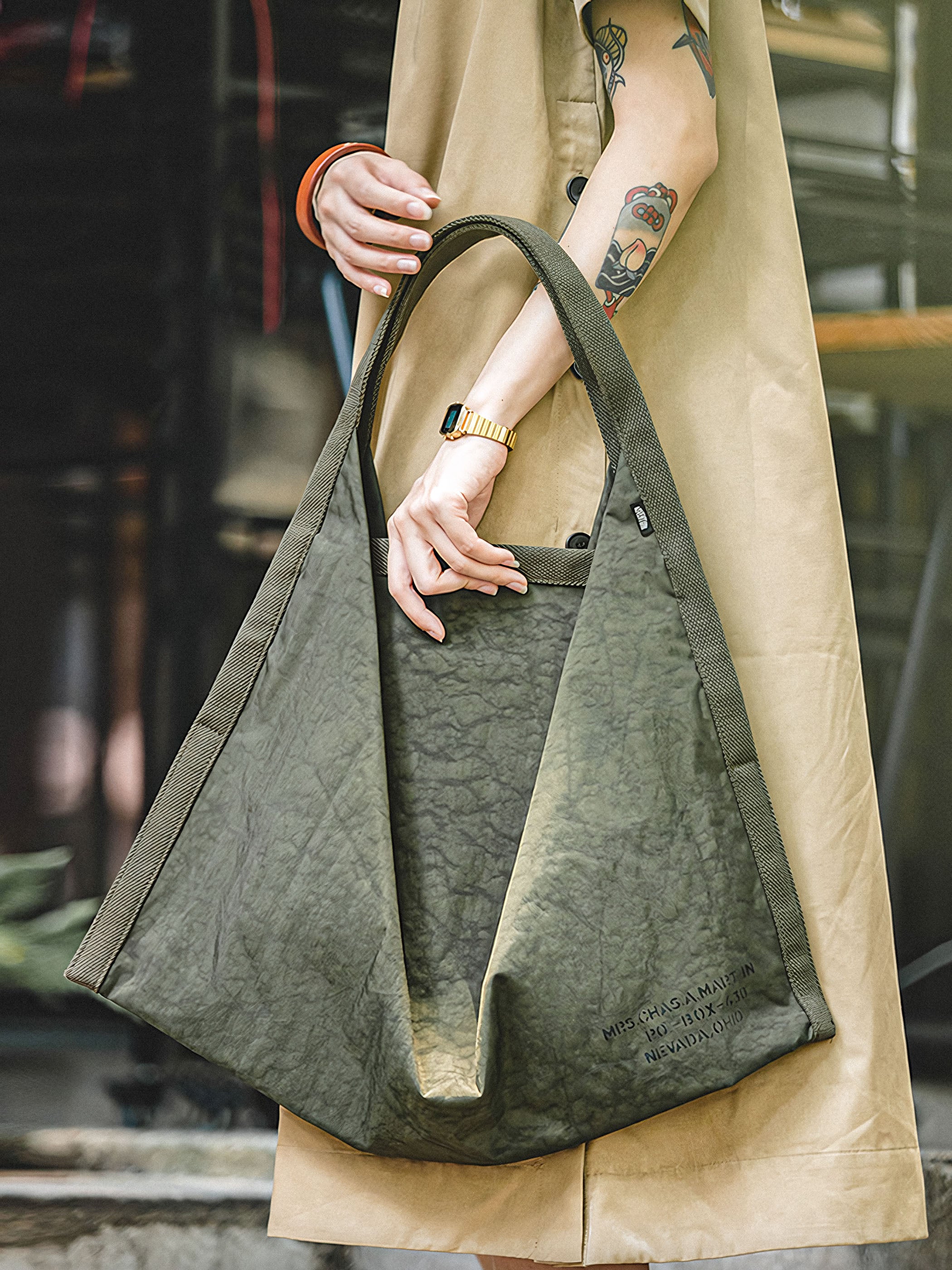 荷物が多い時に求められる、軽量なトートバッグが登場しました!このアイテムは、オリジナル加工によってクシャクシャとした古紙のようなテクスチャが表面に施されており、美しく高級感のある雰囲気を演出しています。開閉部は磁気ボタンで簡単に開閉でき、A4サイズも収納可能な収納力も魅力的です。カジュアル×モードファッションを軸に、ラフに着こなせるシルエット感が特徴です。また、夏向けの速乾性や撥水機能もしっかりと装備されており、非常に便利です。
