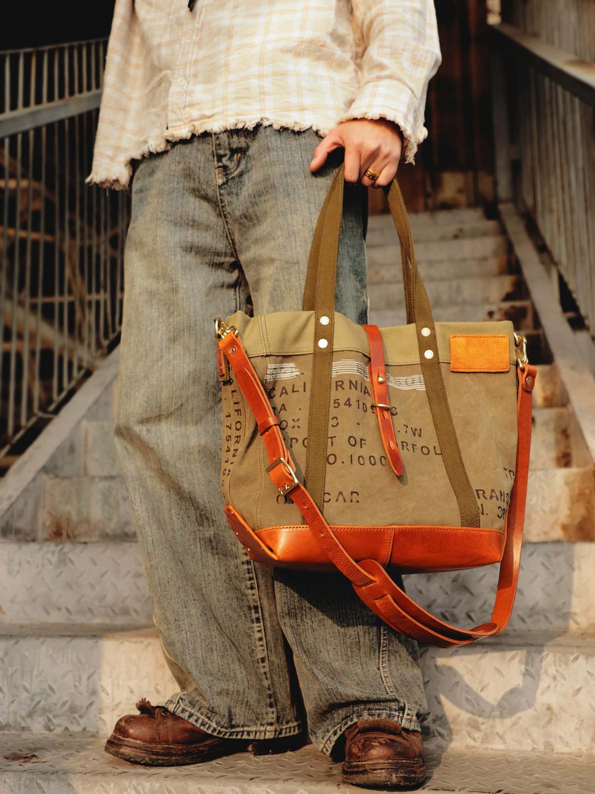 イタリアのベジタブルタンニンレザーと高密度のピュアコットンキャンバスで作られたアメリカンヴィンテージの多機能トートバッグ。
