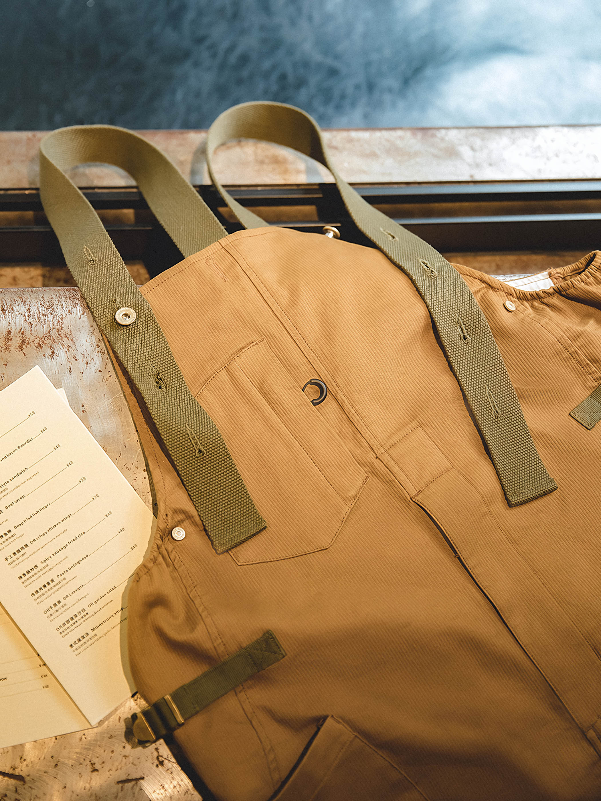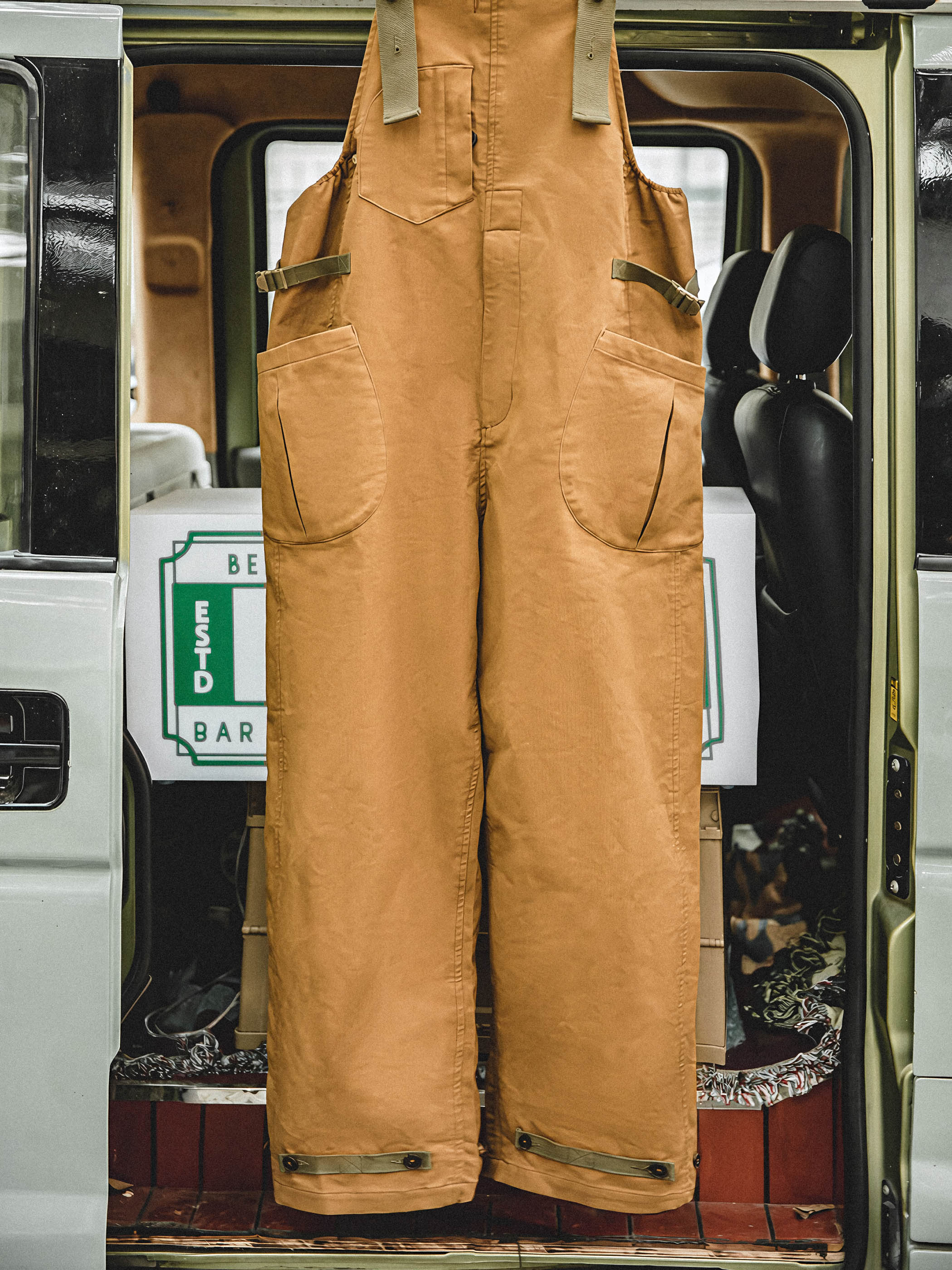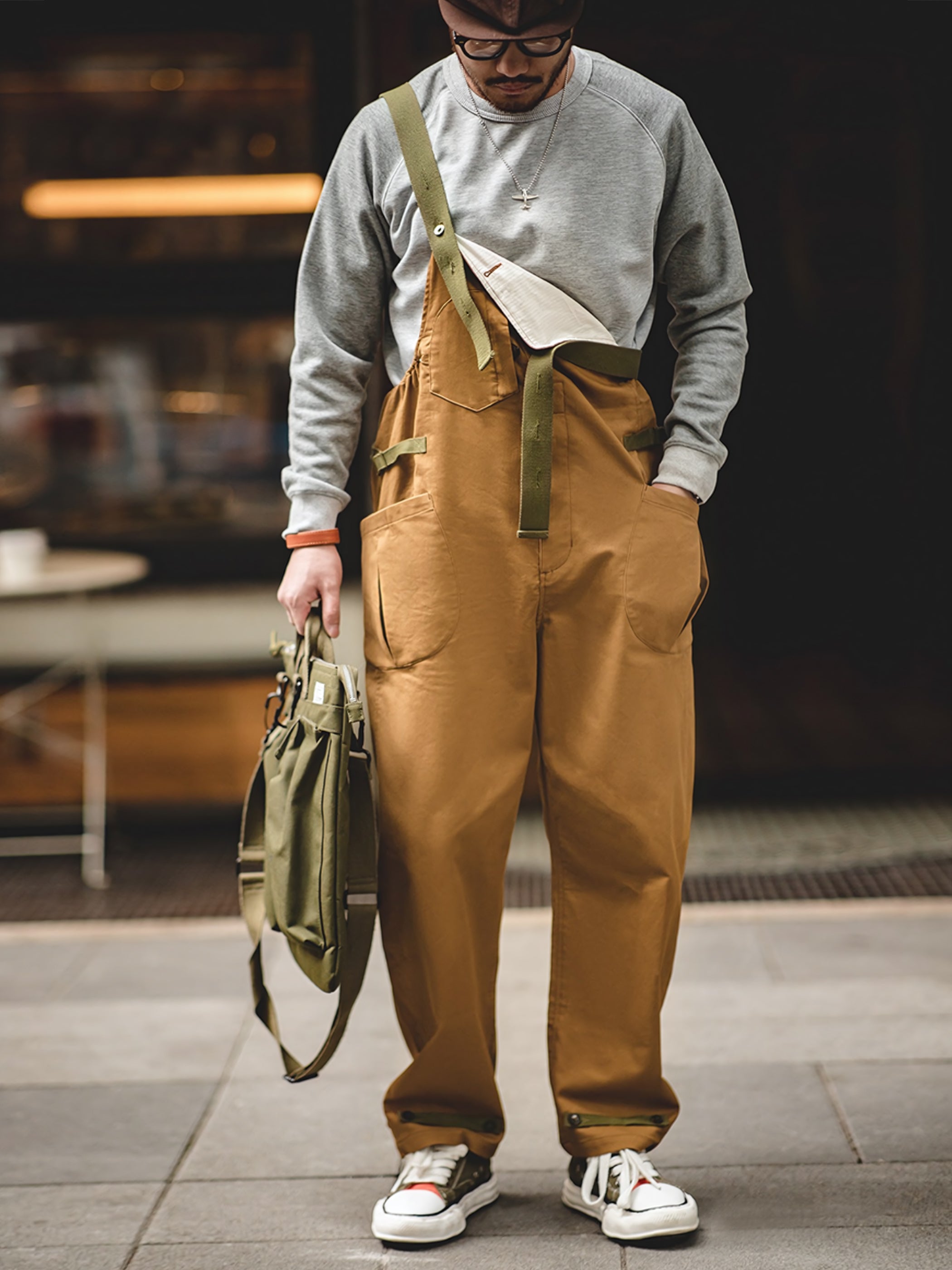 このアイテムは調節可能なショルダーストラップを胸の位置でオーダーメイドボタン留めし、両腰でメタルバックルベルトを留め、フロントにはDポケット1つとジャバラポケットを2つ、背面にはパッチポケット2つ配置しています。