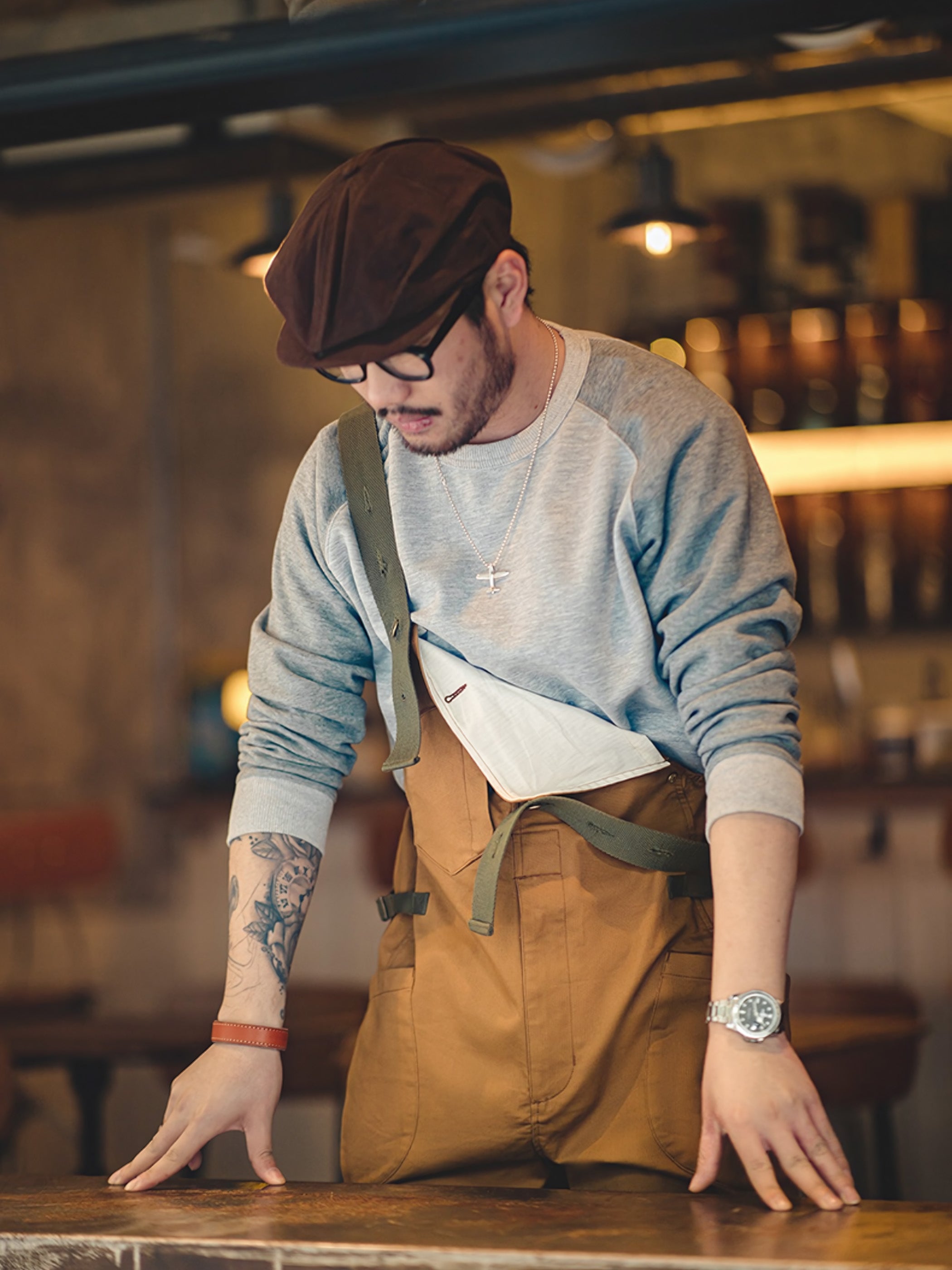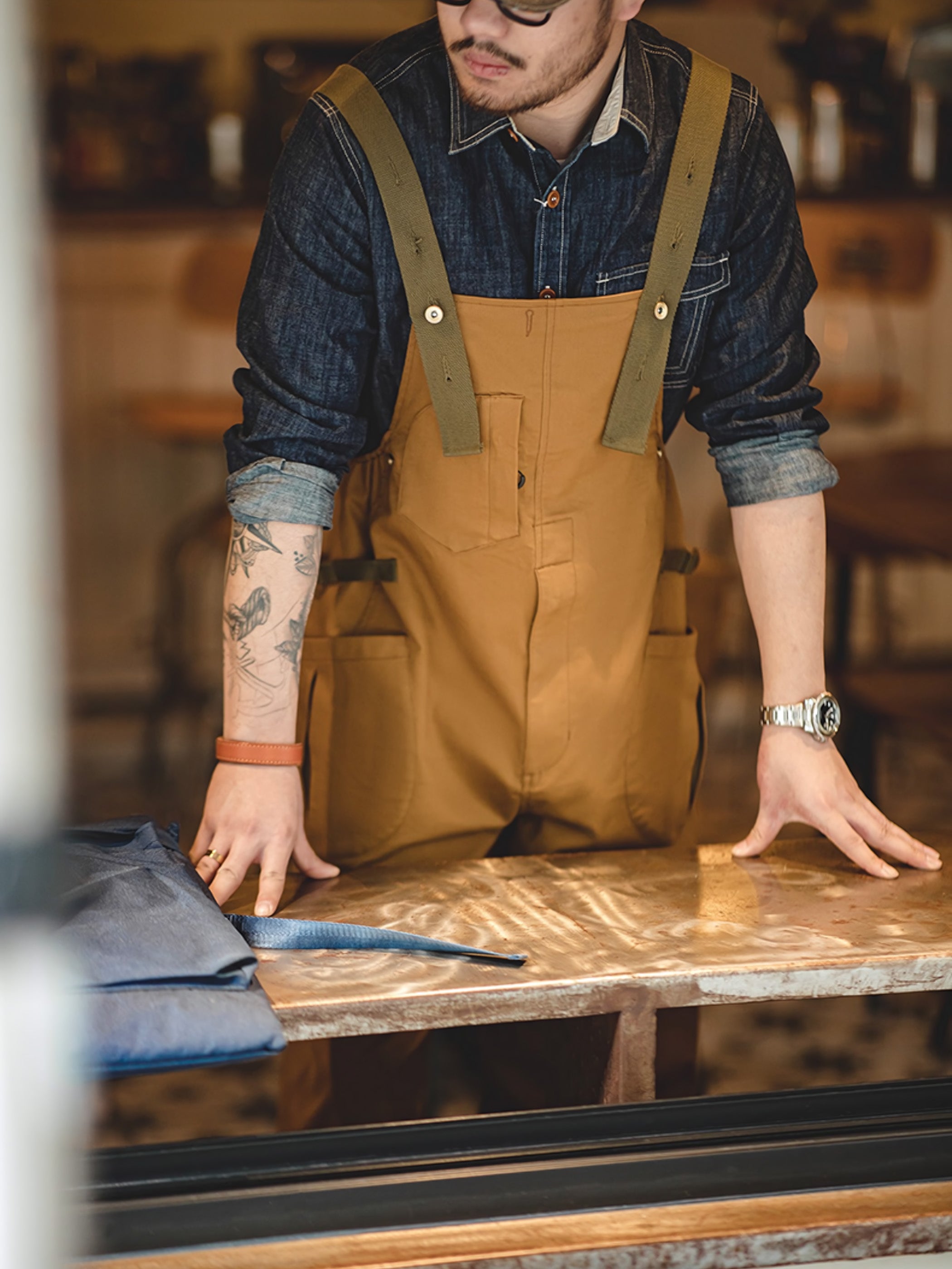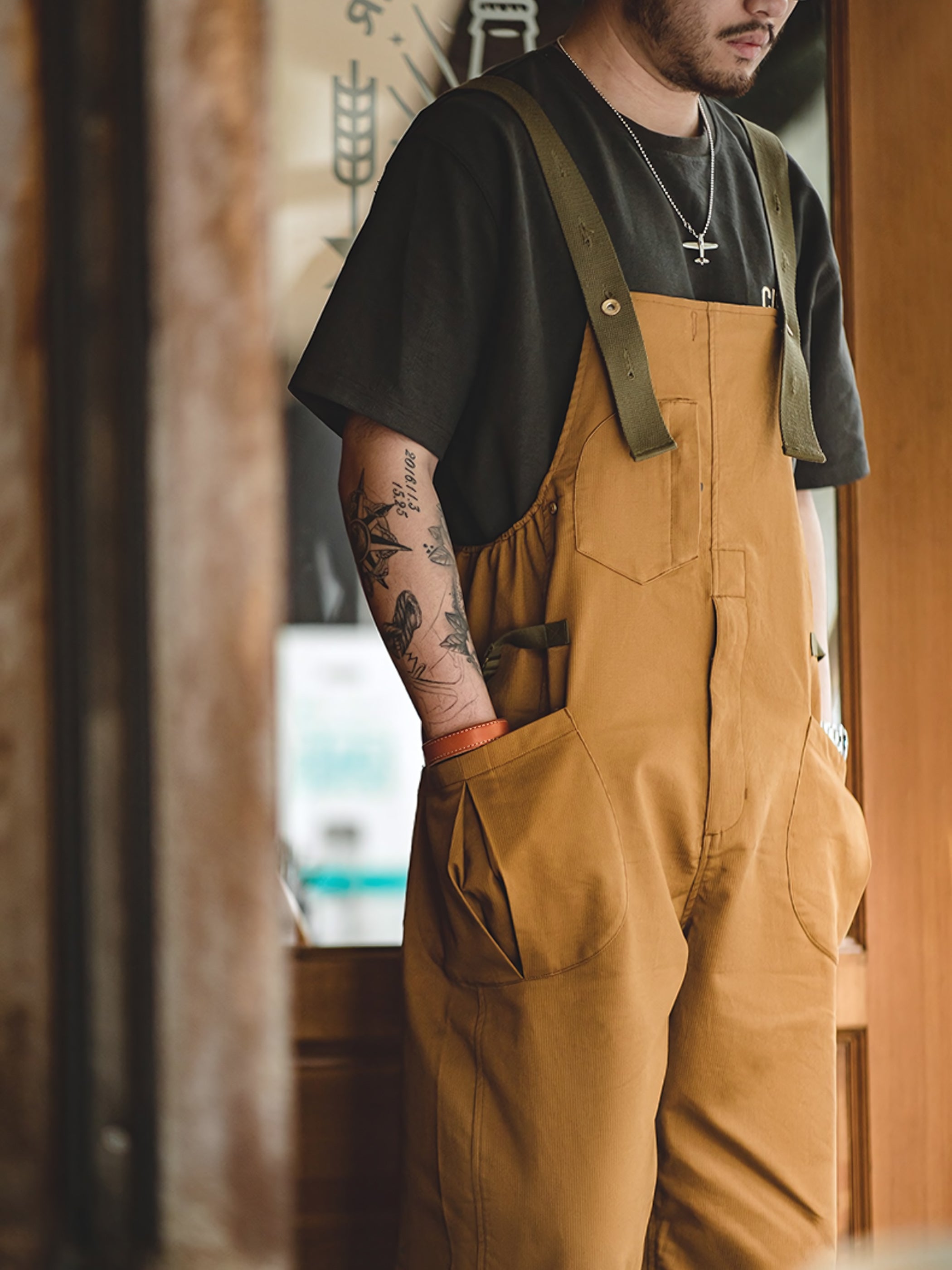 このアイテムは調節可能なショルダーストラップを胸の位置でオーダーメイドボタン留めし、両腰でメタルバックルベルトを留め、フロントにはDポケット1つとジャバラポケットを2つ、背面にはパッチポケット2つ配置しています。