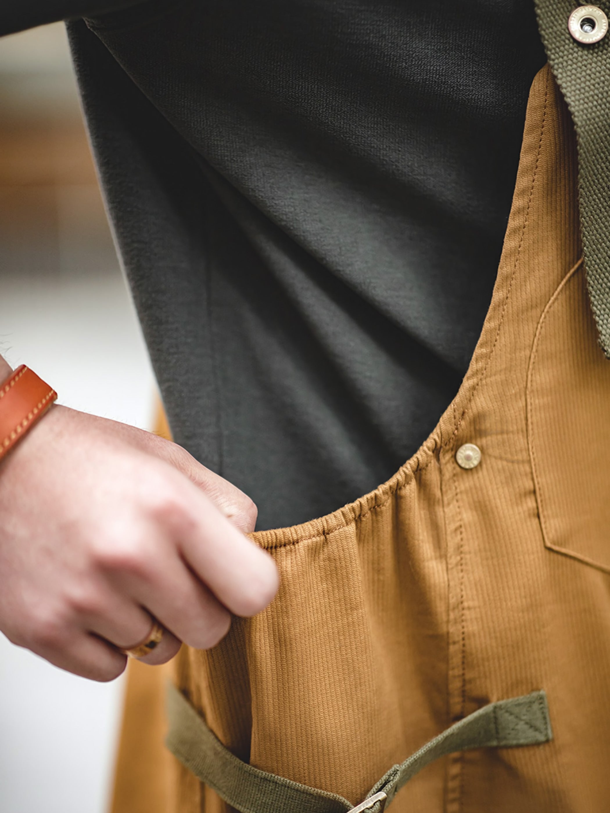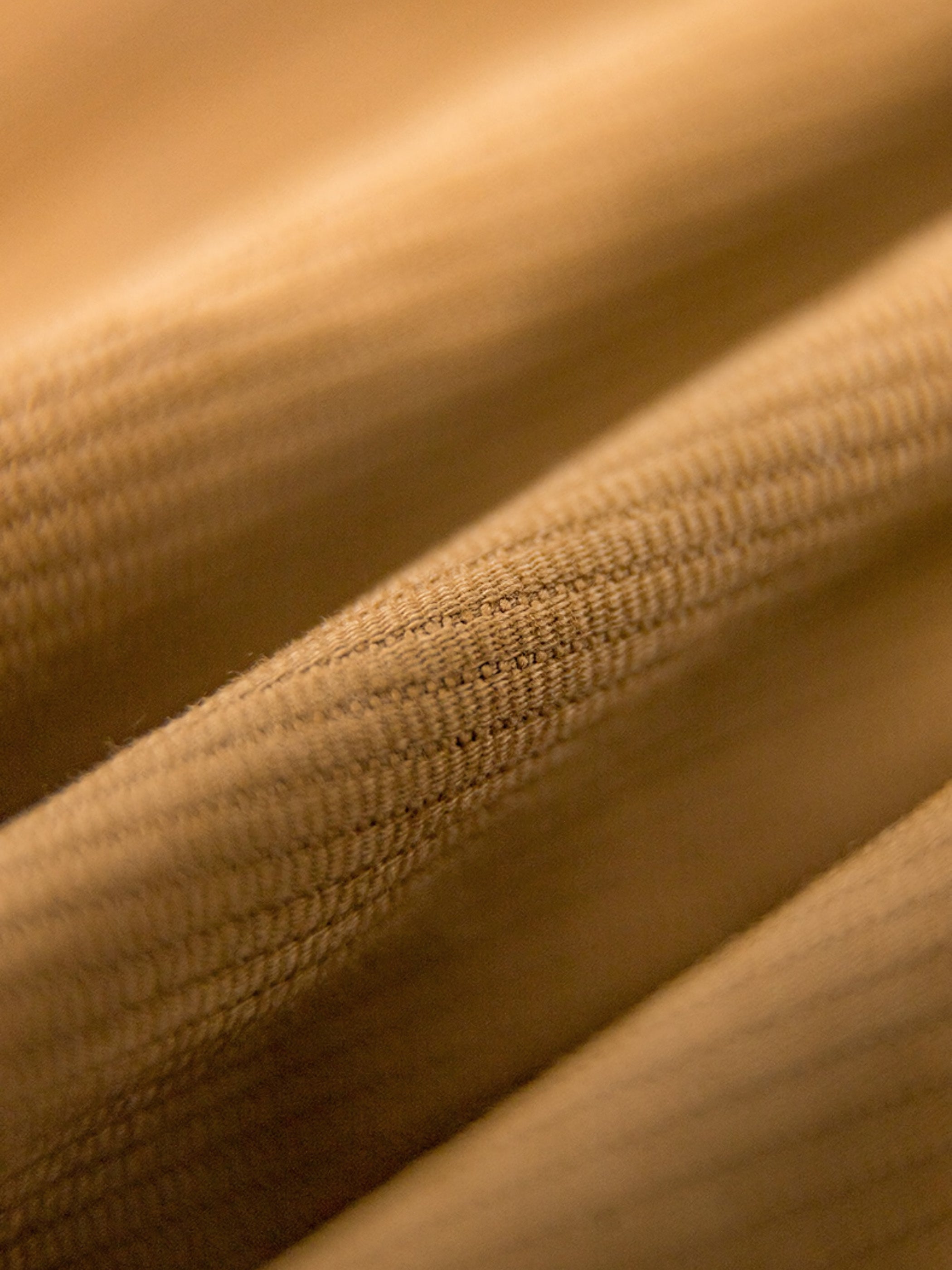 このアイテムはくっきりとした細かいコーデュロイ素材を使用しています。コーデュロイ素材は、パイル繊維の間に空気層を保持するため、保温性と吸湿性に優れています。また、縦糸にスパンデックスを使用することで、程よい伸縮性を実現しています。シワになりにくく、経年変化による味わいも楽しめるのが魅力です。
