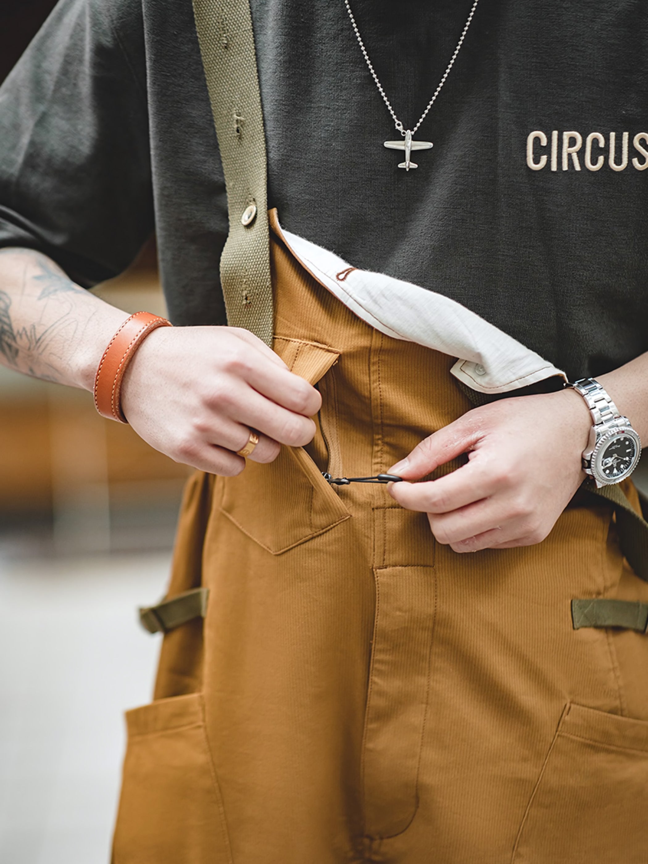 このアイテムは、胸の位置でカスタムボタン留めで調節可能なショルダーストラップを装備しています。これにより、機能性が満載です。また、肩紐を片方外すなどのアレンジも可能で、ワイドパンツ風に着こなすこともできます。