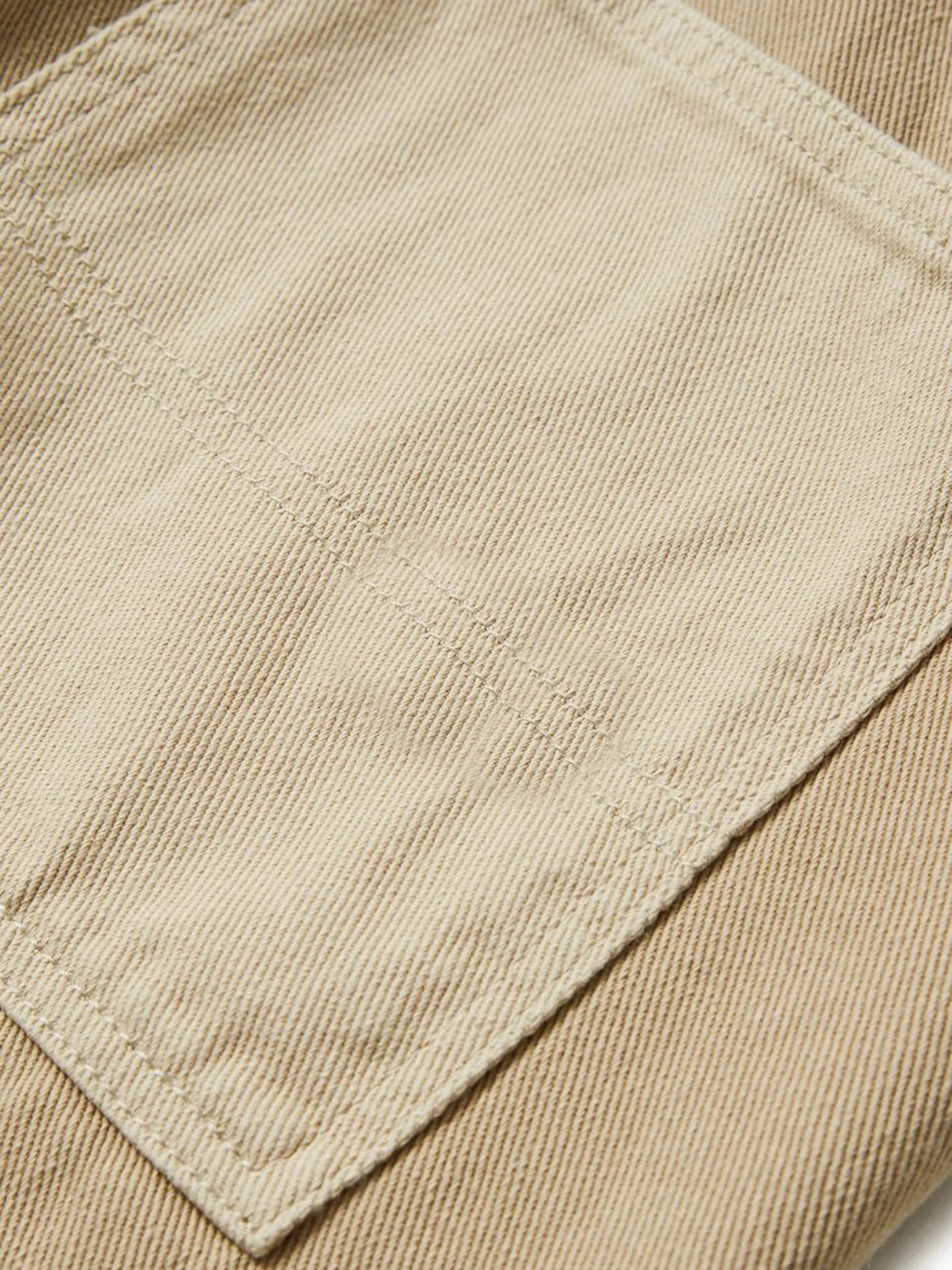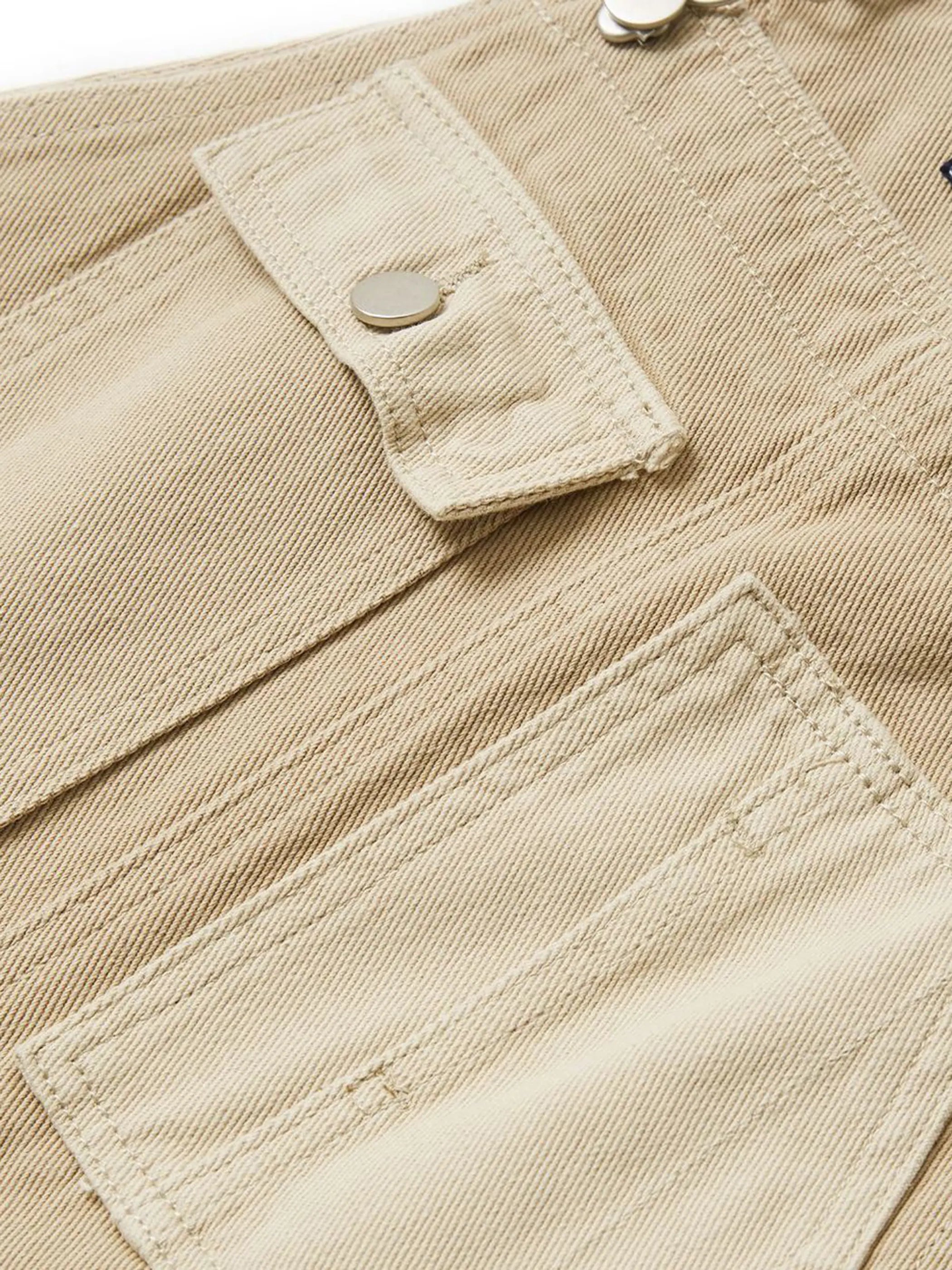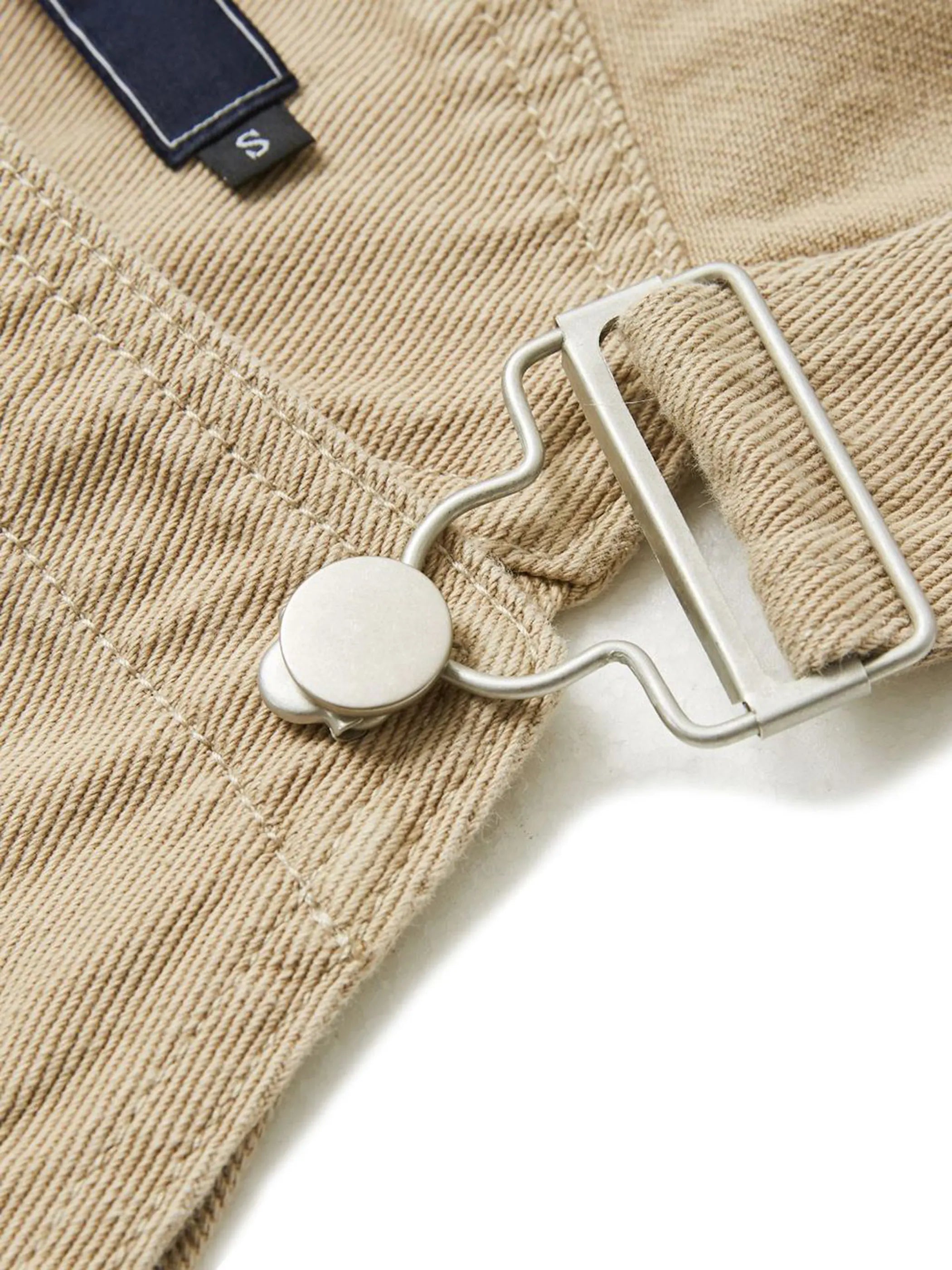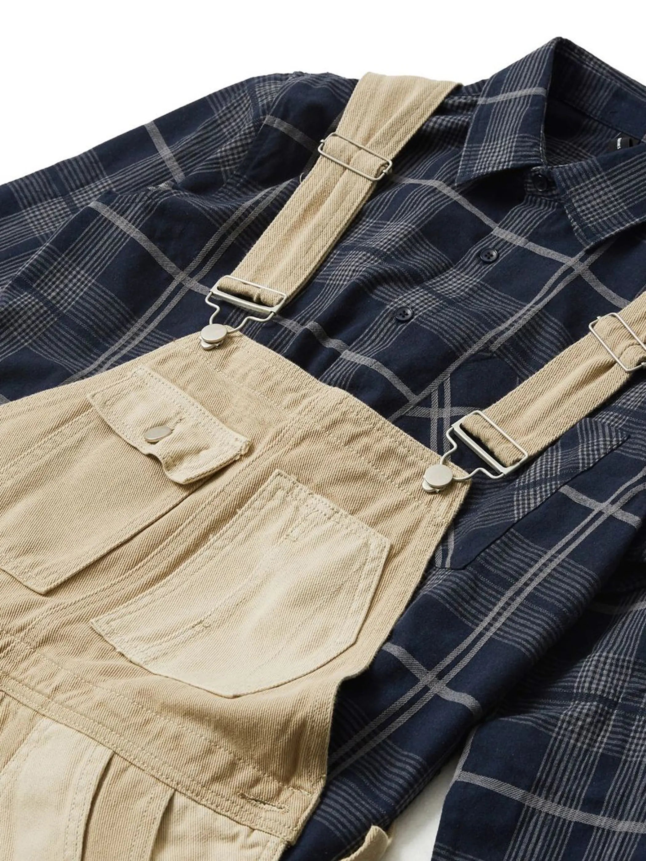 異なるコットン生地を組み合わせたパッチワークポケットが視線を集めるワーク感満載のデザインで、丈夫なヘビーツイルを採用して経年変化も楽しめます。胸&腰の大小ポケットは工具からスマホまで余裕で収納可能で、サイドのスナップボタン開閉で着脱もスムーズ。ストレートレッグが脚のラインを拾わず、ゆったりとしたシルエットで動きやすさとスタイルを両立。キャンプやガーデニング、ストリートスタイルまで幅広く対応します。