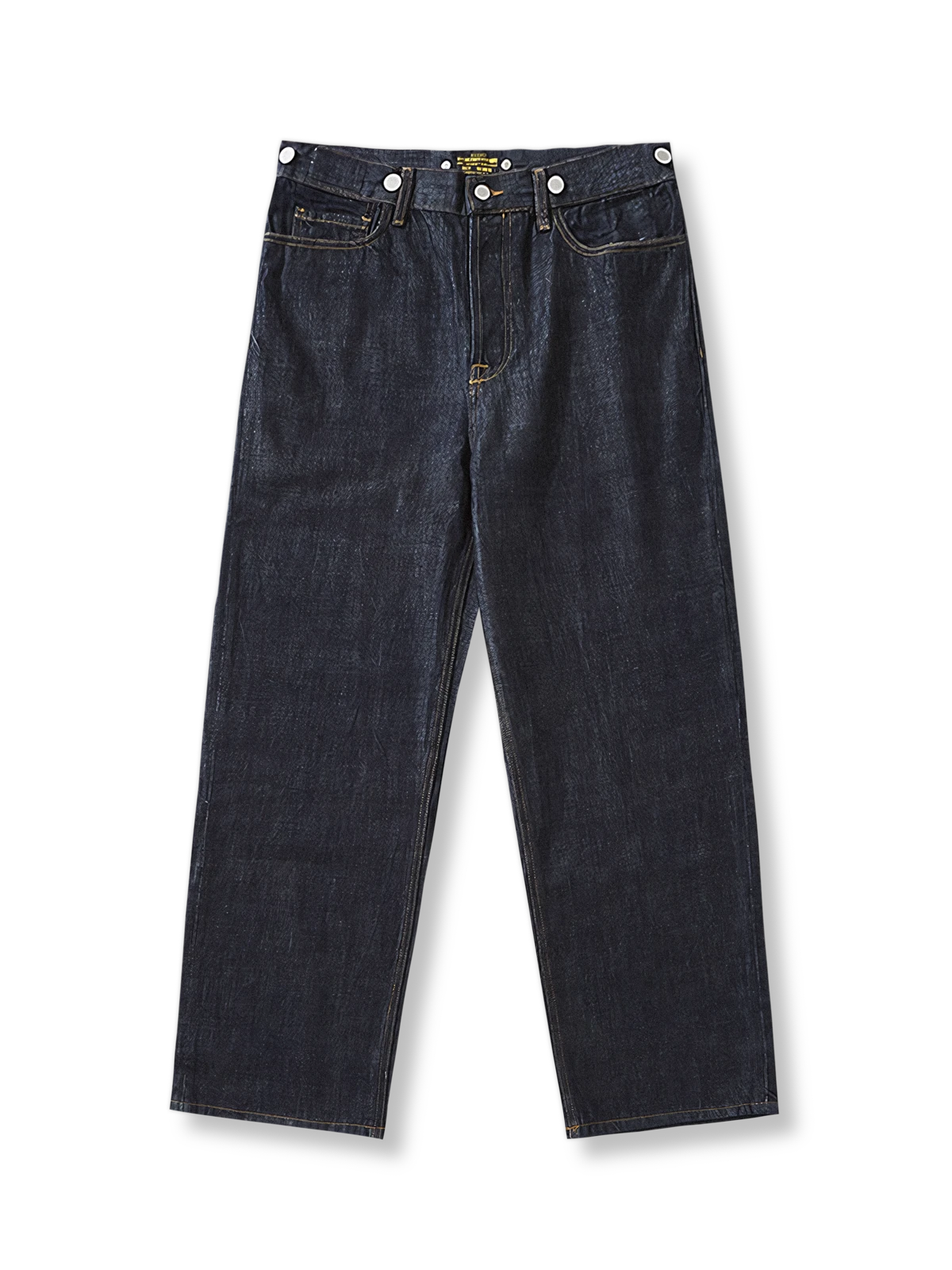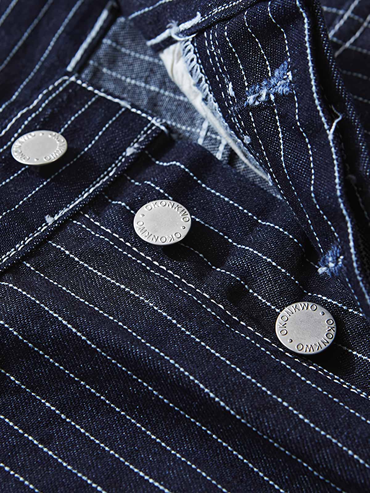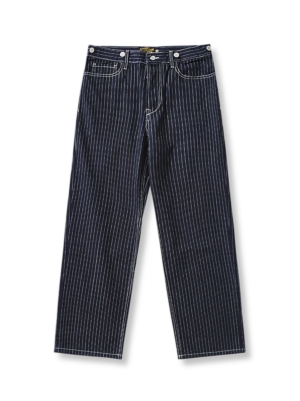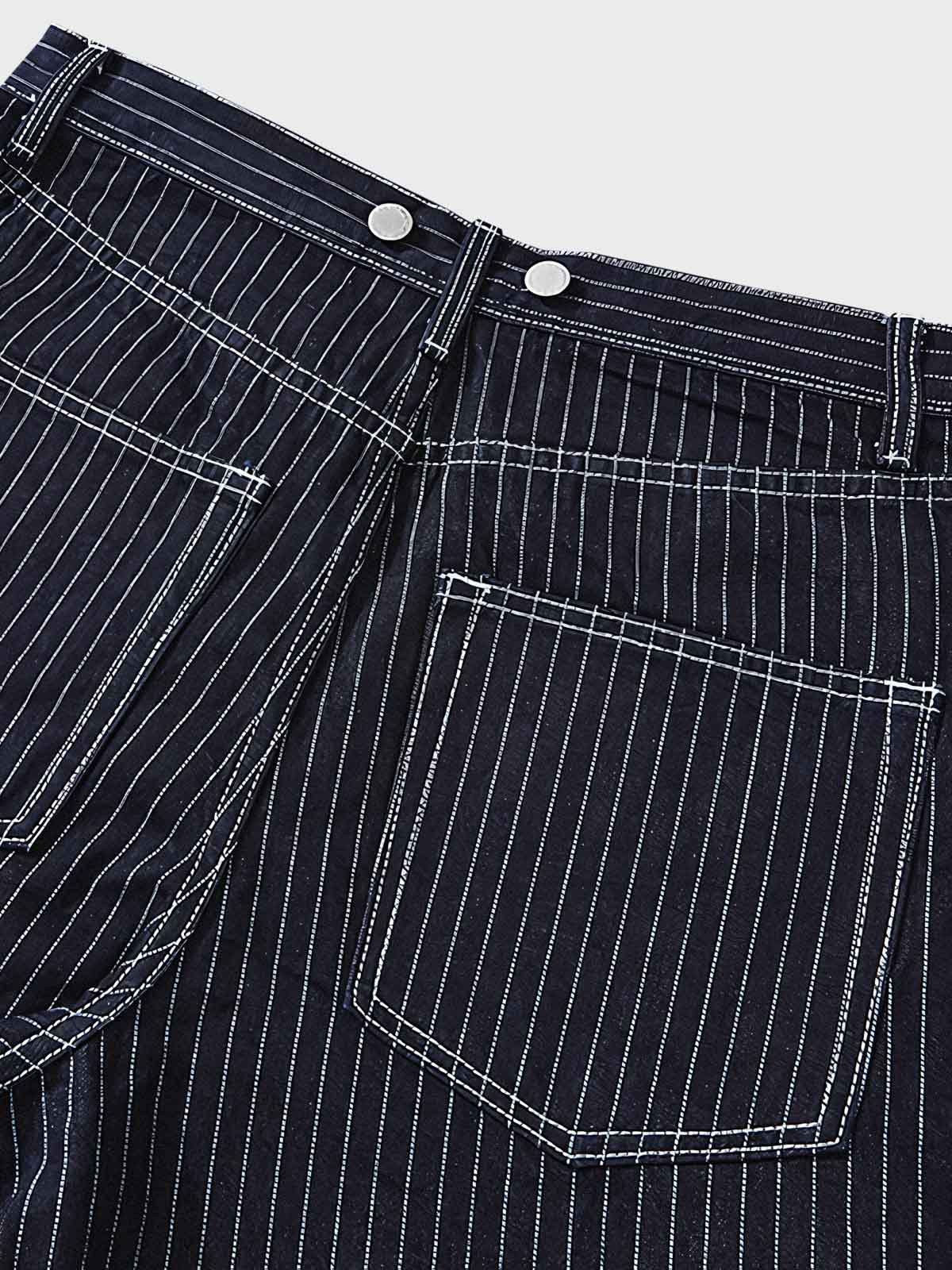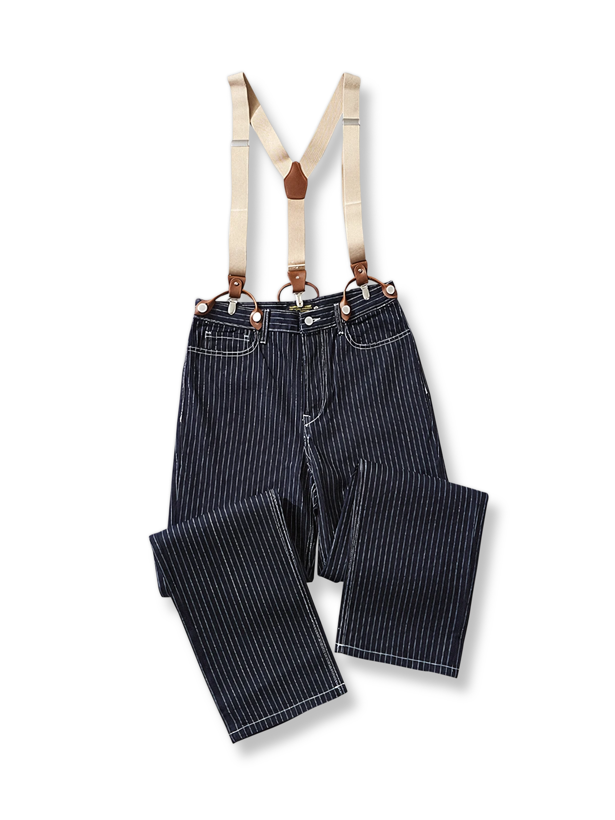 このワークサスペンダーパンツは鉄道ストライプデザインを採用し、19世紀末から20世紀初頭の鉄道作業員の制服を思い起こさせます。ストライプパターンは当時の実用主義と工業化の精神を象徴していました。ミッドウエストとストレートな裾のデザインは、伝統的なワークパンツの実用的な美学を反映し、織り技術は耐久性を保証しています。