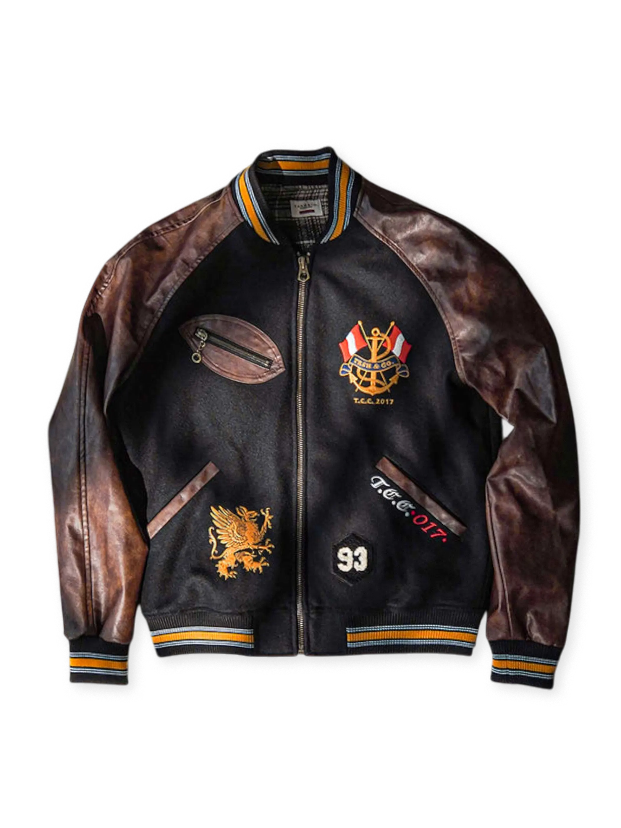 IVY常青藤ウールベースボールジャケットは、1865年のハーバード大学のアスリートレターマンセーターからインスピレーションを得て、1930年代にジャケットスタイルに進化しました。特徴的なレザーの袖とウールのボディの組み合わせに、特別な意味を持つ刺繍の図案が施されています。ジャケットのグリフォン刺繍は力と高貴さの象徴であり、古代の皇室と貴族のシンボルとされています。このジャケットはIDEAL社製の銅製ジッパーを使用し、ボディには80%ウールの850g高密度メルトンウールを採用し、20%のポリエステルを混紡することでシワになりにくくしています。裏地には100%コットンの厚手チェックジャカードを使用し、袖の裏地には静電気を防ぐためにレーヨンを使用しています。高品質のヴィンテージ仕上げPUレザーが全体のヴィンテージ感を高めており、ディテールにはコットン糸を使用して、よりヴィンテージ感を強調しています。クラシックと品質を追求する方に最適な選択です。