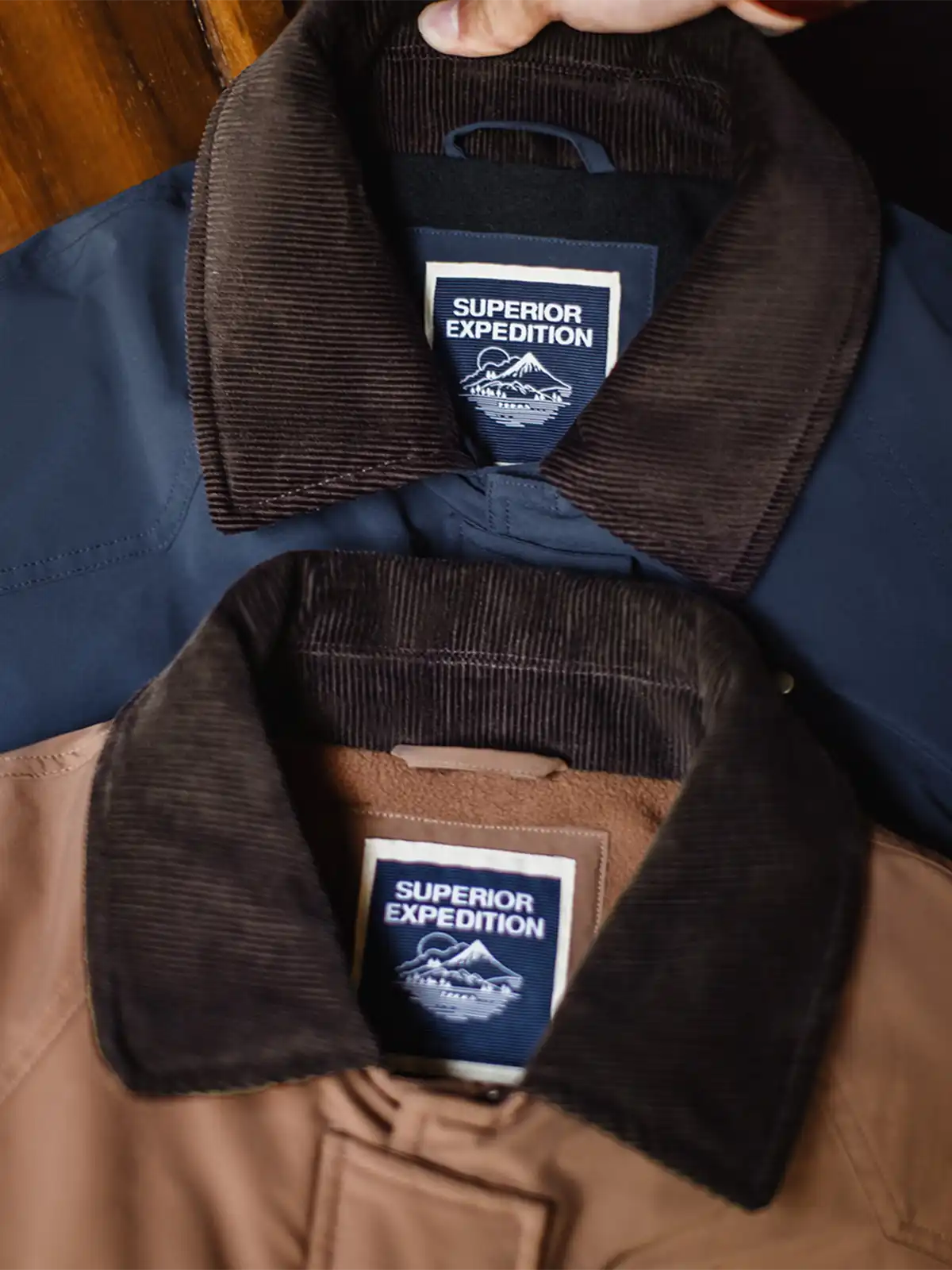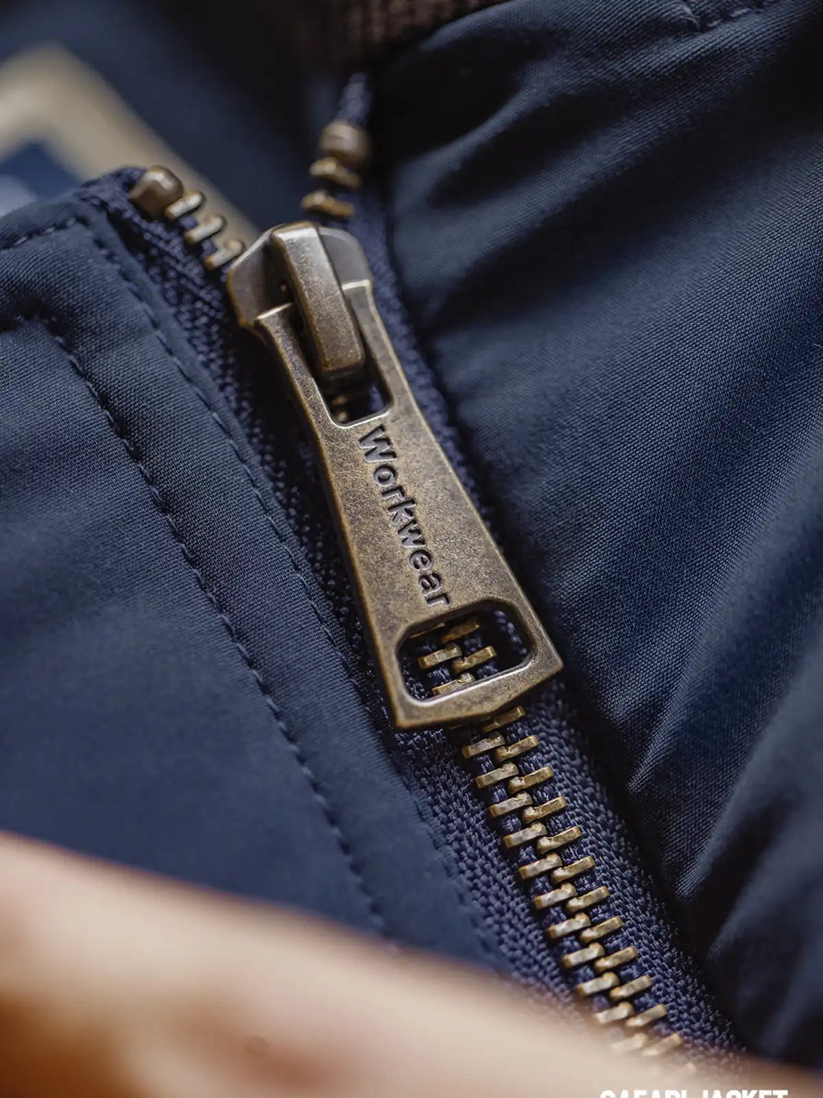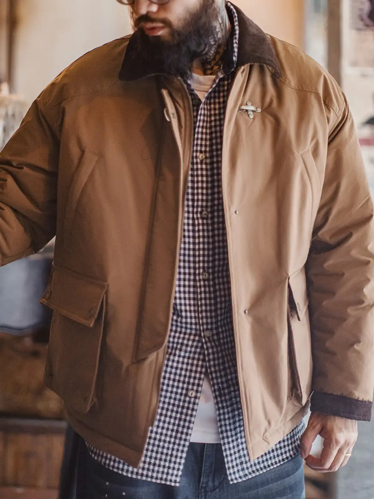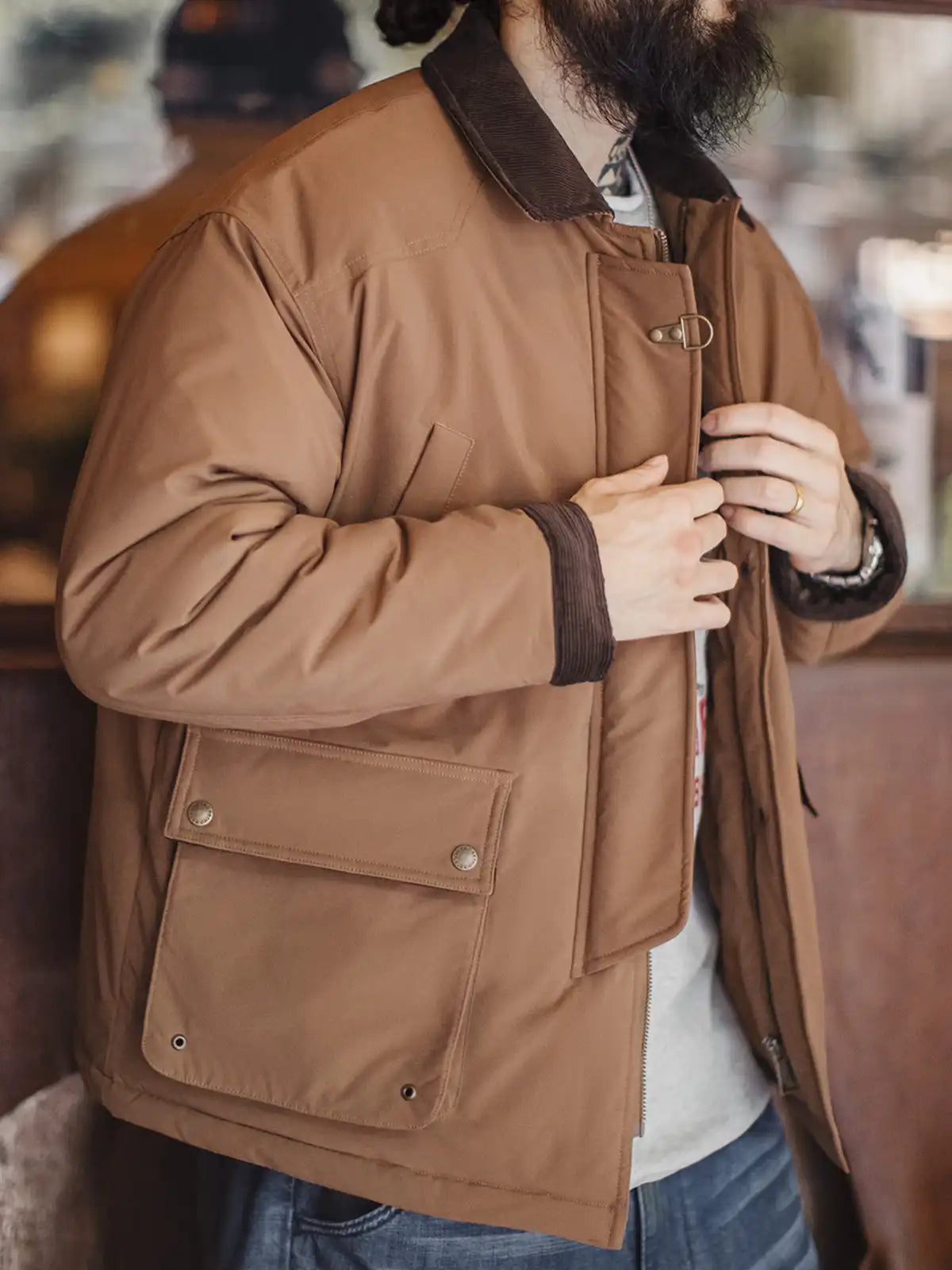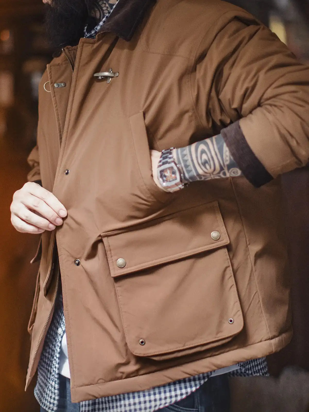 19世紀末に誕生したハンティングジャケットをベースに、アウトドア紳士のための実用美を現代的に再構築した一着。防風・耐摩耗性に優れた100%ポリエステル素材を使用し、140g/m²の軽量感と滑らかな肌触りを両立。フロントは金属トグルフック+比翼仕立てのYKKジッパー仕様で、機能と意匠のバランスが秀逸。襟・袖口・裾裏にはコーデュロイ切り替えを施し、クラシックな温かみを演出。大容量のフラップポケットと斜めスリットポケットが実用性を支え、短丈のリラックスシルエットが重ね着にも対応。街でもフィールドでも“探検者”のように軽快に羽織れる万能ジャケット。