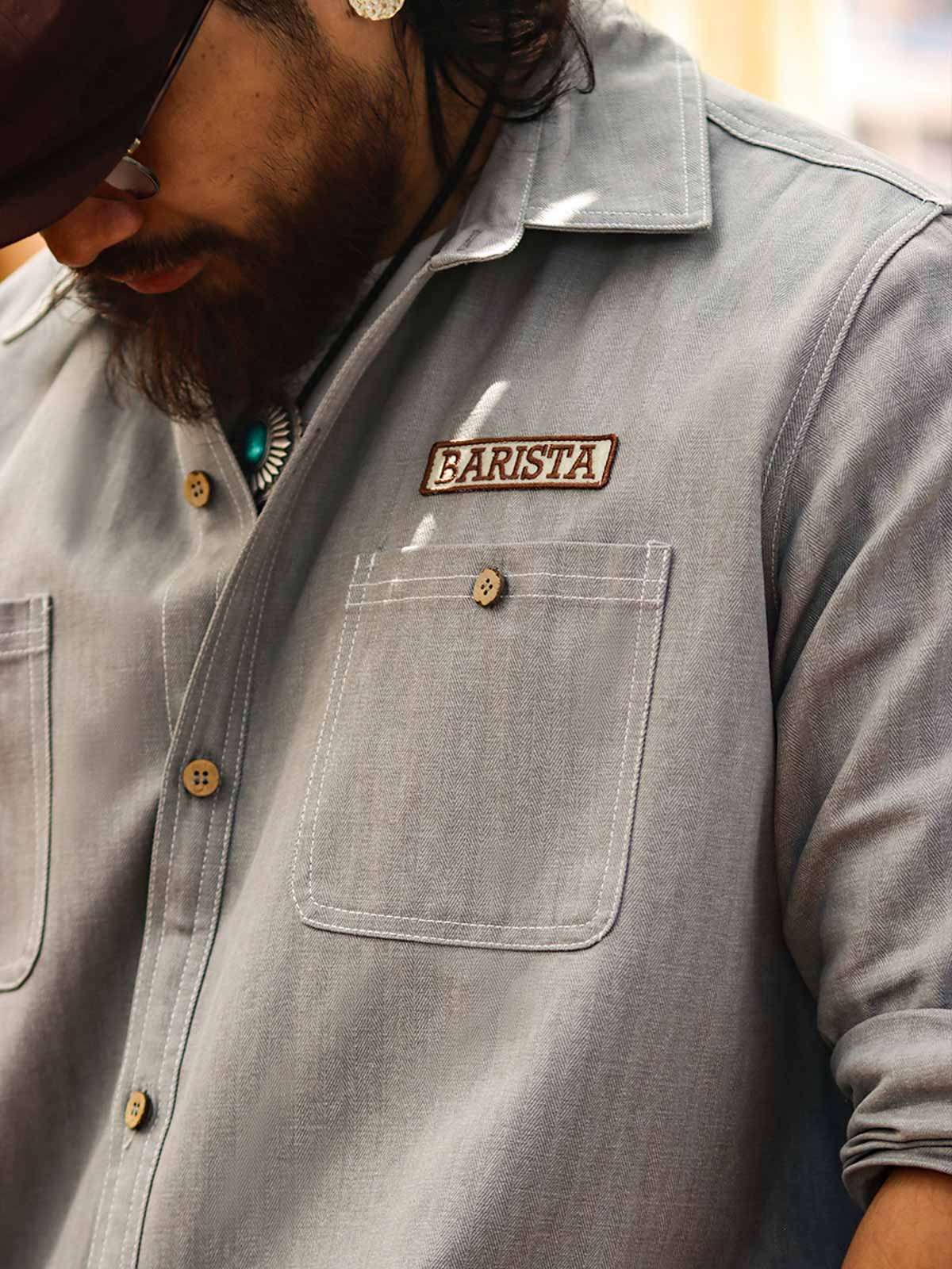 このバリスタ ワークシャツは、厚手の100%コットン生地を使用し、耐久性と独特の質感を持っています。アメリカンカジュアルスタイルを基調としながら、ゆとりのあるシルエットでバリスタの動きやすさを確保。胸元に施された「BARISTA」刺繍パッチが、ユニークなポイントとなっています。また、コルクボタンのディテールが全体のデザインを引き立て、実用性とファッション性を両立。バリスタのプロフェッショナルな雰囲気を感じさせる一着でありながら、ヴィンテージファッション愛好者にもおすすめのアイテムです。