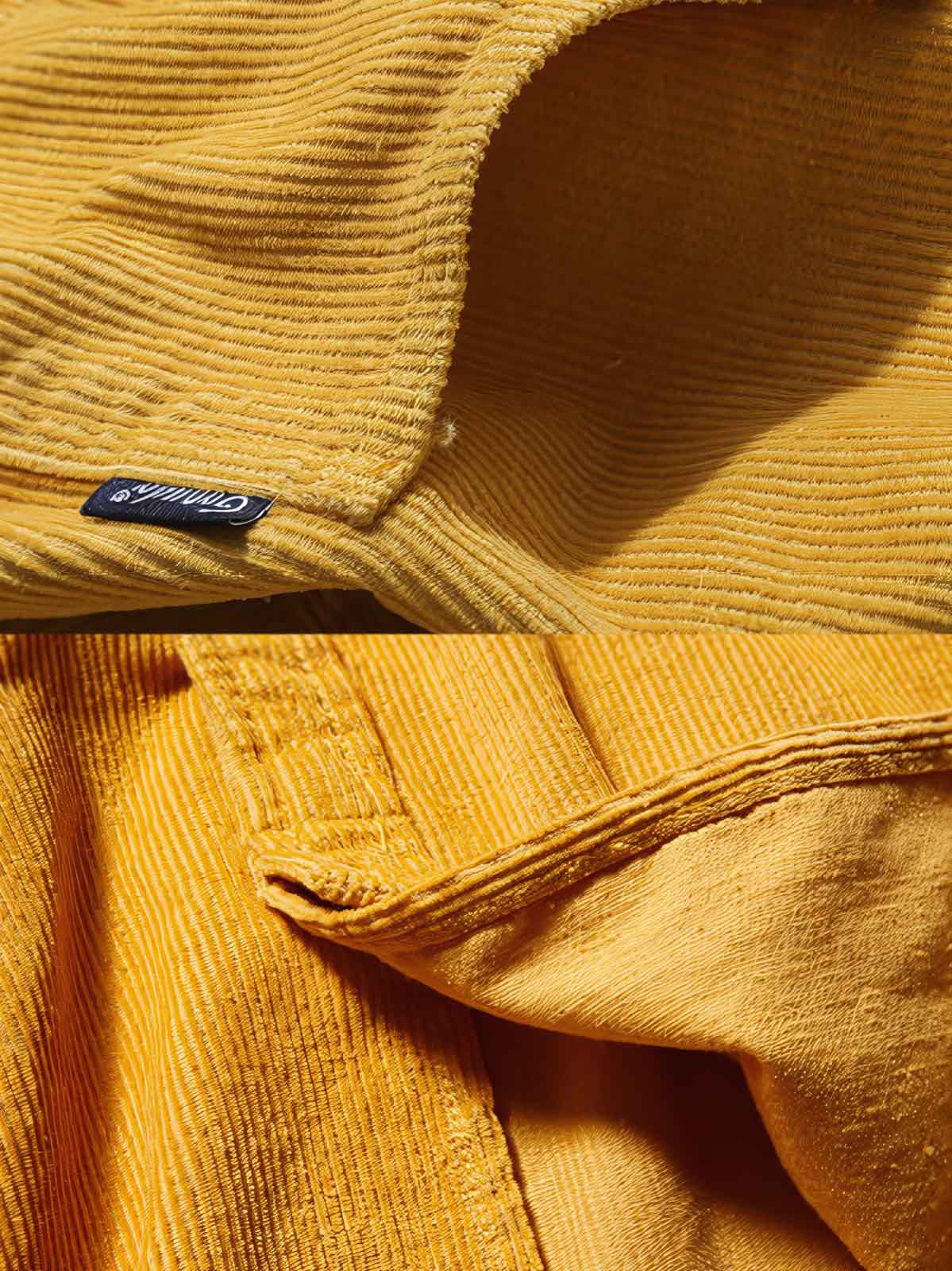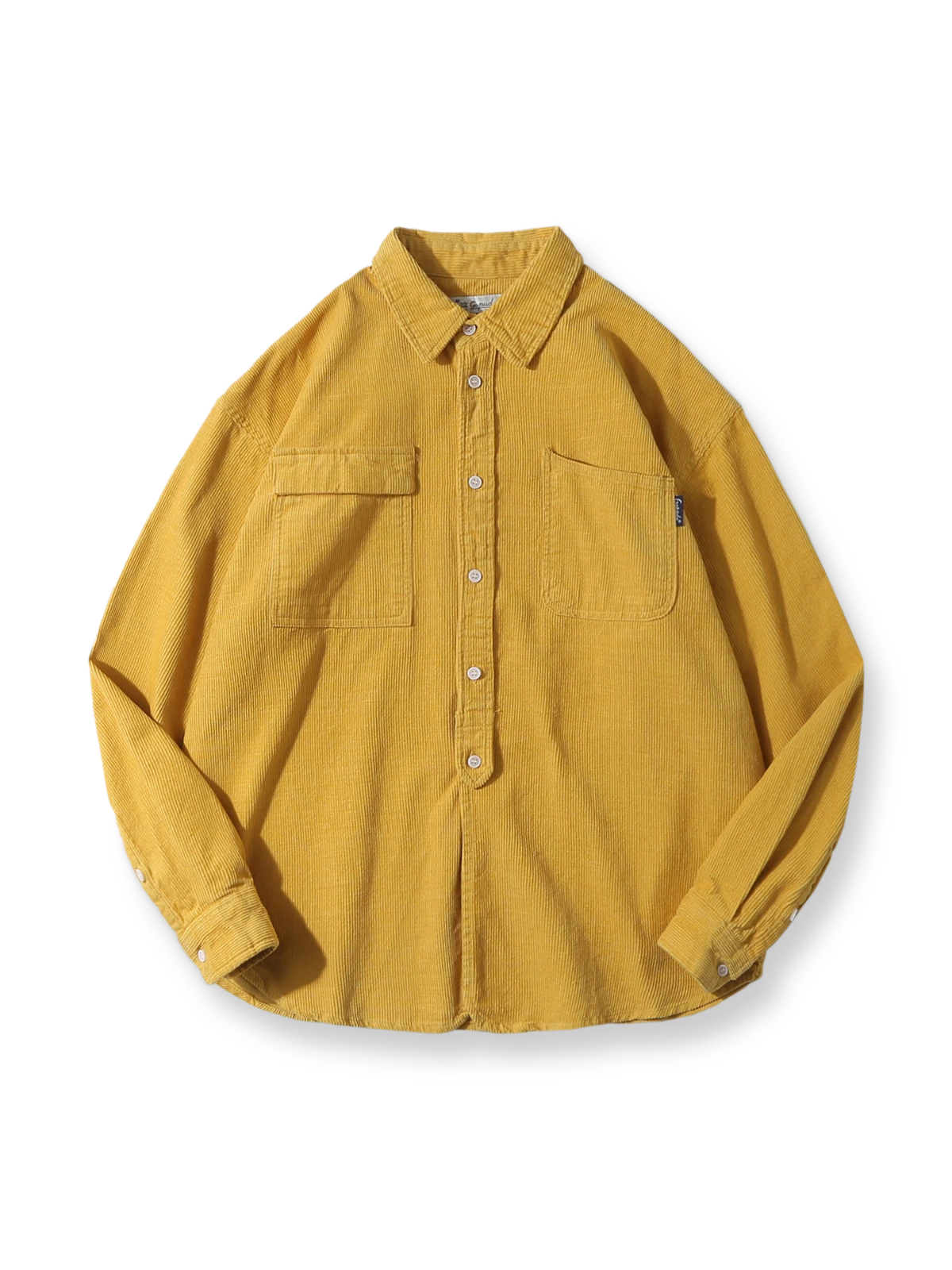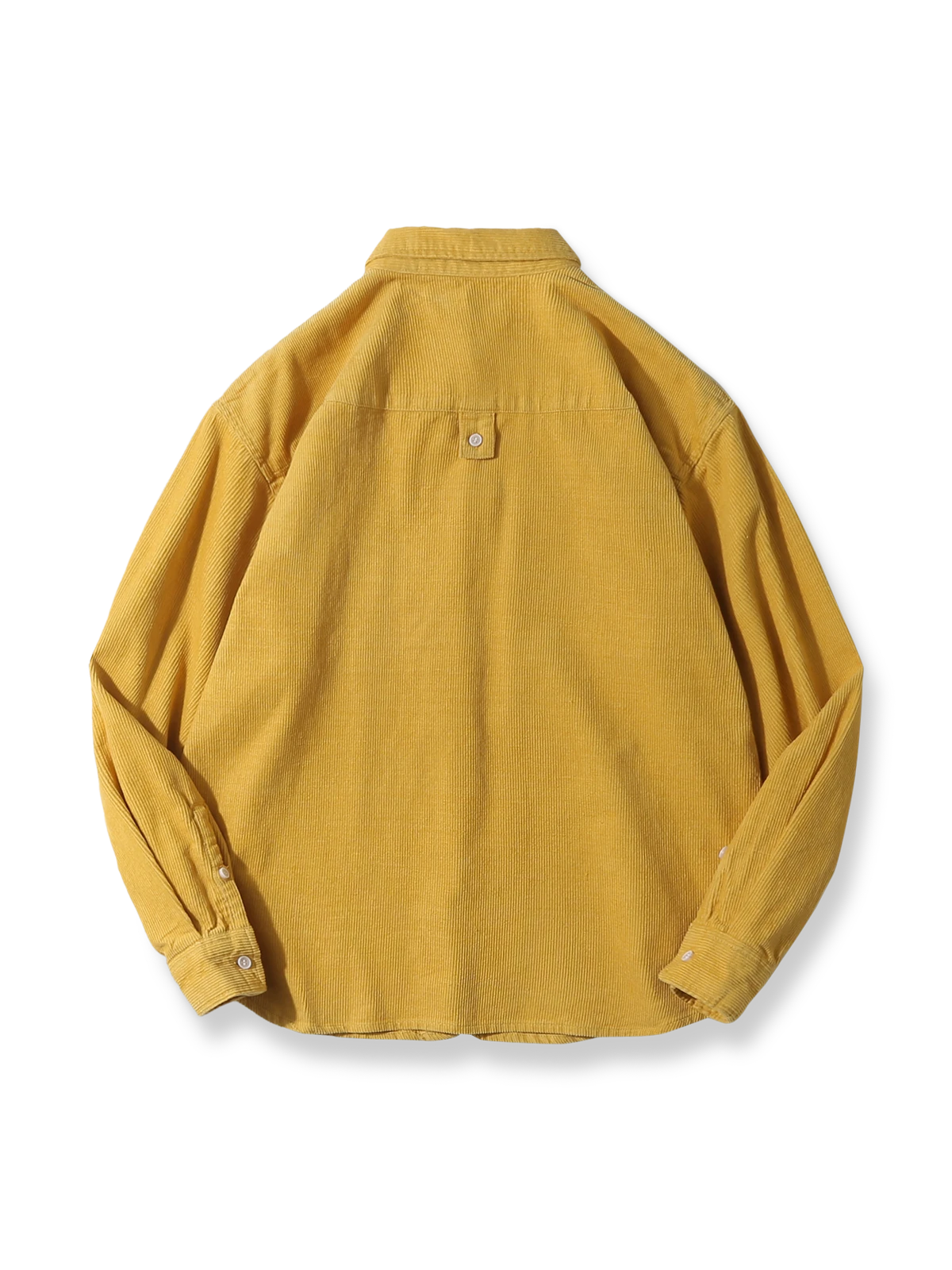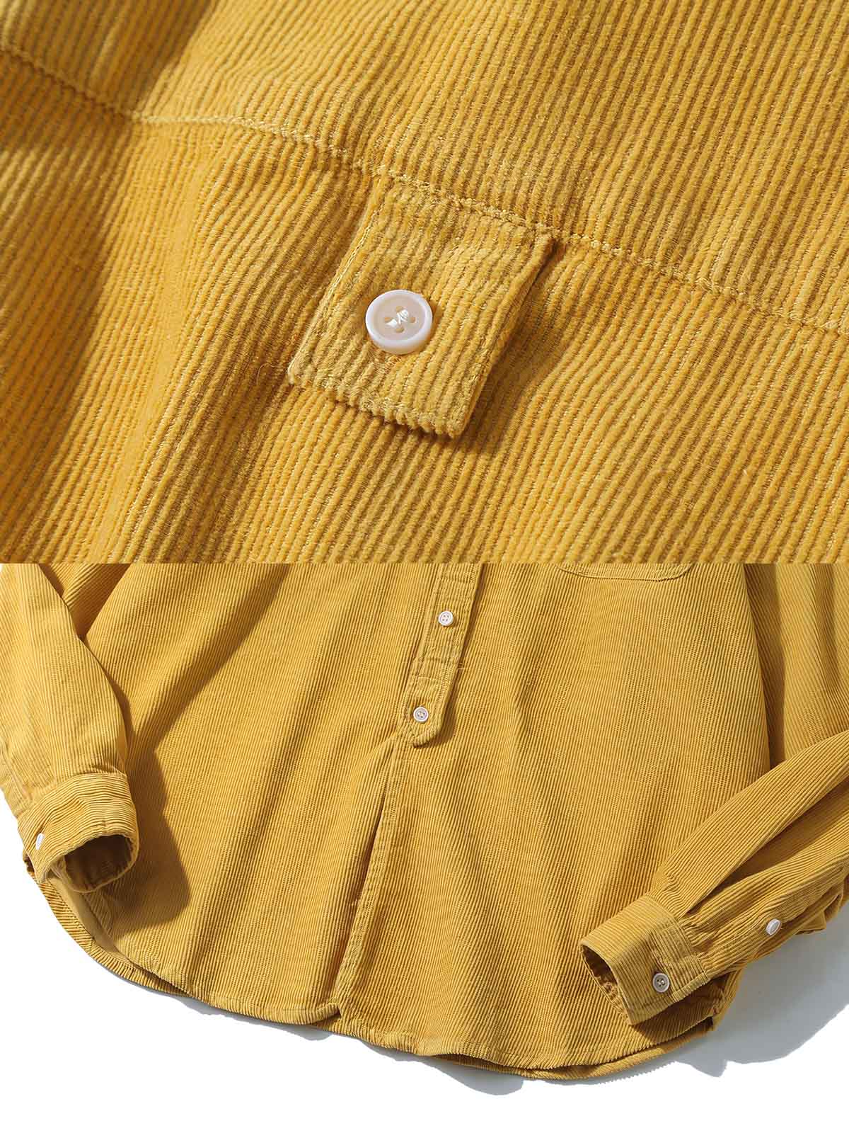 このコーデュロイシャツは、暖かみのある質感と目を引くイエロー、ホワイトとブラウンカラーが特徴です。フロントのボタンダウンと胸ポケットが実用性を高めています。シンプルでありながら、細部のディテールにも注意が払われています。