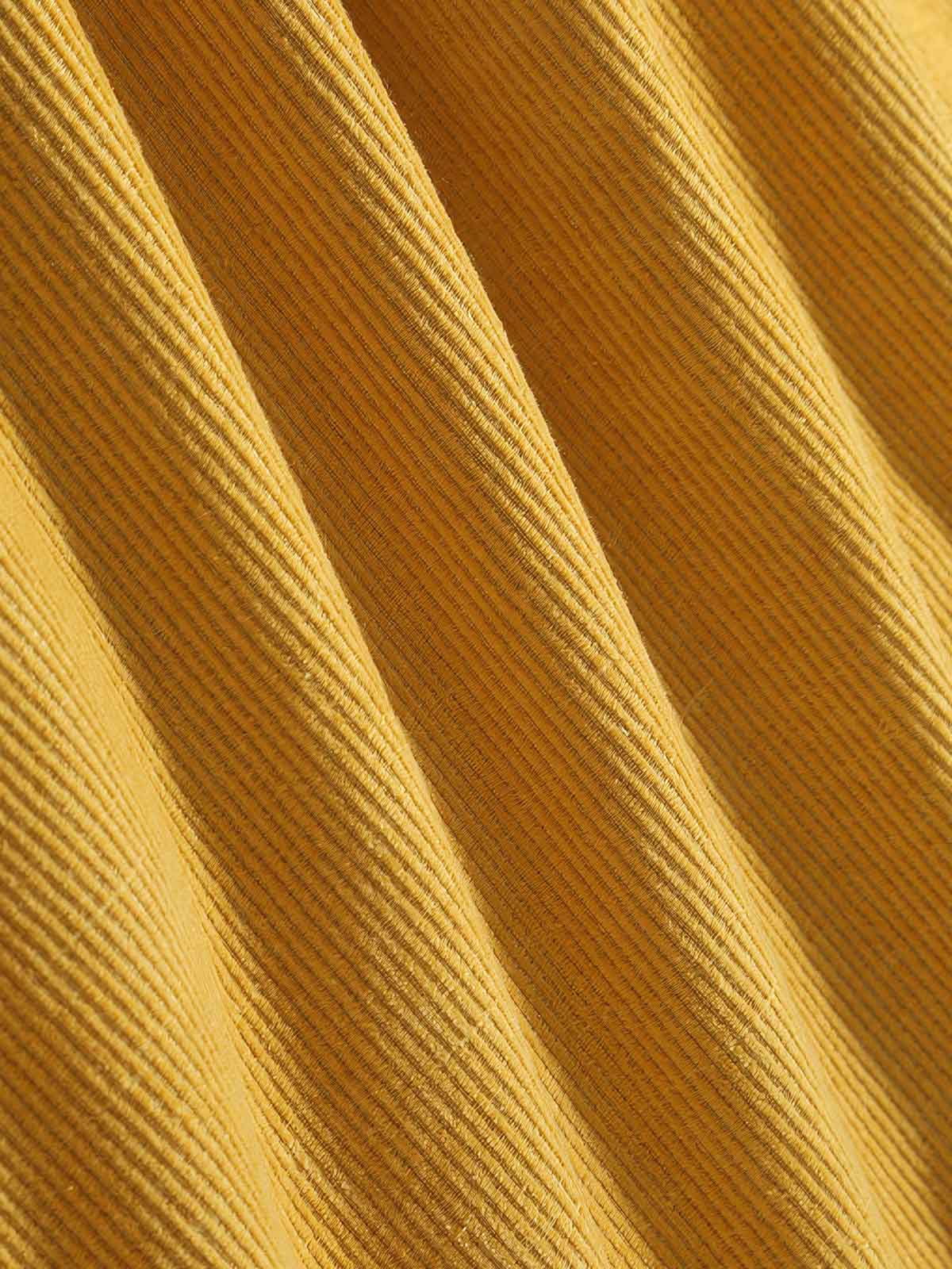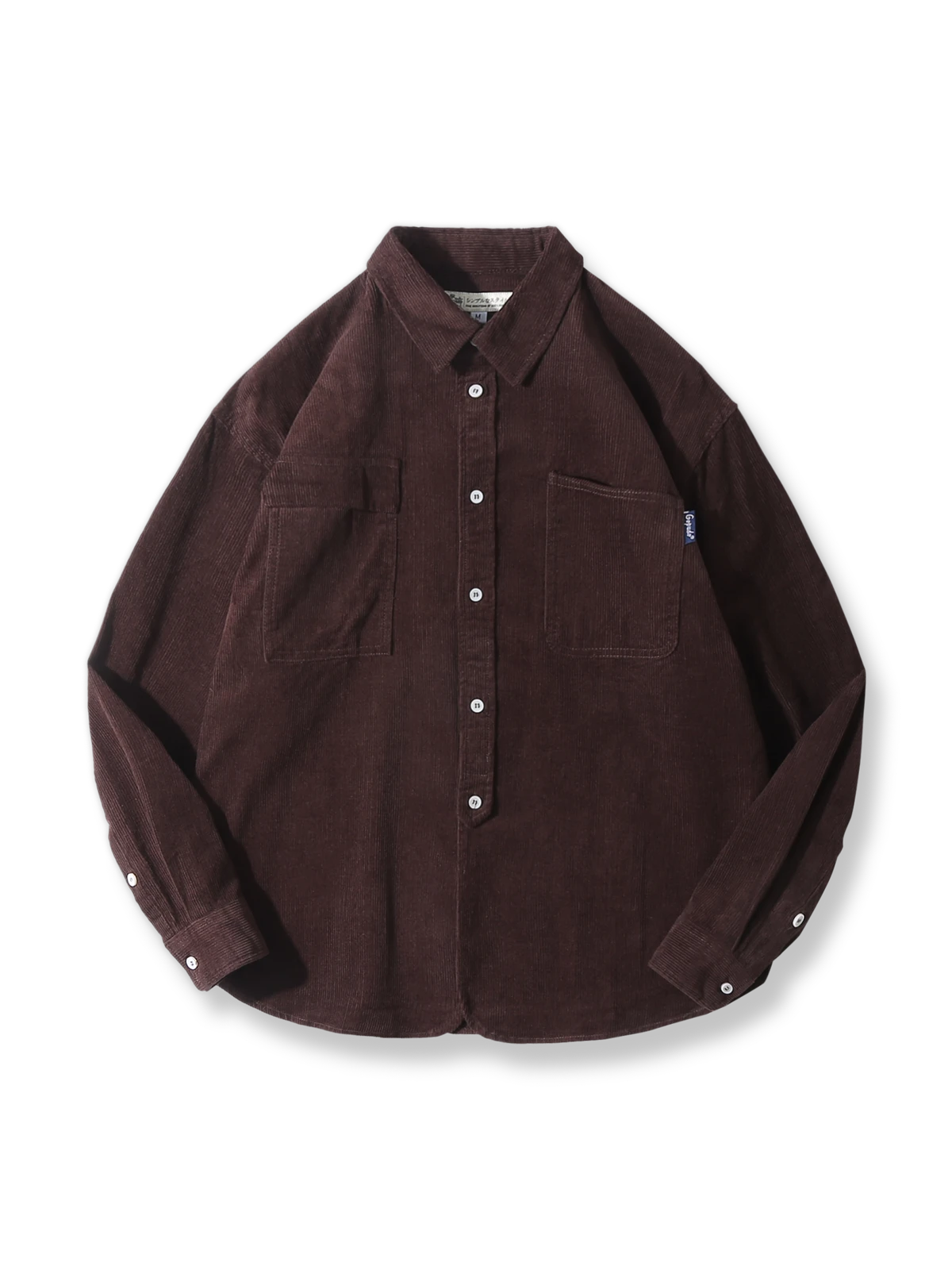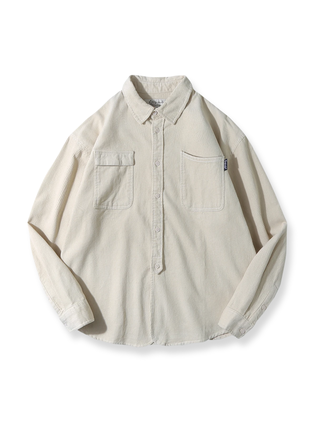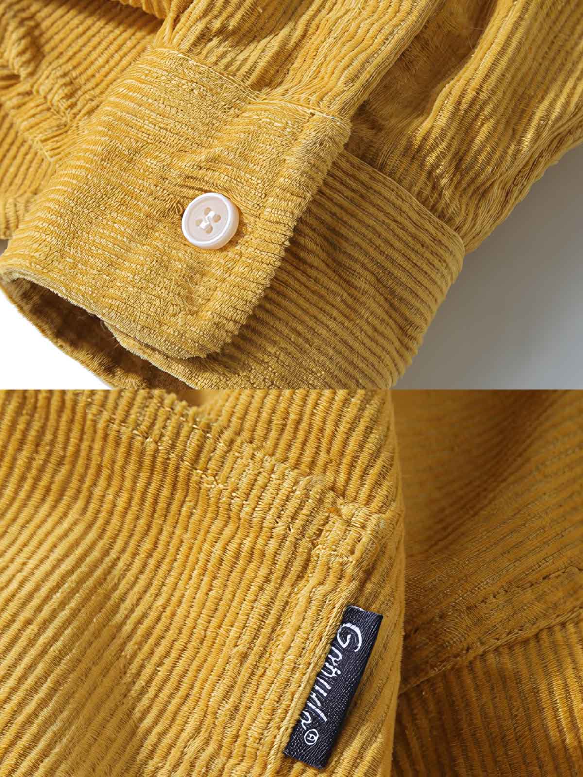 このコーデュロイシャツは、暖かみのある質感と目を引くイエロー、ホワイトとブラウンカラーが特徴です。フロントのボタンダウンと胸ポケットが実用性を高めています。シンプルでありながら、細部のディテールにも注意が払われています。