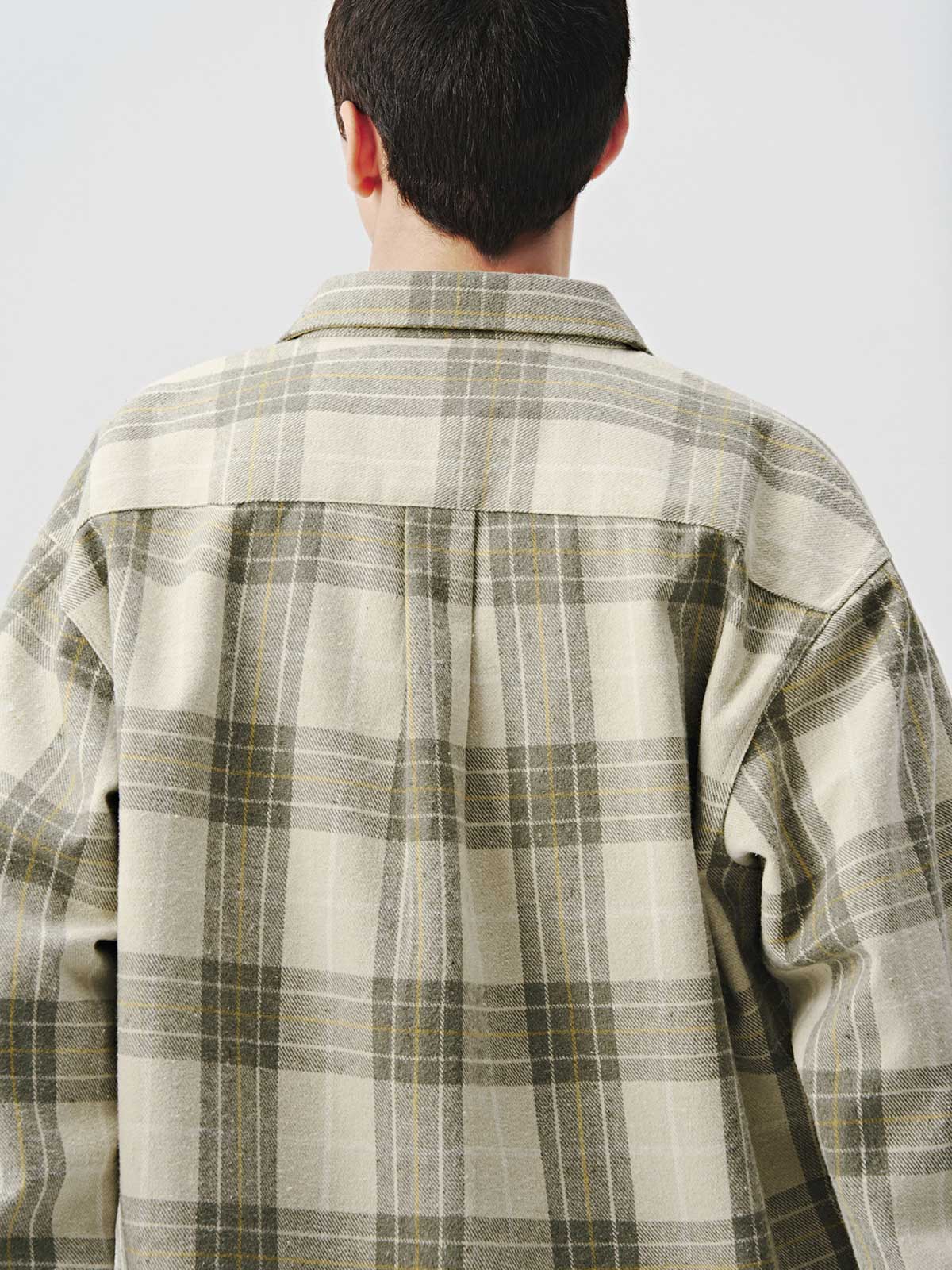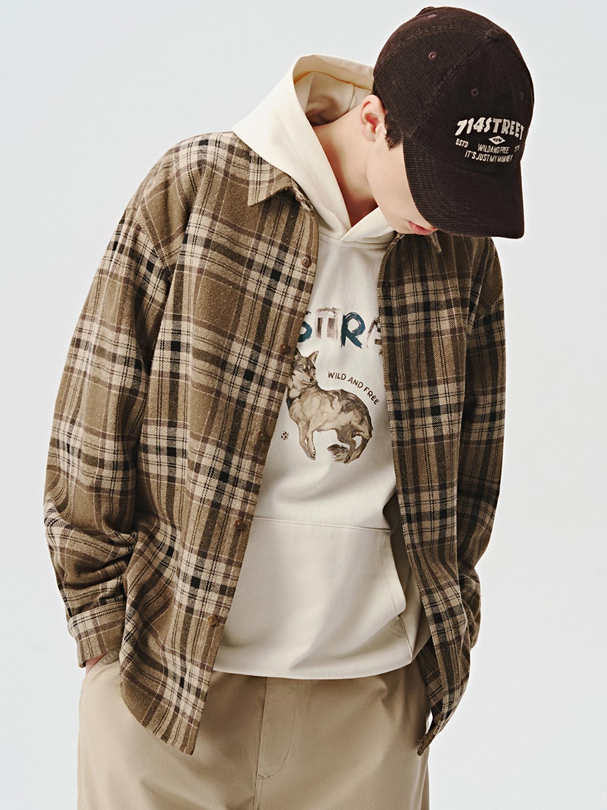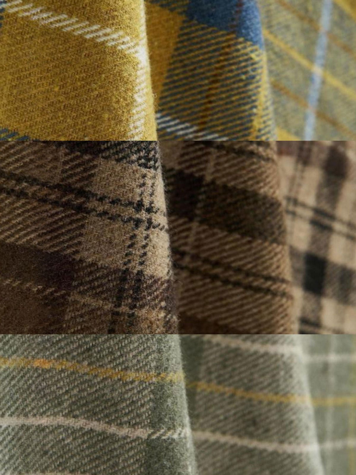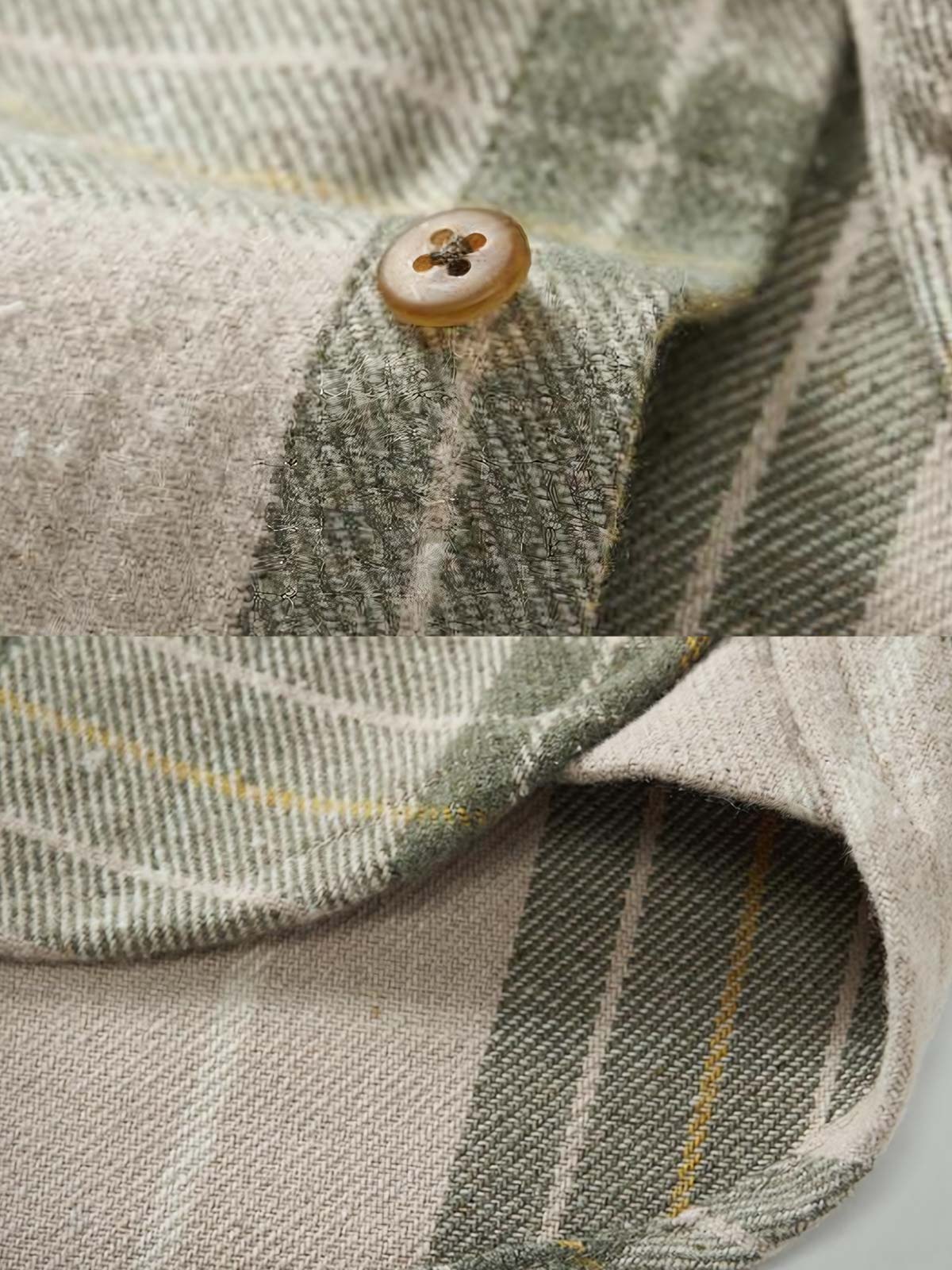 このシャツは、特別織りの厚手チェック生地を使用し、表面に軽い起毛が施された高い保温性を持つ一着です。ヴィンテージスタイルのデザインで、琥珀色のボタンが高級感をプラス。ゆったりとしたシルエットとクラシックな尖った襟が、立体感のあるスタイルを演出します。肩や袖の縫い目に施された包み縫いのダブルステッチが、耐久性とデザイン性を強調し、細部まで丁寧な仕上がりです。弧形の裾と三角形の補強縫いが、リラックスしたシルエットを引き立て、快適さとおしゃれさを両立したアイテムです。