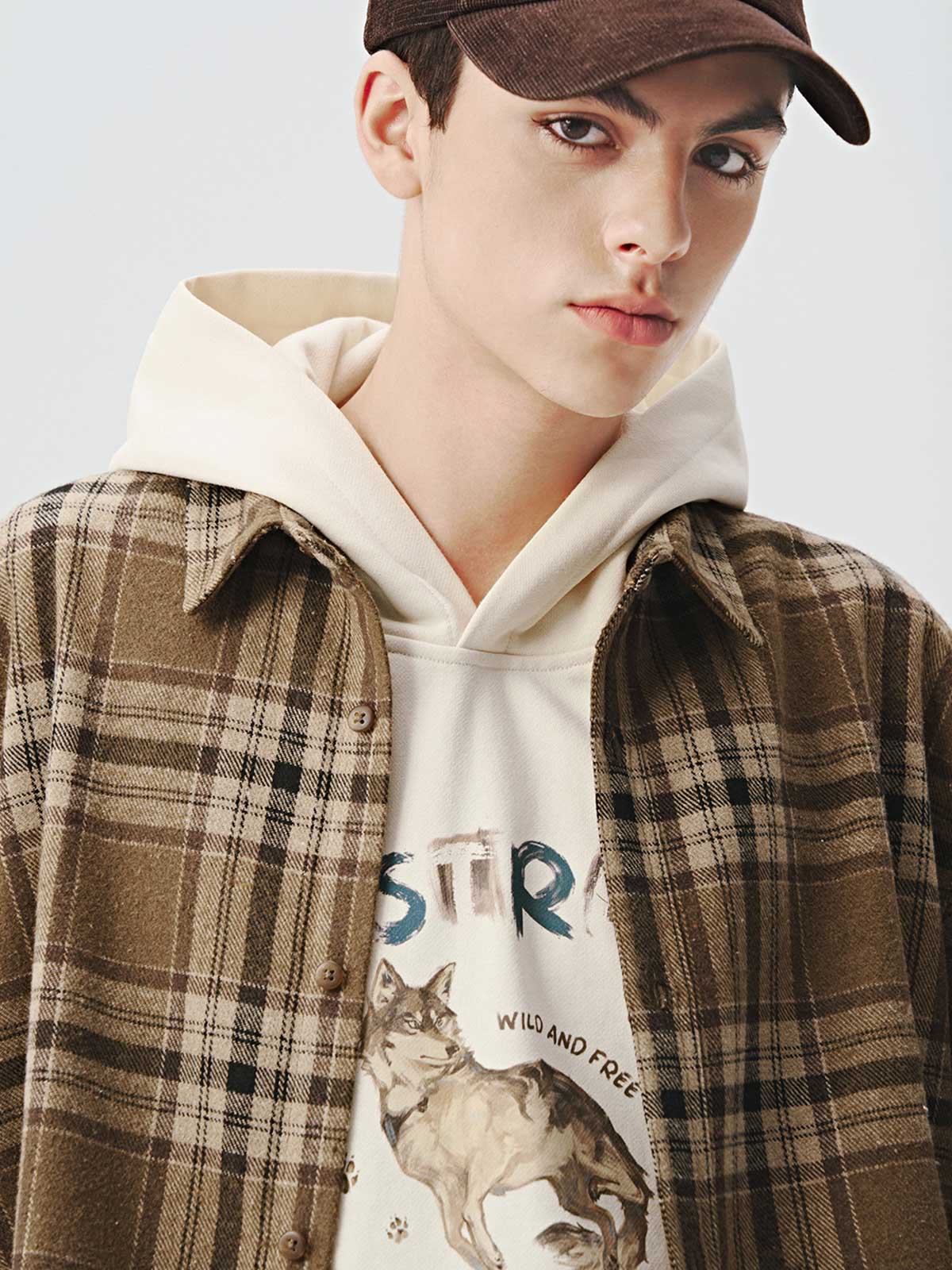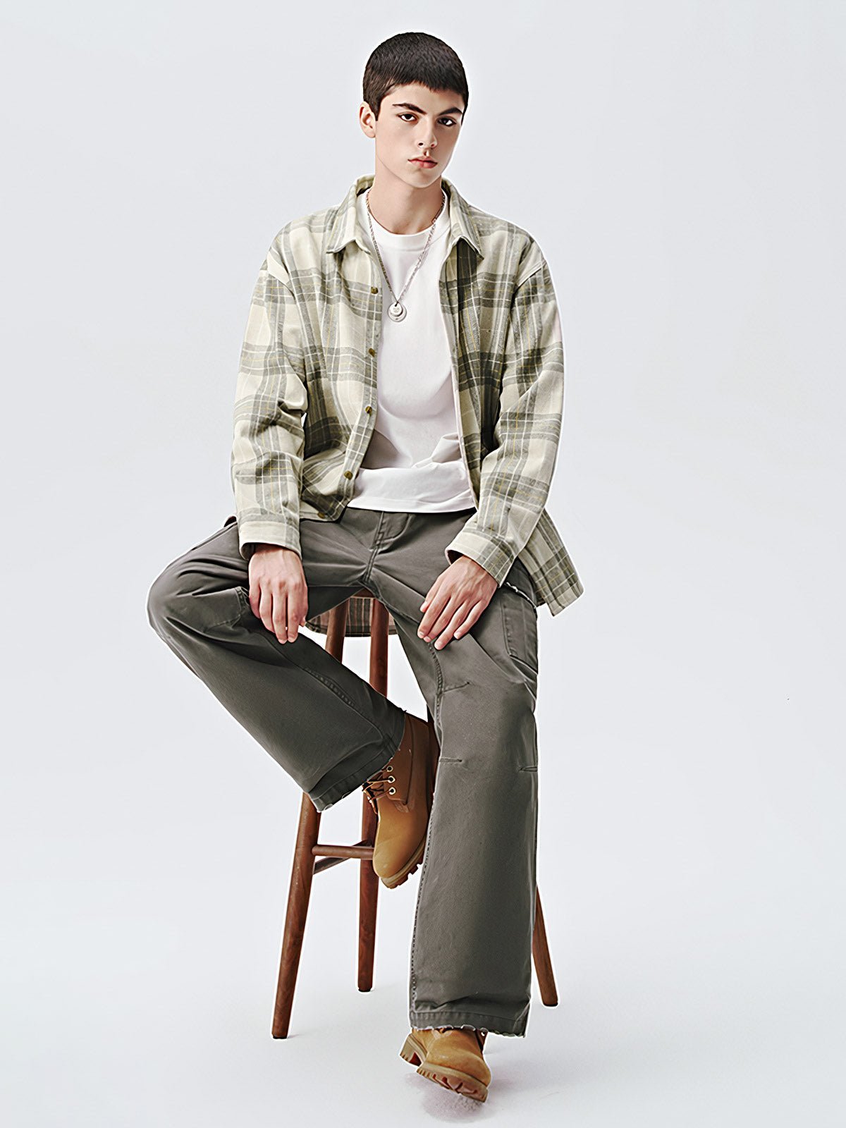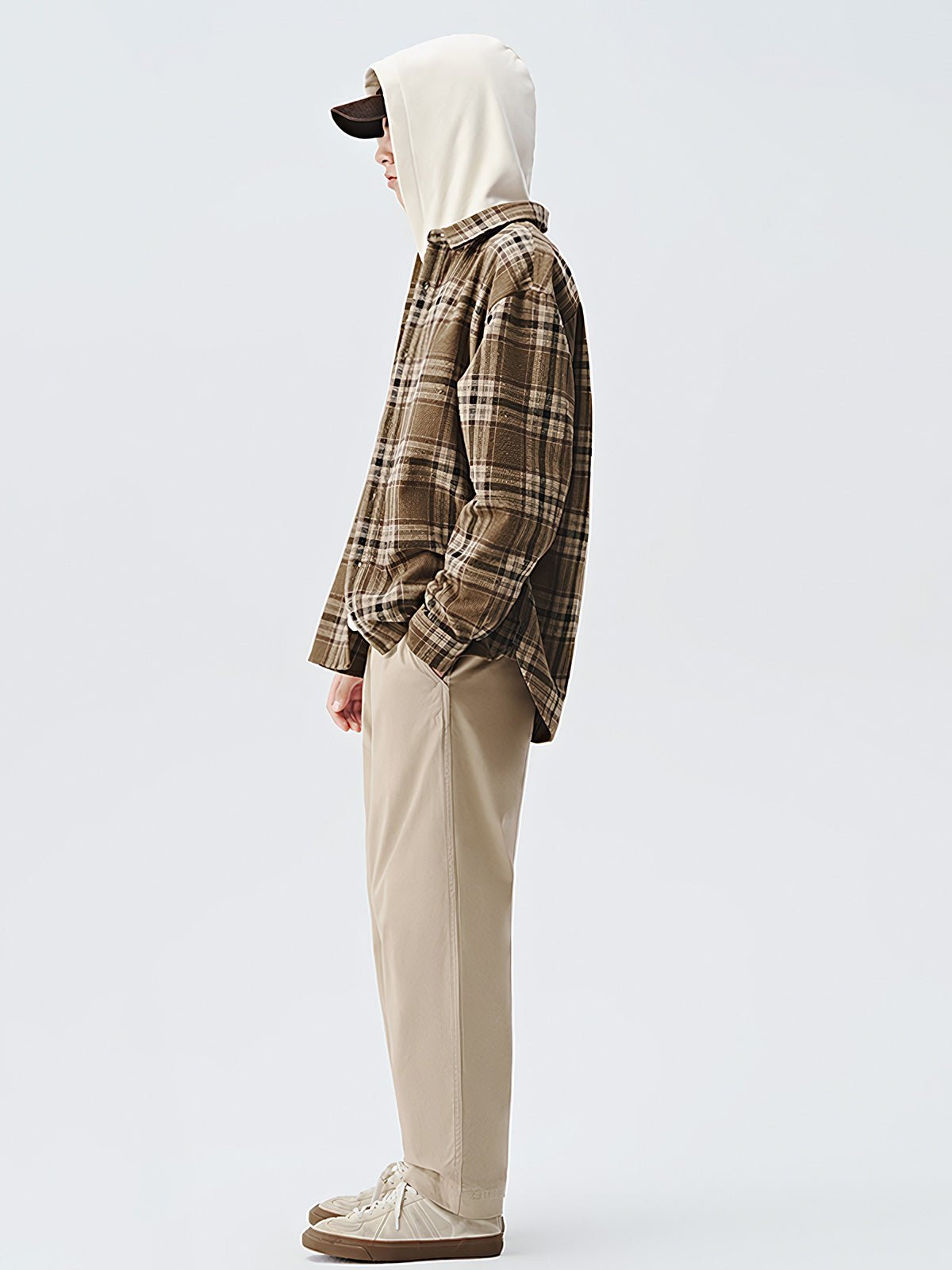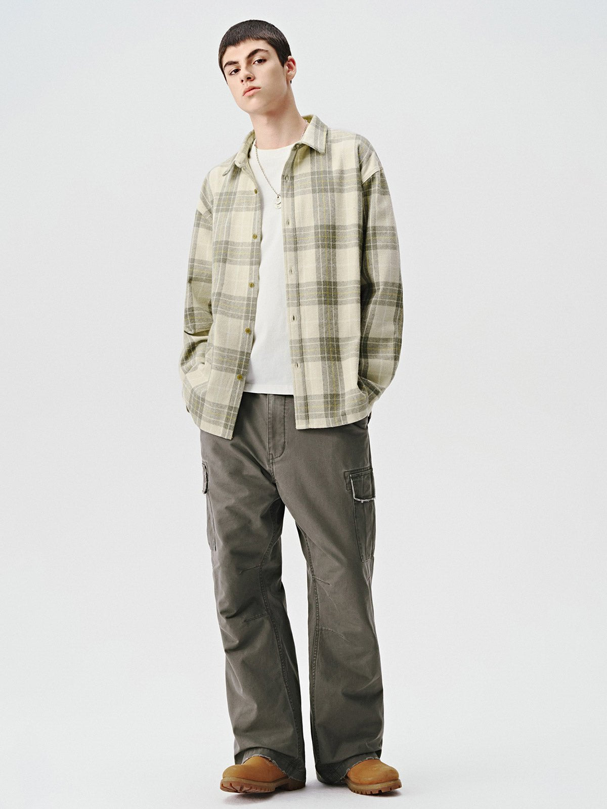 このシャツは、特別織りの厚手チェック生地を使用し、表面に軽い起毛が施された高い保温性を持つ一着です。ヴィンテージスタイルのデザインで、琥珀色のボタンが高級感をプラス。ゆったりとしたシルエットとクラシックな尖った襟が、立体感のあるスタイルを演出します。肩や袖の縫い目に施された包み縫いのダブルステッチが、耐久性とデザイン性を強調し、細部まで丁寧な仕上がりです。弧形の裾と三角形の補強縫いが、リラックスしたシルエットを引き立て、快適さとおしゃれさを両立したアイテムです。
