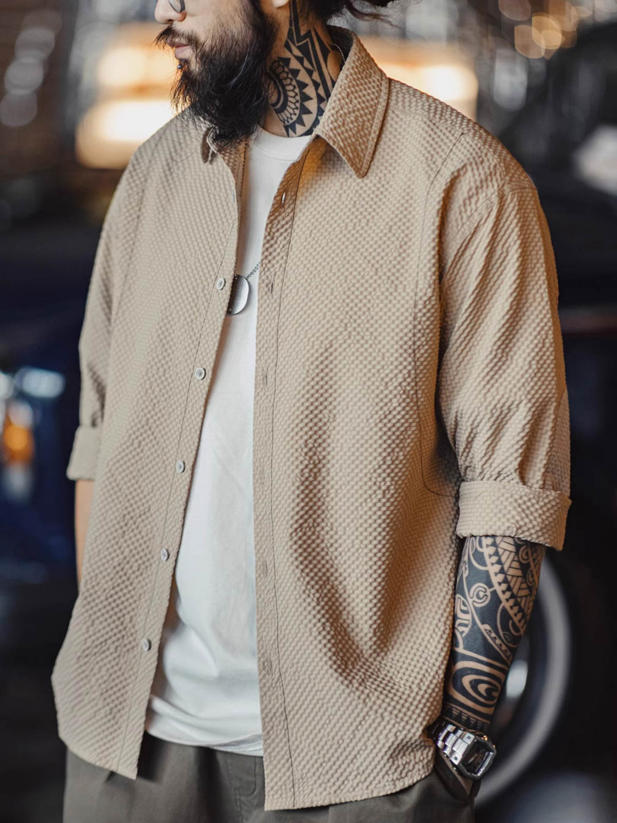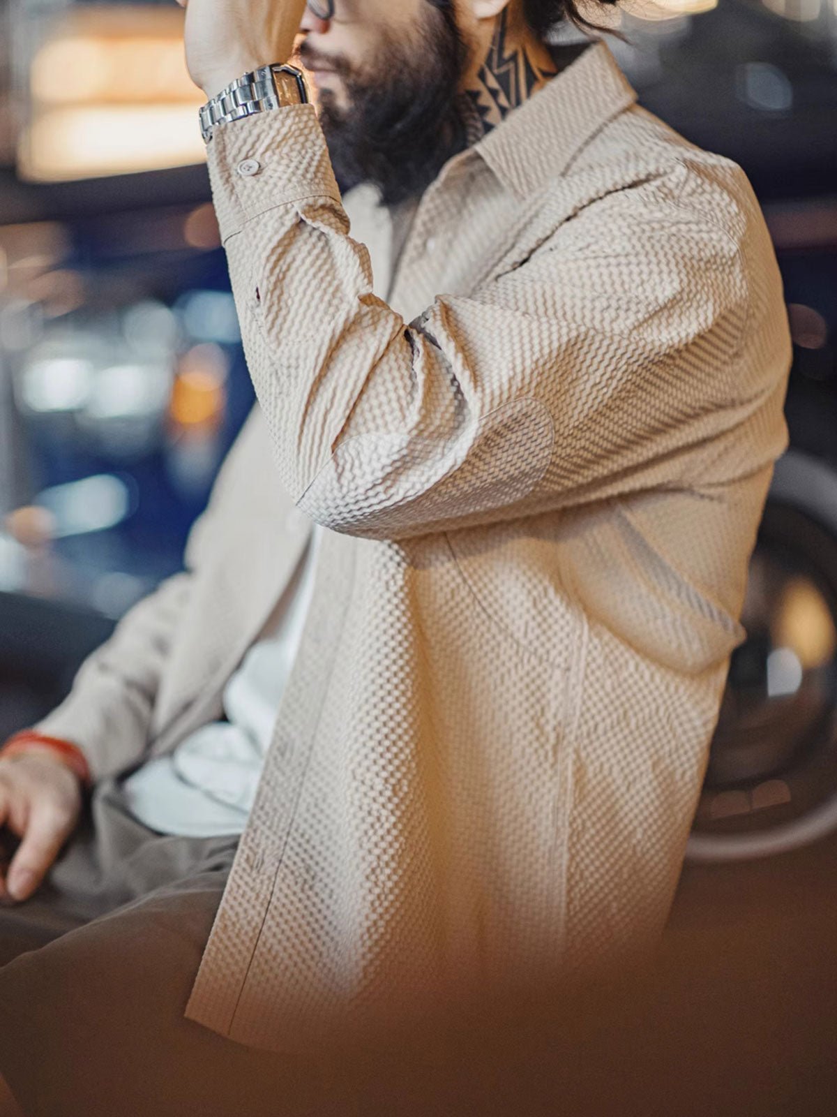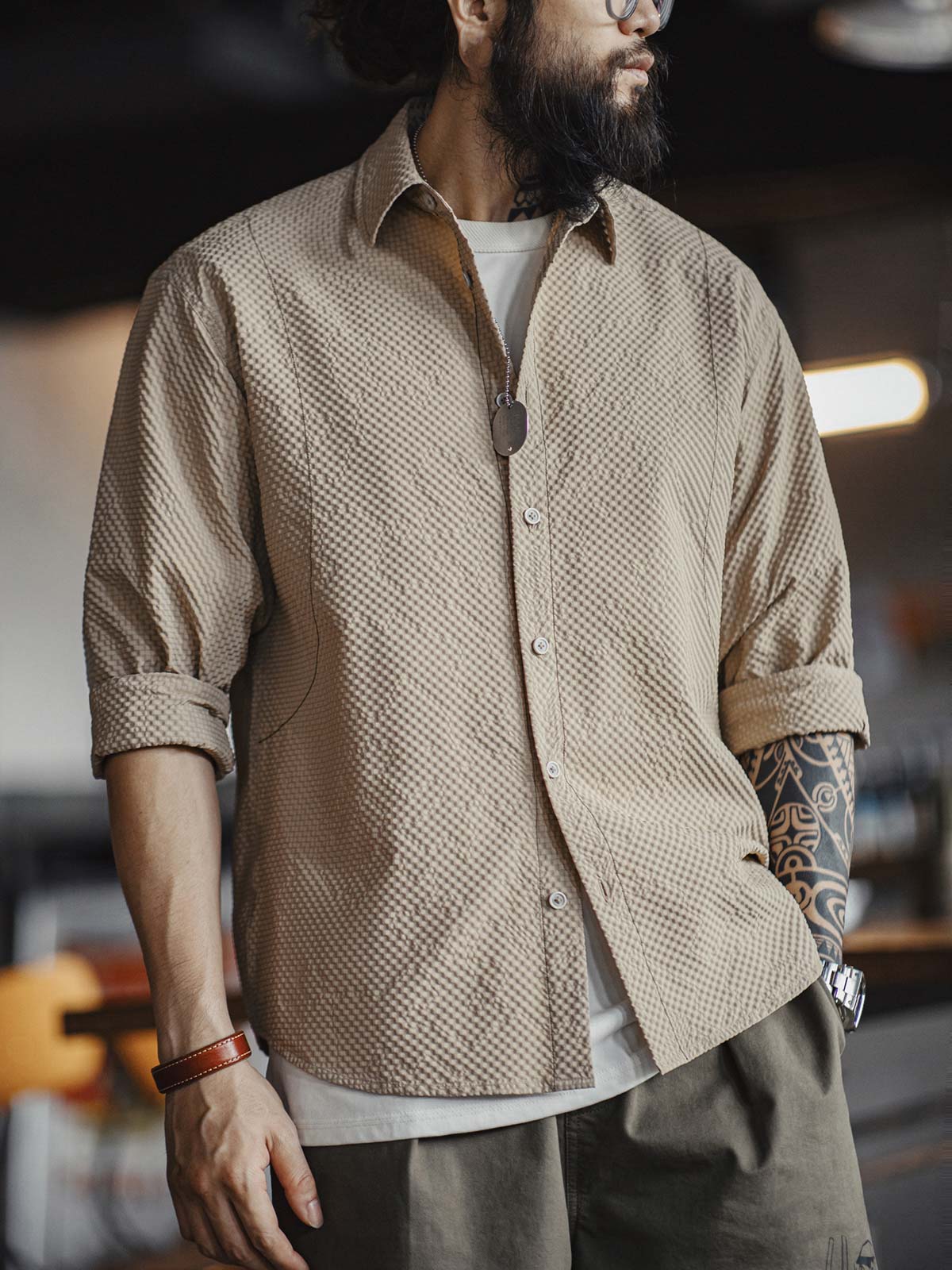 この長袖シャツは、100%ポリエステルのクレープ素材を使用しており、軽やかで通気性が良く、肌に優しいです。独特な3D方格デザインが視覚的な立体感を強調し、シャツに質感を加えます。形態安定加工により、シャツがしっかりと形を保ち、アイロンがけの手間を減らします。シャツカラー、ステッチ装飾、肘パッチの定番デザインが日常、レトロ、ワークスタイルを組み合わせて自由に切り替えられ、さまざまな場面に適しています。クレープ素材は質感を増すだけでなく、快適な着心地も向上させ、機能性とファッション性を兼ね備えたシャツです。
