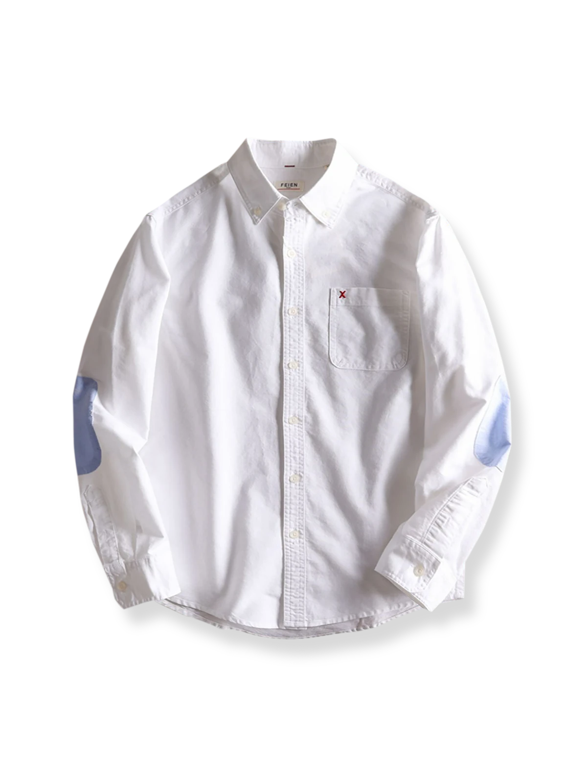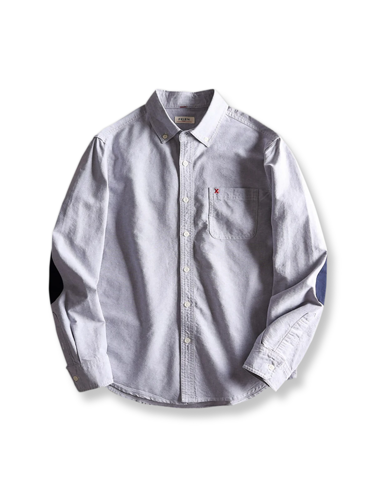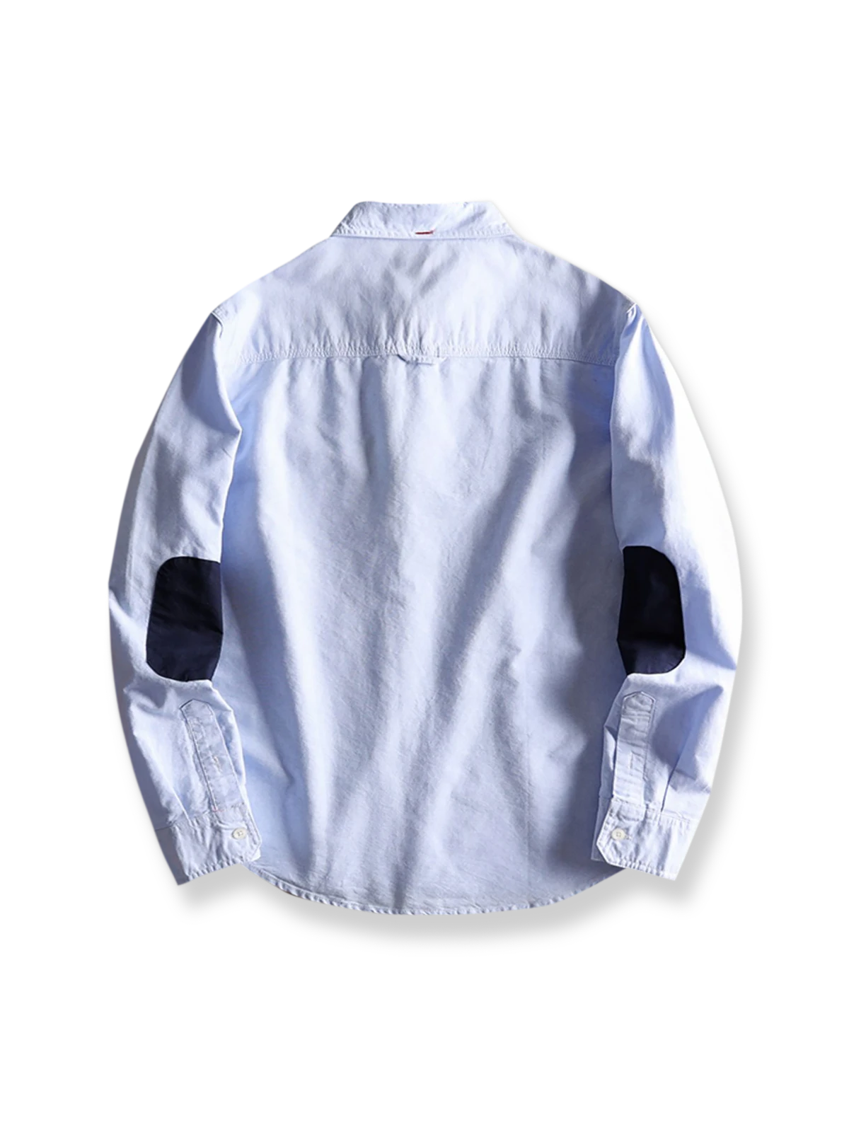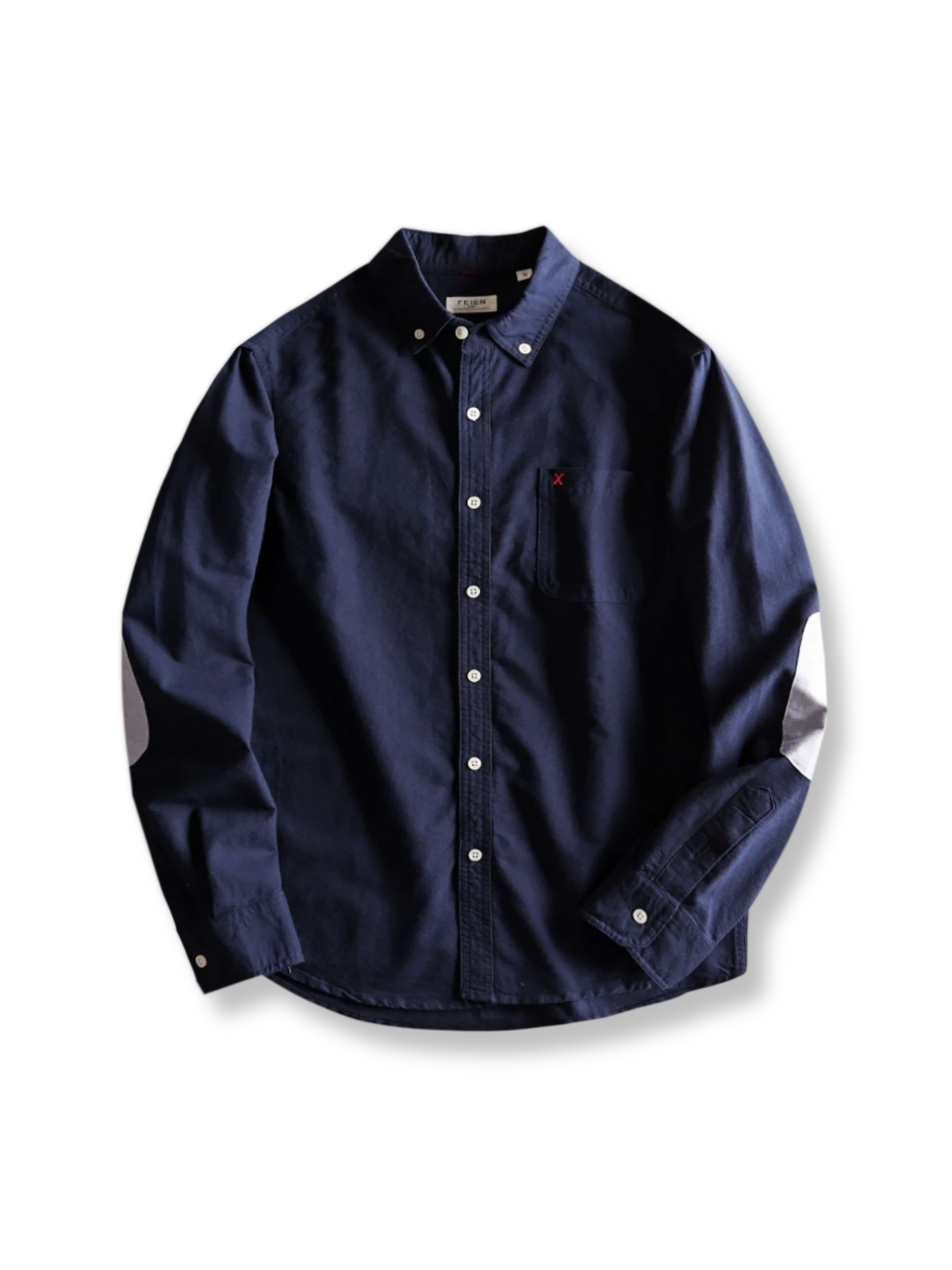 耐久性のある純綿オックスフォード生地を使用しており、シャープな印象とともに、カラーブロックのパッチデザインが洗練されたファッション感を演出します。袖の肘パッチは実用的でありながら、ファッション性も高めています。