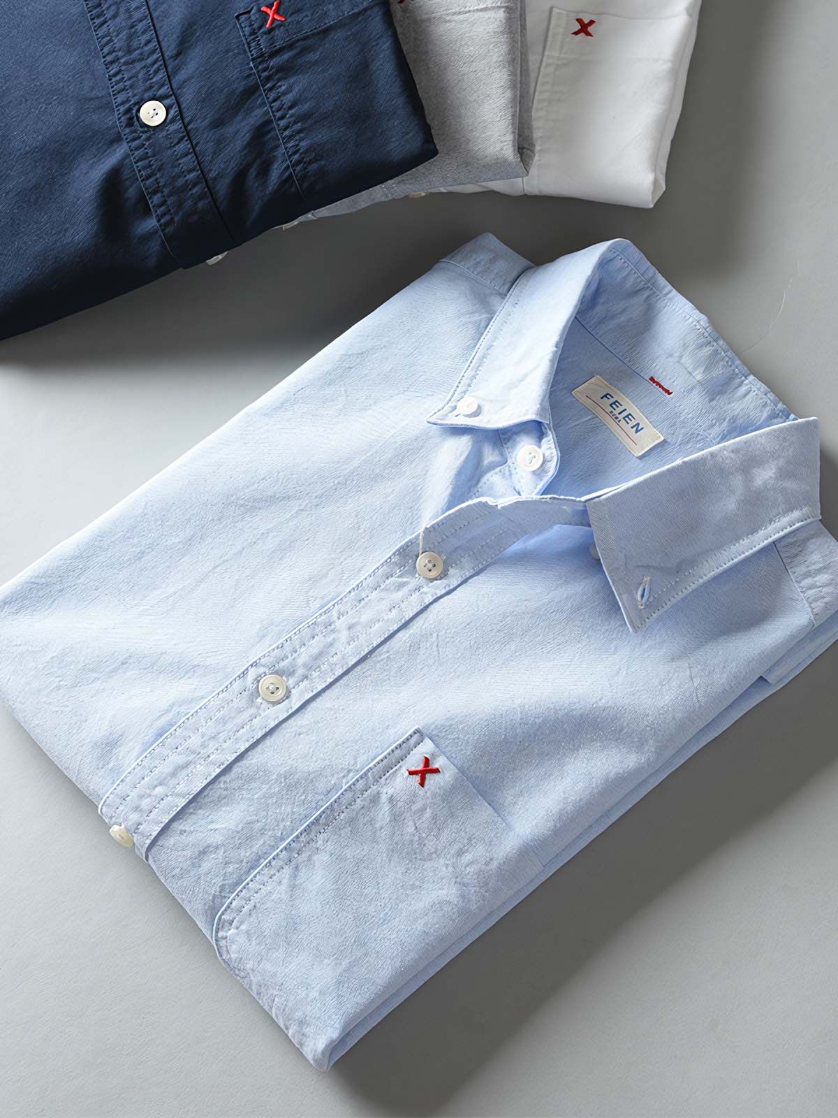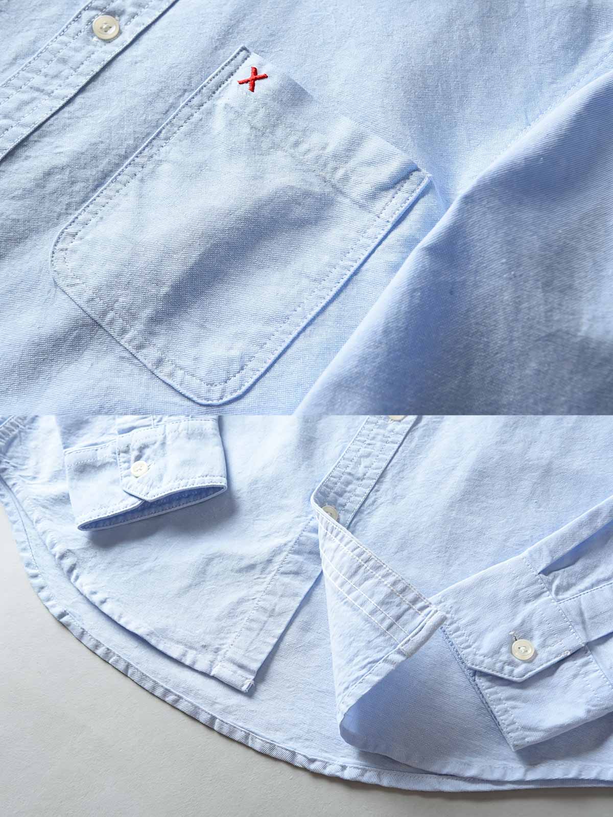 このシャツは「クラシック・リニューアル」というテーマを持ち、19世紀の英国オックスフォード大学の学生服に起源を持つオックスフォードシャツをベースにしています。耐久性とクリスプな質感が特徴で、象徴的なポケットには立体的なX刺繍を施し、現代的な感覚を加えたカラーブロックのパッチが特徴です。