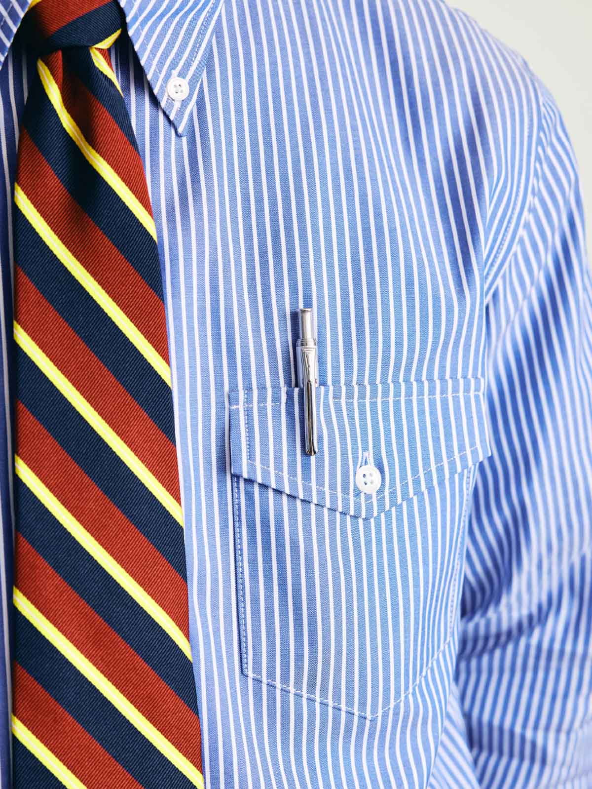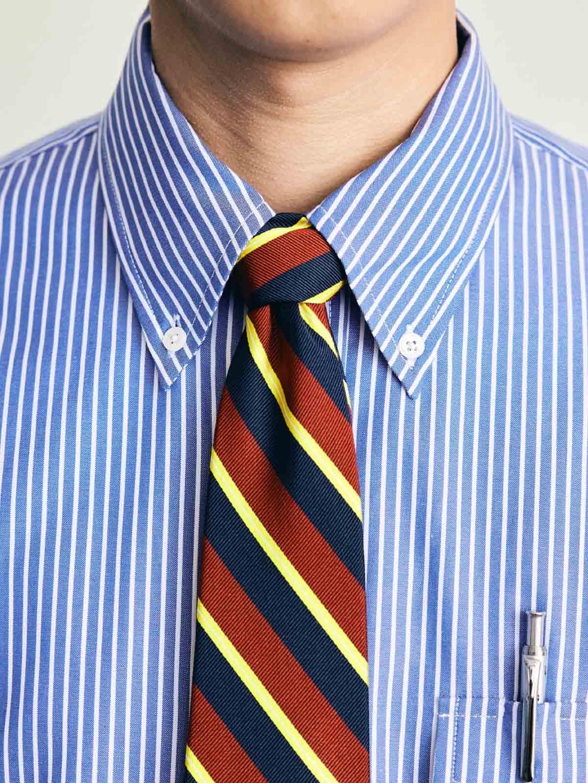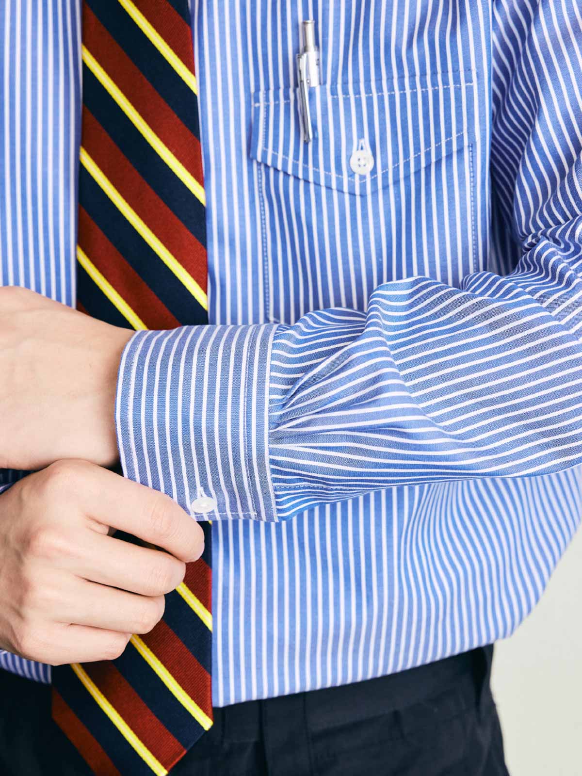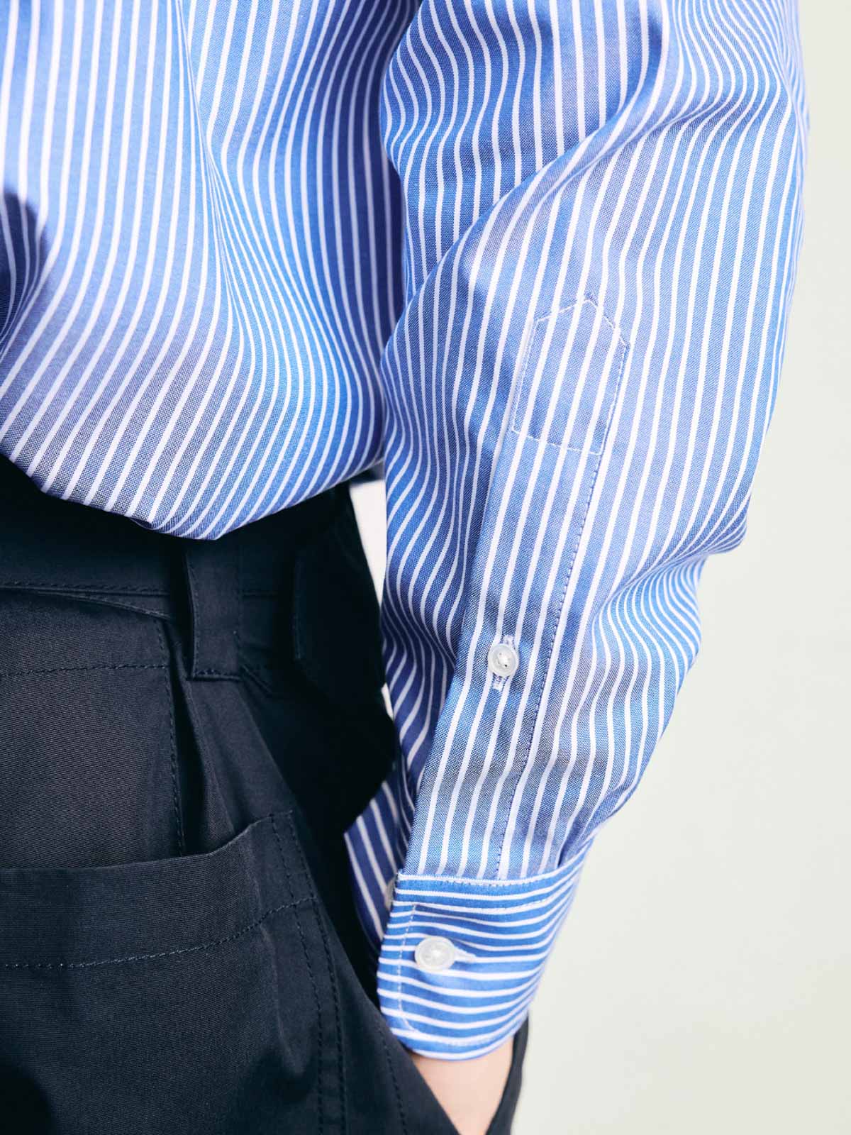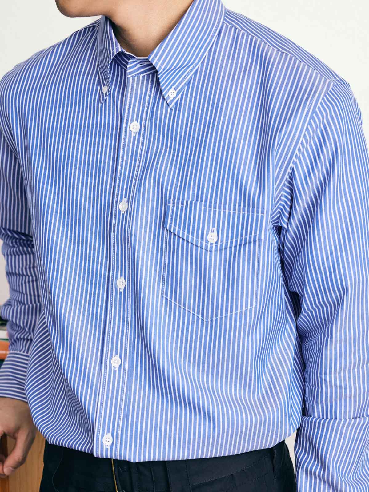 クラシックなデザインと100%コットン素材を採用した、ブルーストライプのボタンダウン長袖シャツ。
