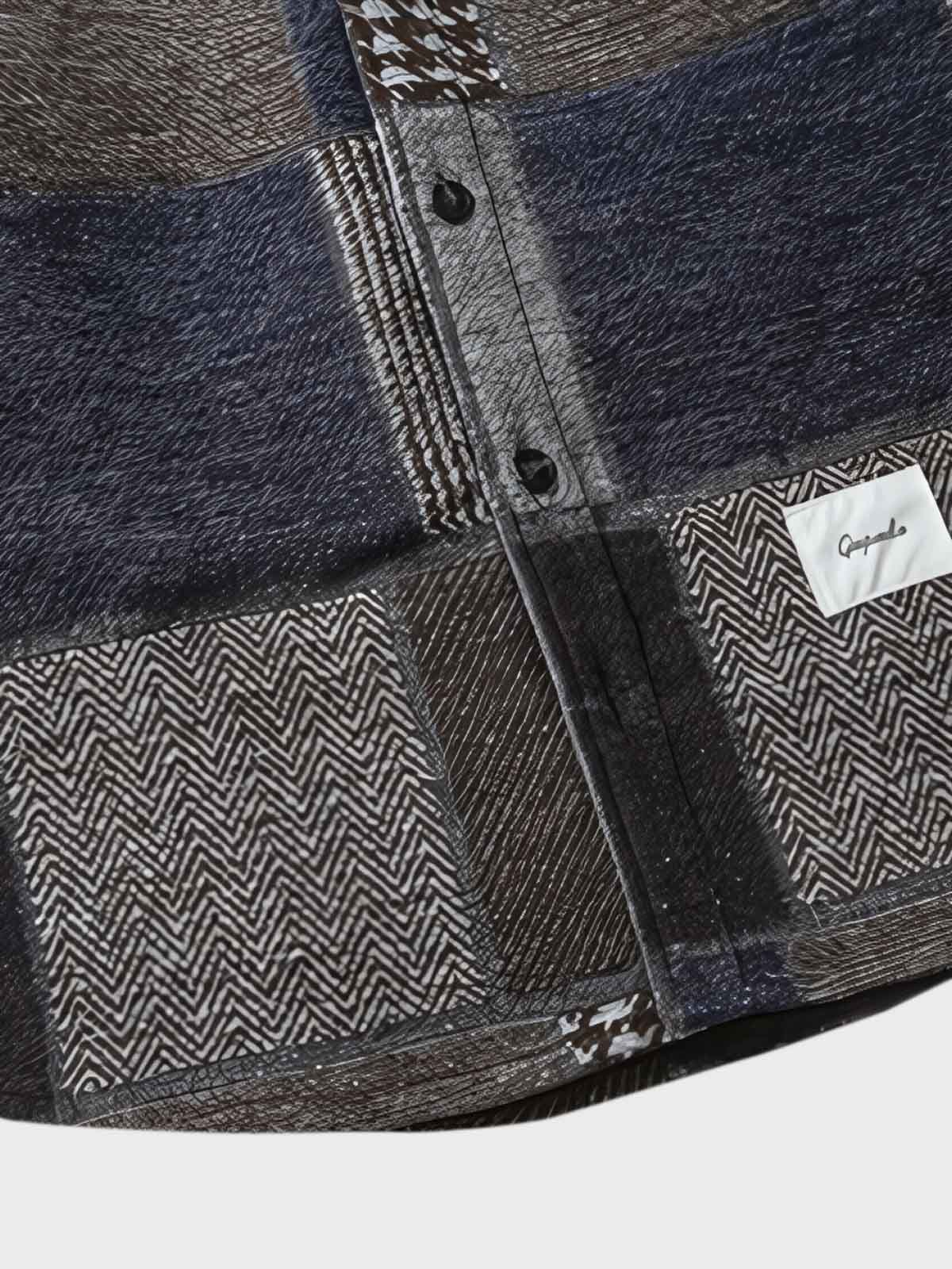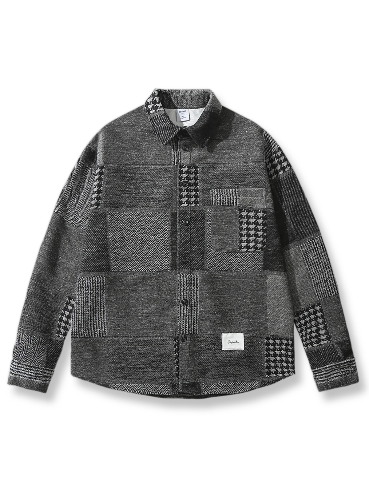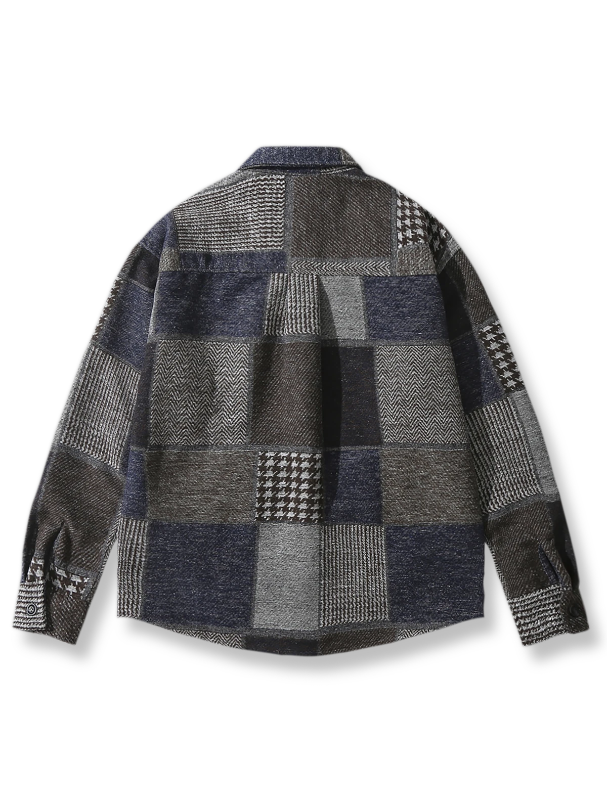 ヴィンテージ風のパッチワークウールシャツ、温かさと質感を兼ね備えた百家布デザイン。