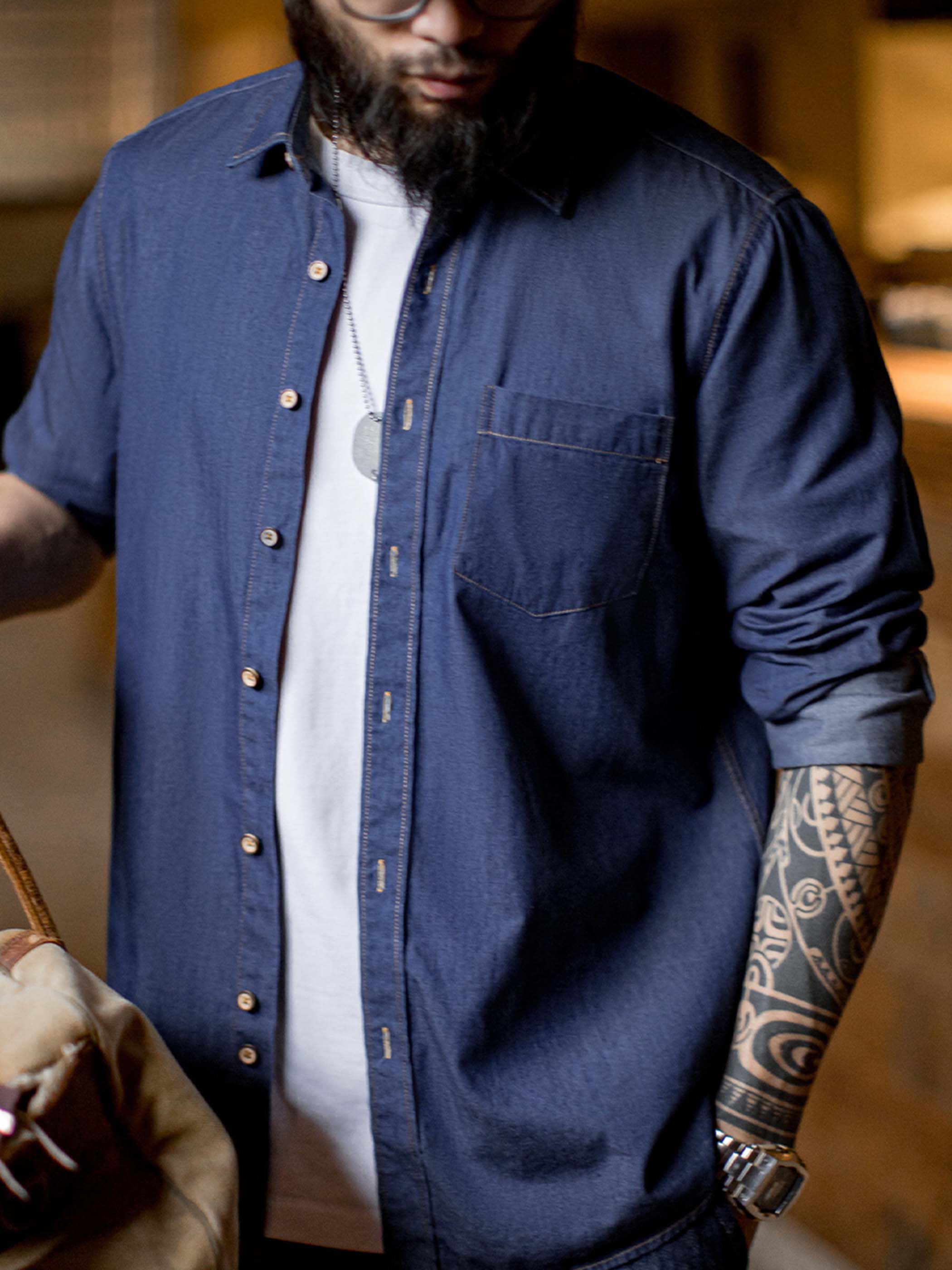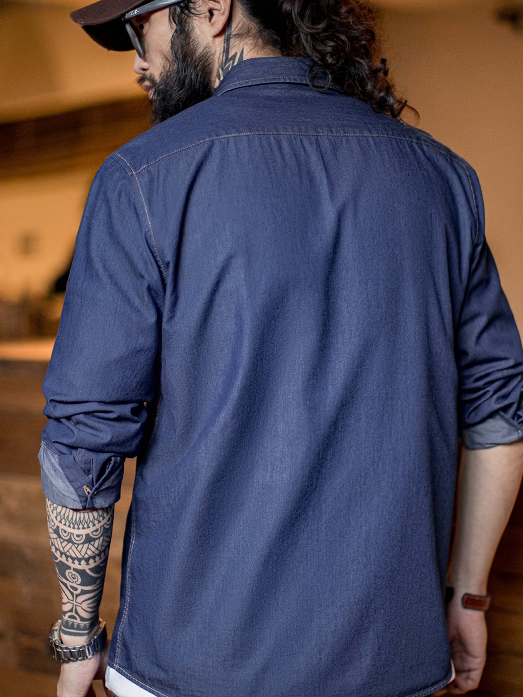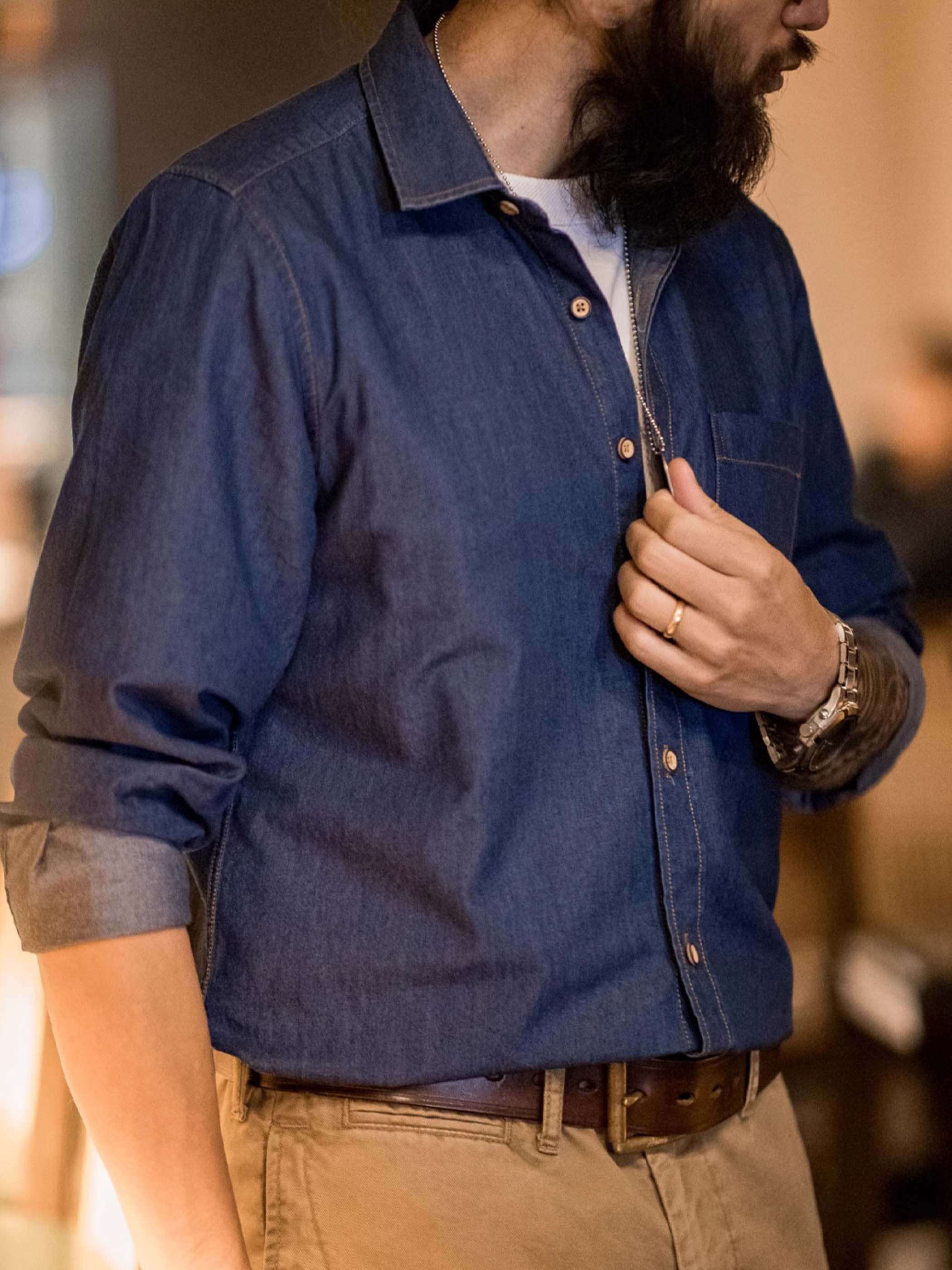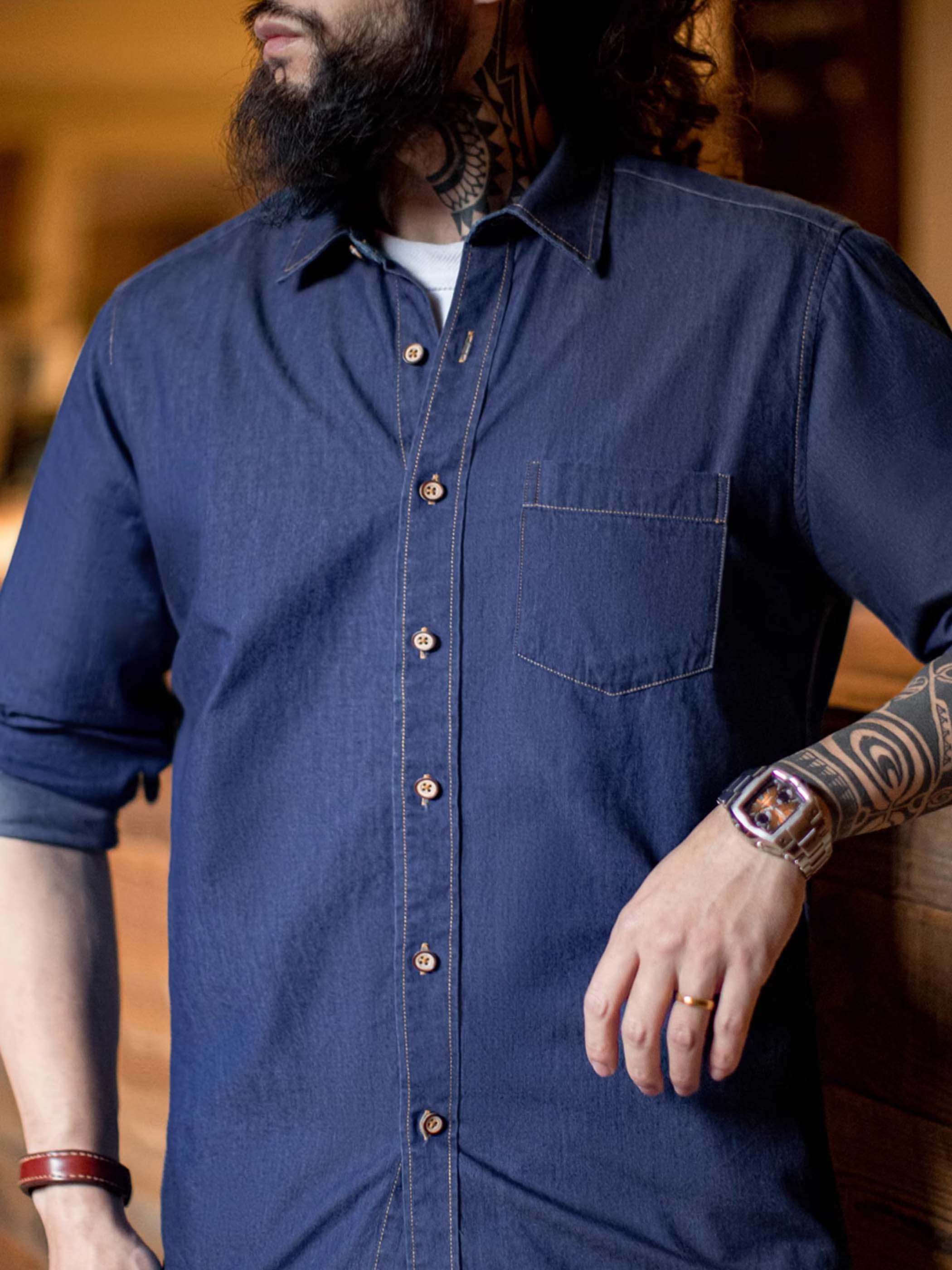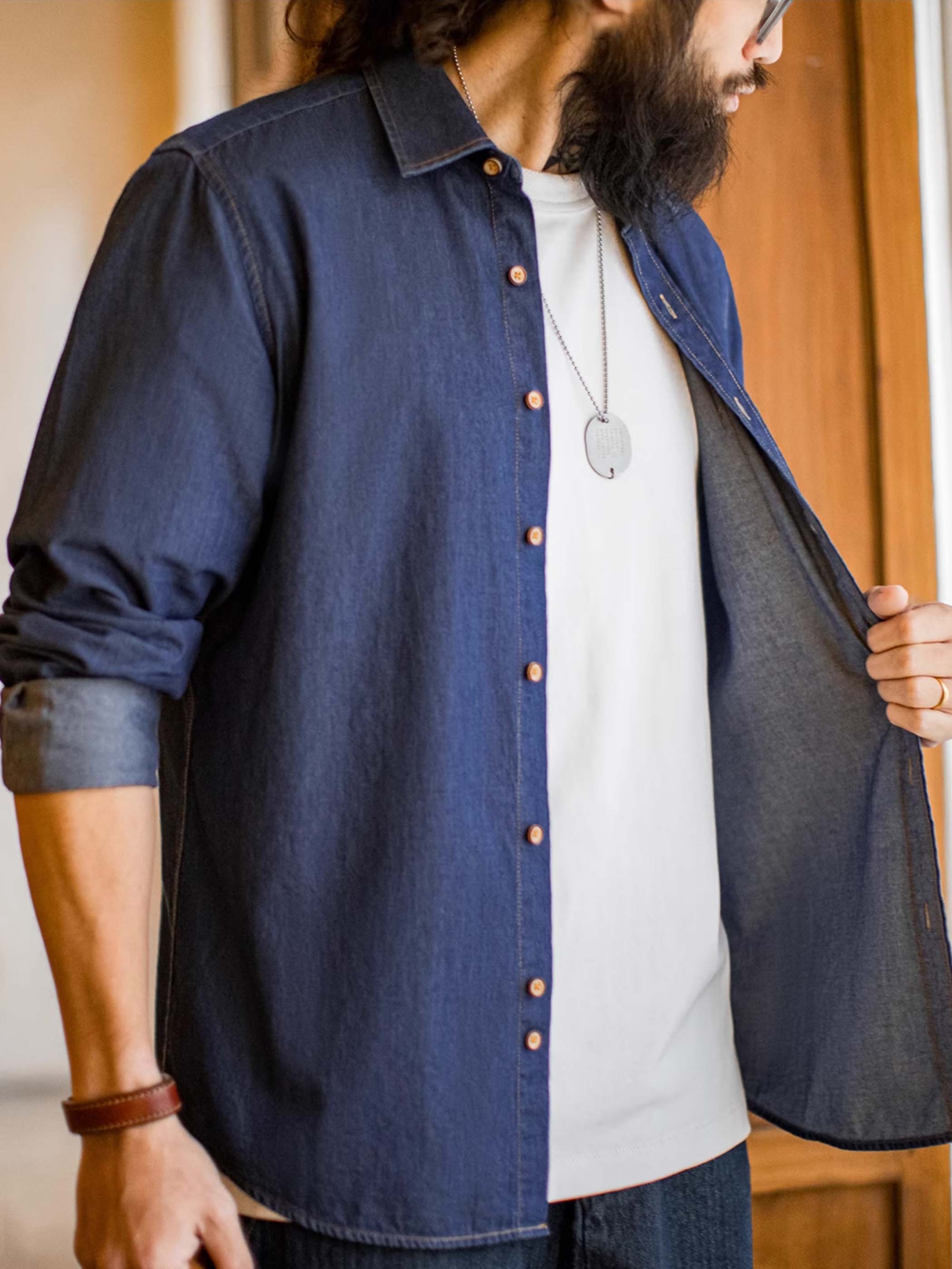 20世紀のアメリカンワークウェアのクラシックなシルエットを踏襲し、適度なフィット感とシャープな印象を演出するデニムシャツ。ウォッシュ加工を施したコットンデニム生地は、柔らかさと適度なハリ感を両立し、ヴィンテージライクな風合いが特徴。ゴールドステッチがアクセントとなり、ディテールに奥行きをプラス。襟元にはレトロなトライアングル織ネームを施し、細部までこだわったデザインに仕上げました。ボタンにはライトウッド×ダークブラウンの二層バイカラーデザインを採用し、クロスステッチ仕上げで耐久性を向上。シンプルなシングルポケットデザインと調節可能なダブルボタンカフスにより、機能性とデザイン性を兼ね備えた一着。クラシックな襟元デザインは、一枚着としてもインナーとしても着回しやすく、デニムパンツ、ワークパンツ、チノパンなどさまざまなコーディネートにマッチ。