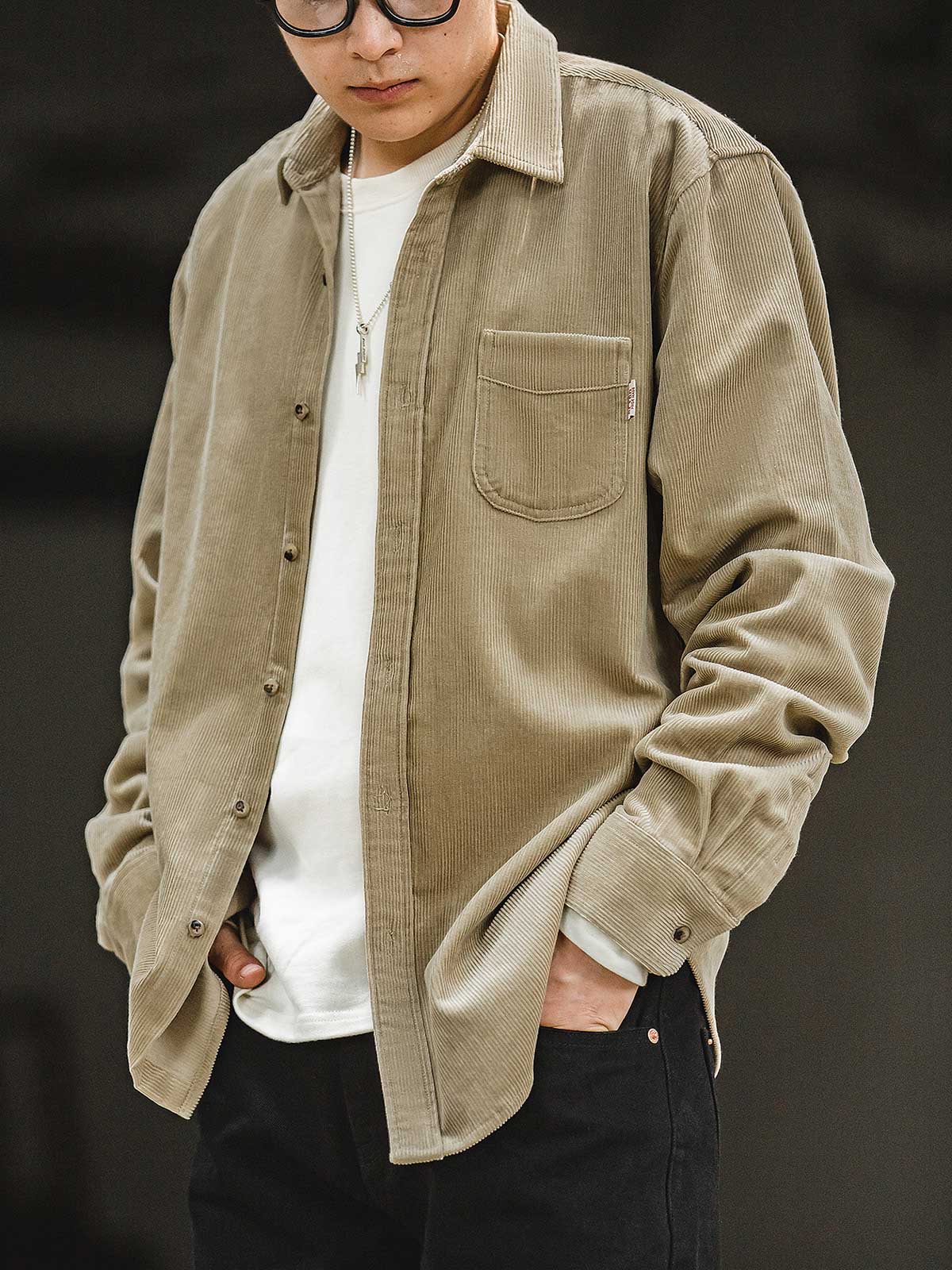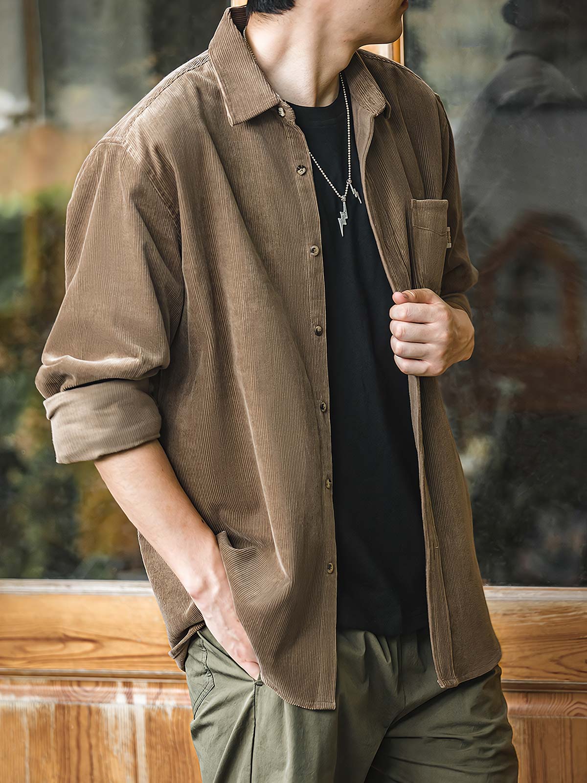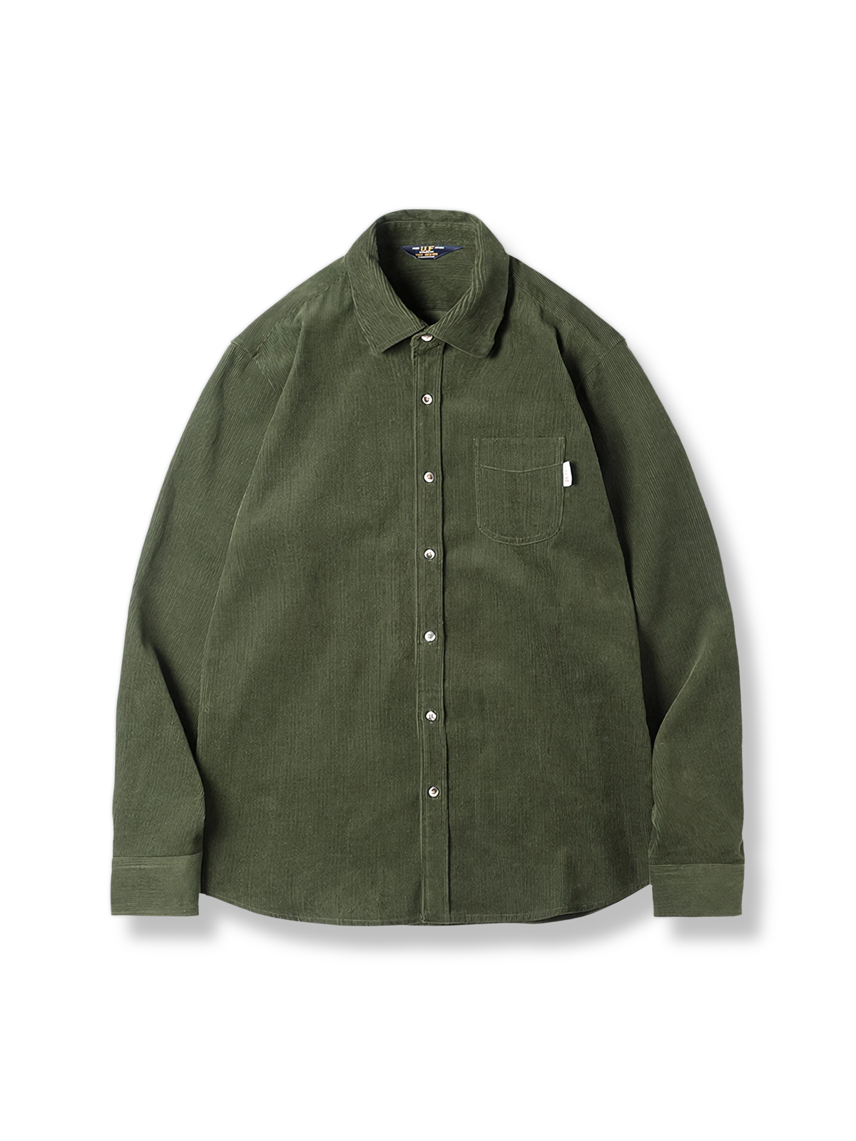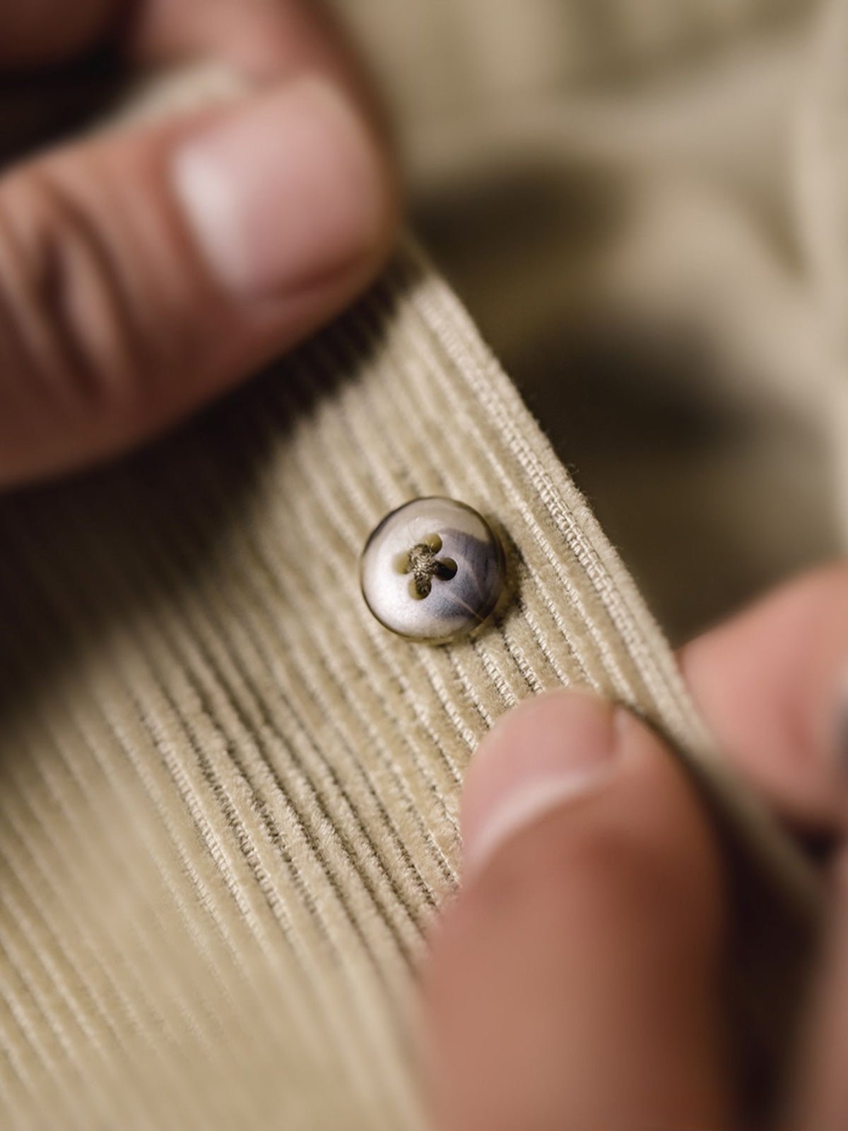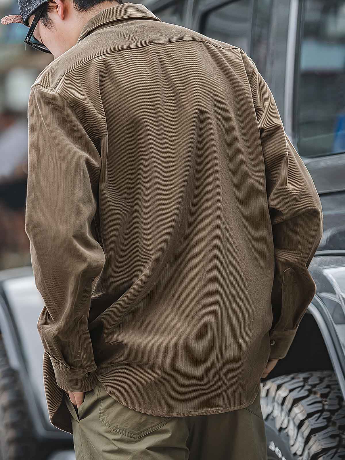 精密な縫製や均一なボタン配置など、高品質の仕上がりがこのシャツのディテールに反映されています。コーデュロイ素材はシャツに豊かな質感をもたらし、その立体的なストライプは視覚的な深みを加えます。