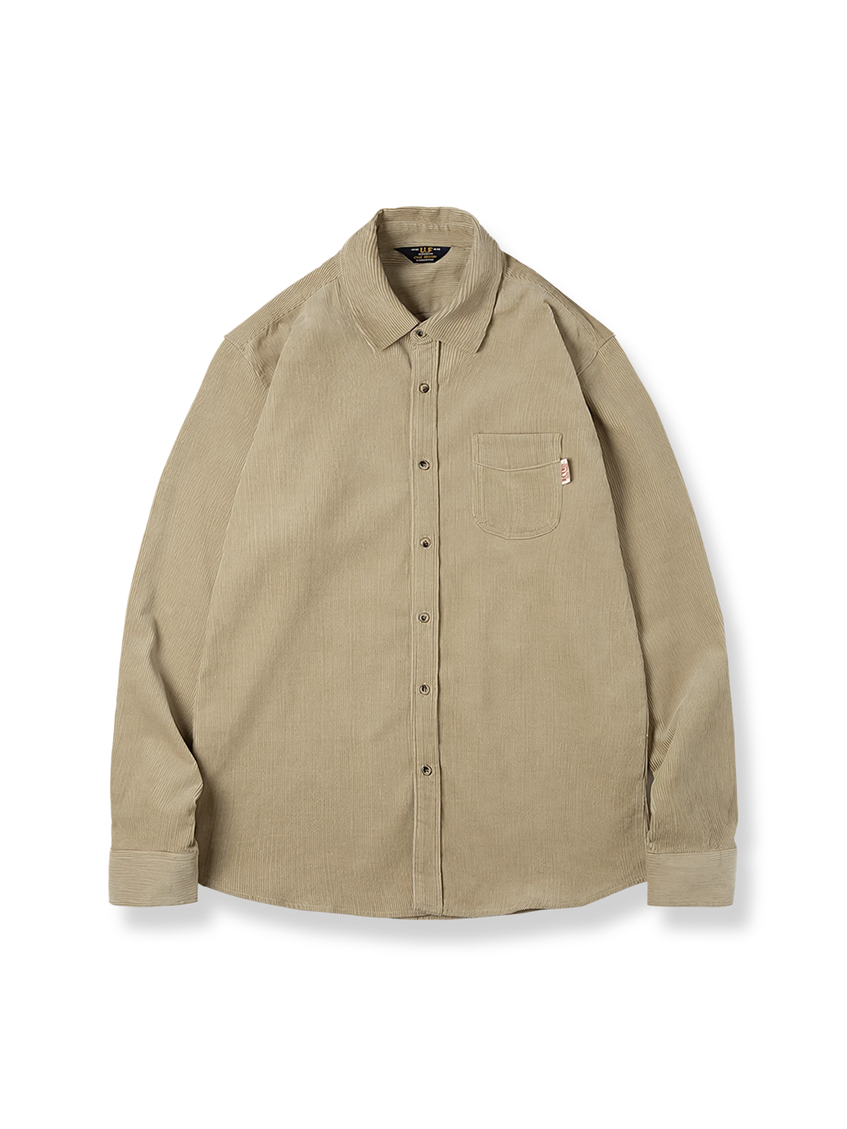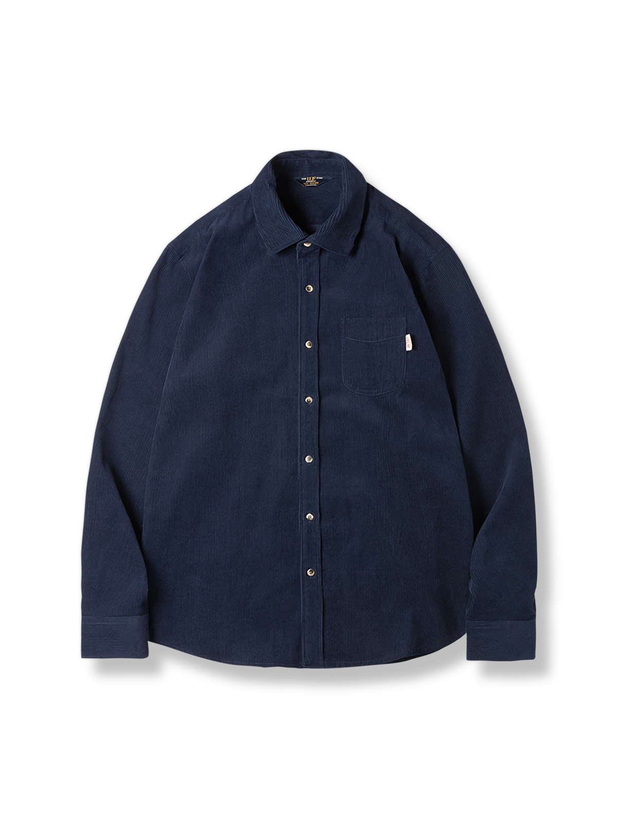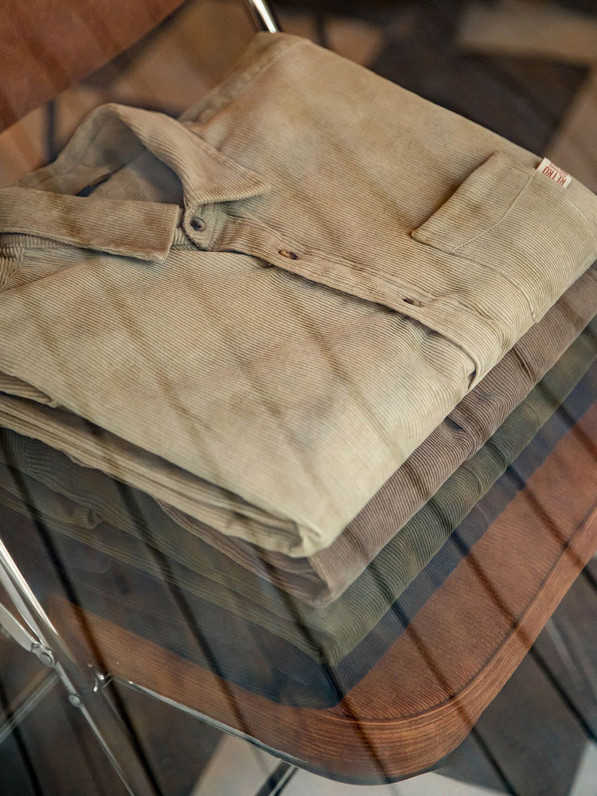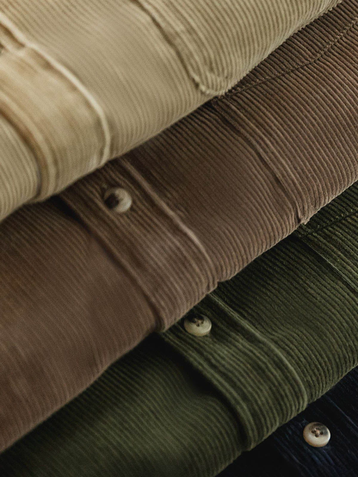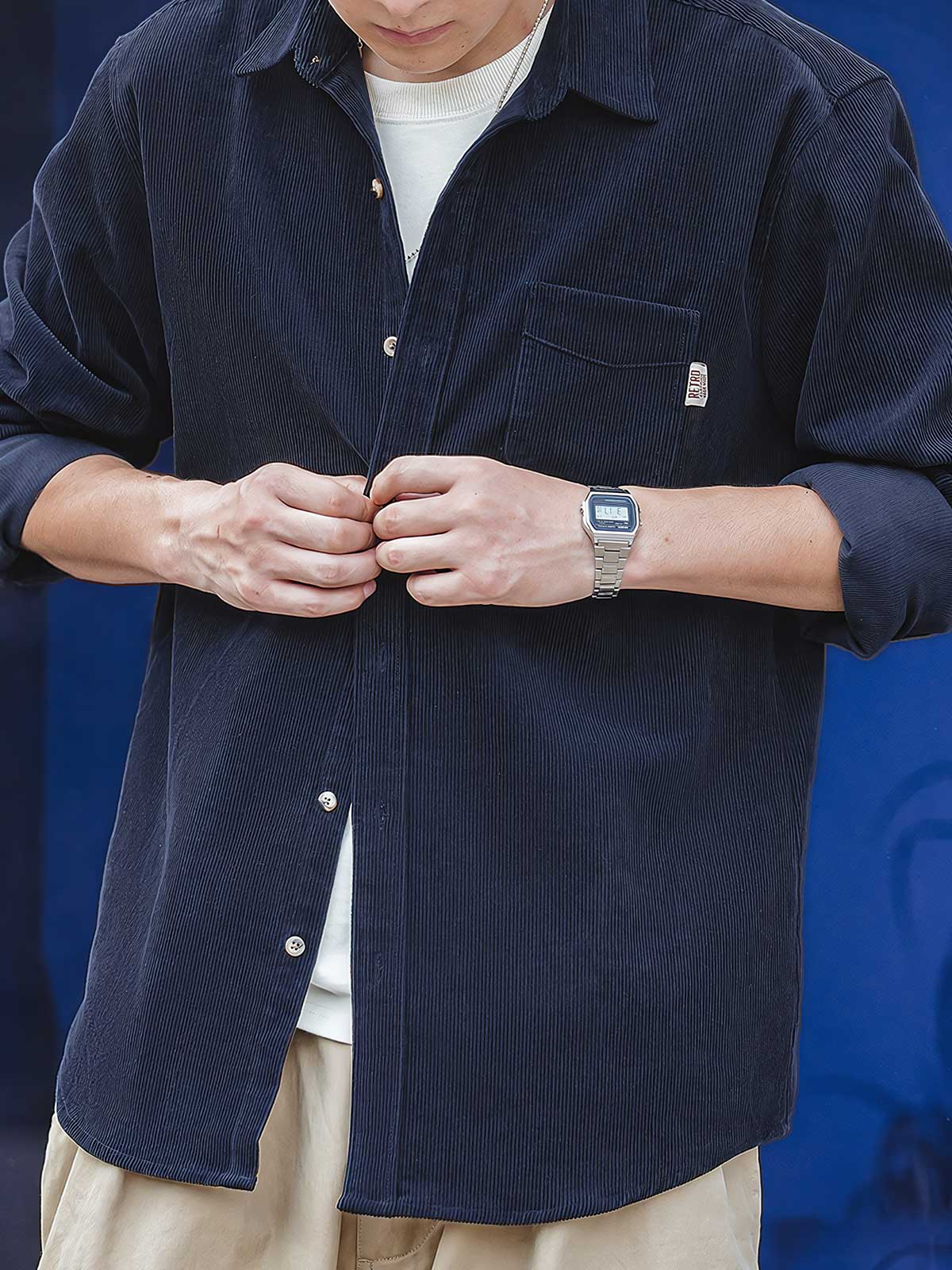 精密な縫製や均一なボタン配置など、高品質の仕上がりがこのシャツのディテールに反映されています。コーデュロイ素材はシャツに豊かな質感をもたらし、その立体的なストライプは視覚的な深みを加えます。