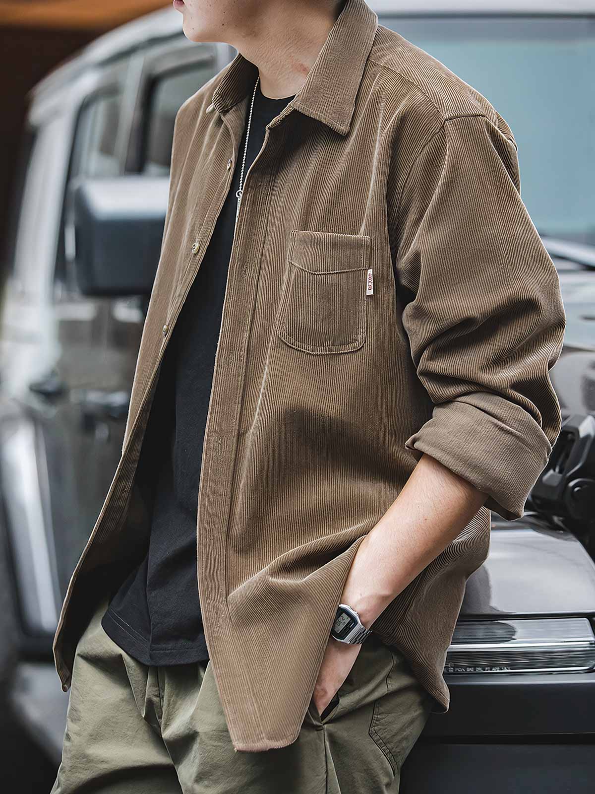 このミリタリーグリーンの長袖シャツは、18世紀ヨーロッパに起源を持つコーデュロイ素材を採用しています。かつて貴族の象徴であったこの素材は、耐久性と快適さから広く受け入れられるようになりました。その「ロープ」状のテクスチャーにちなんで名付けられたコーデュロイは、シャツに独特の質感と少しのレトロな学院風をもたらします。ミリタリーグリーンは、男性の服装における力強さと安定感を象徴し、軍服への敬意を表しています。