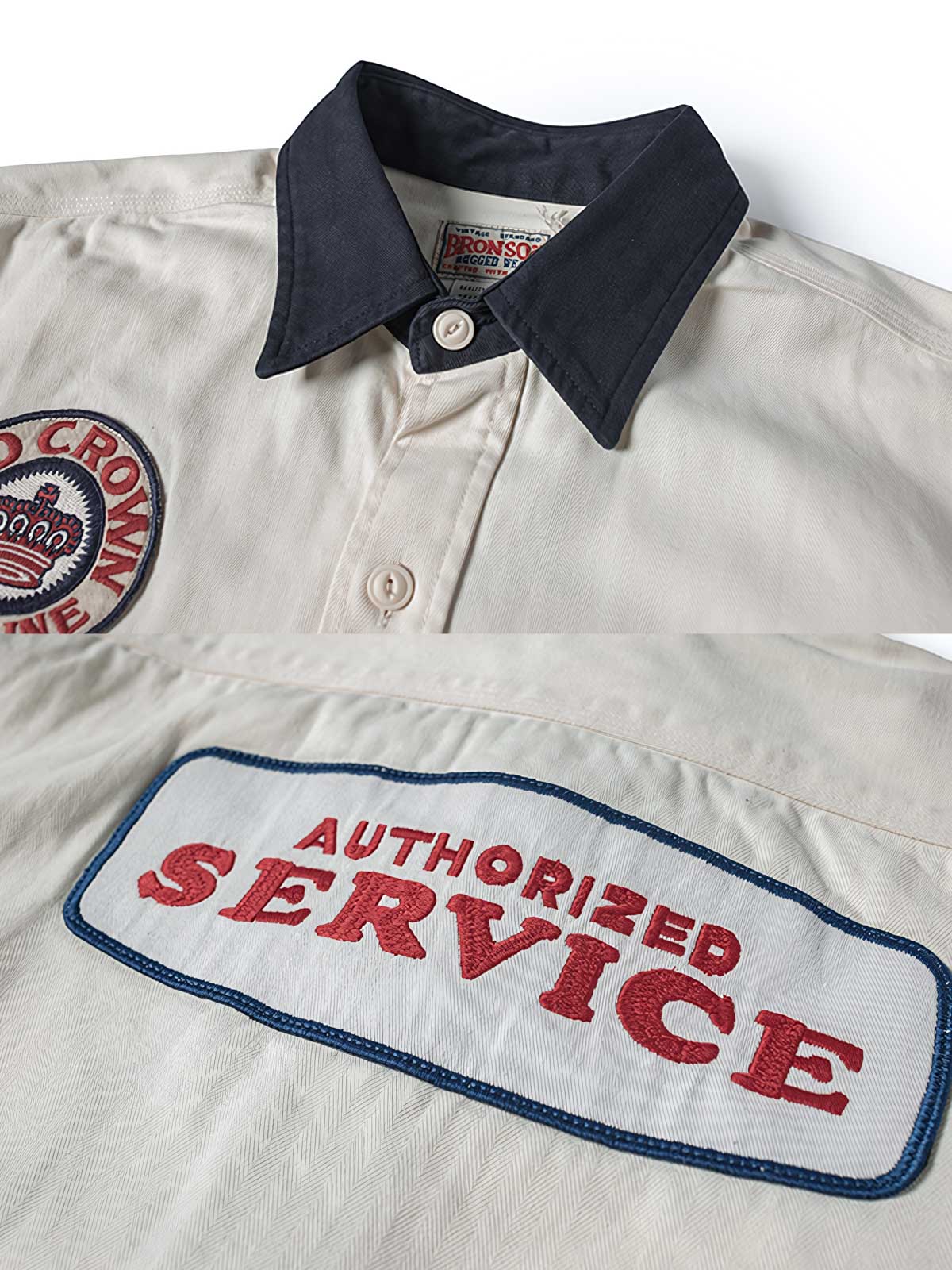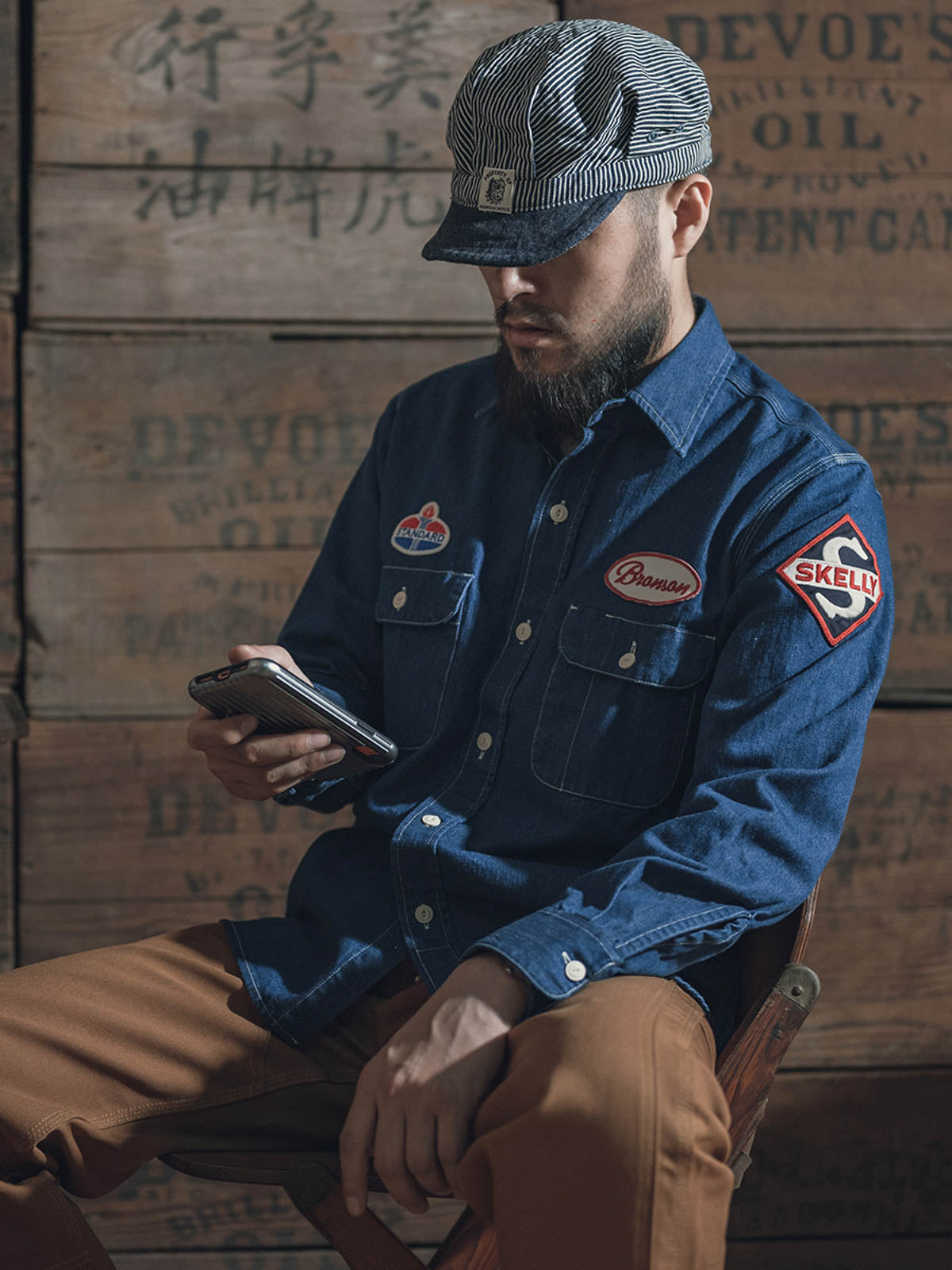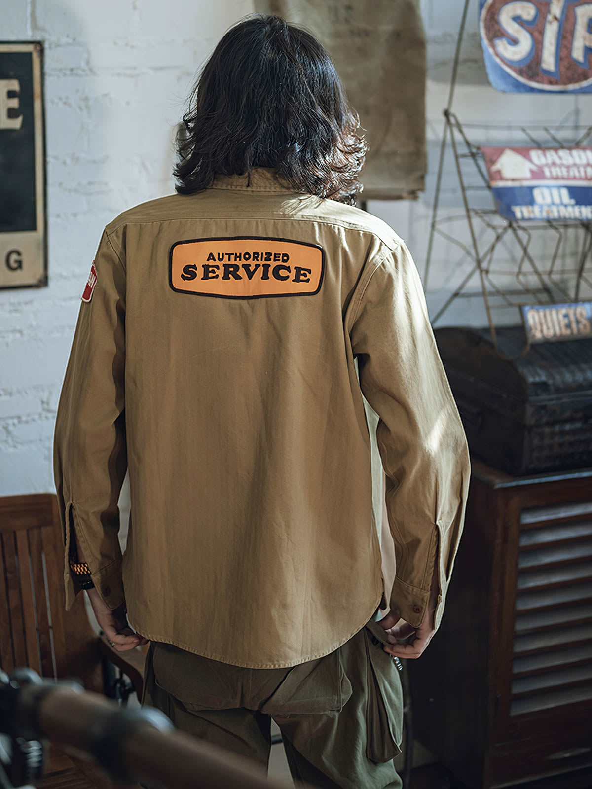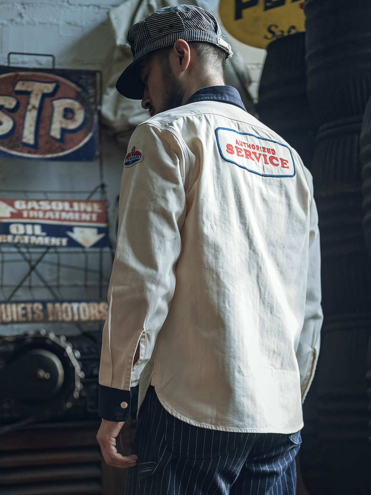 このワークシャツは、20世紀中頃のアメリカのガソリンステーション従業員のユニフォームからインスピレーションを得てデザインされました。特徴的な会社のロゴやシンボルが施された従業員の制服から着想を得て、クラシックなデニム素材と鮮やかな刺繍パッチを用い、その時代のワークウェアスタイルを再現しています。