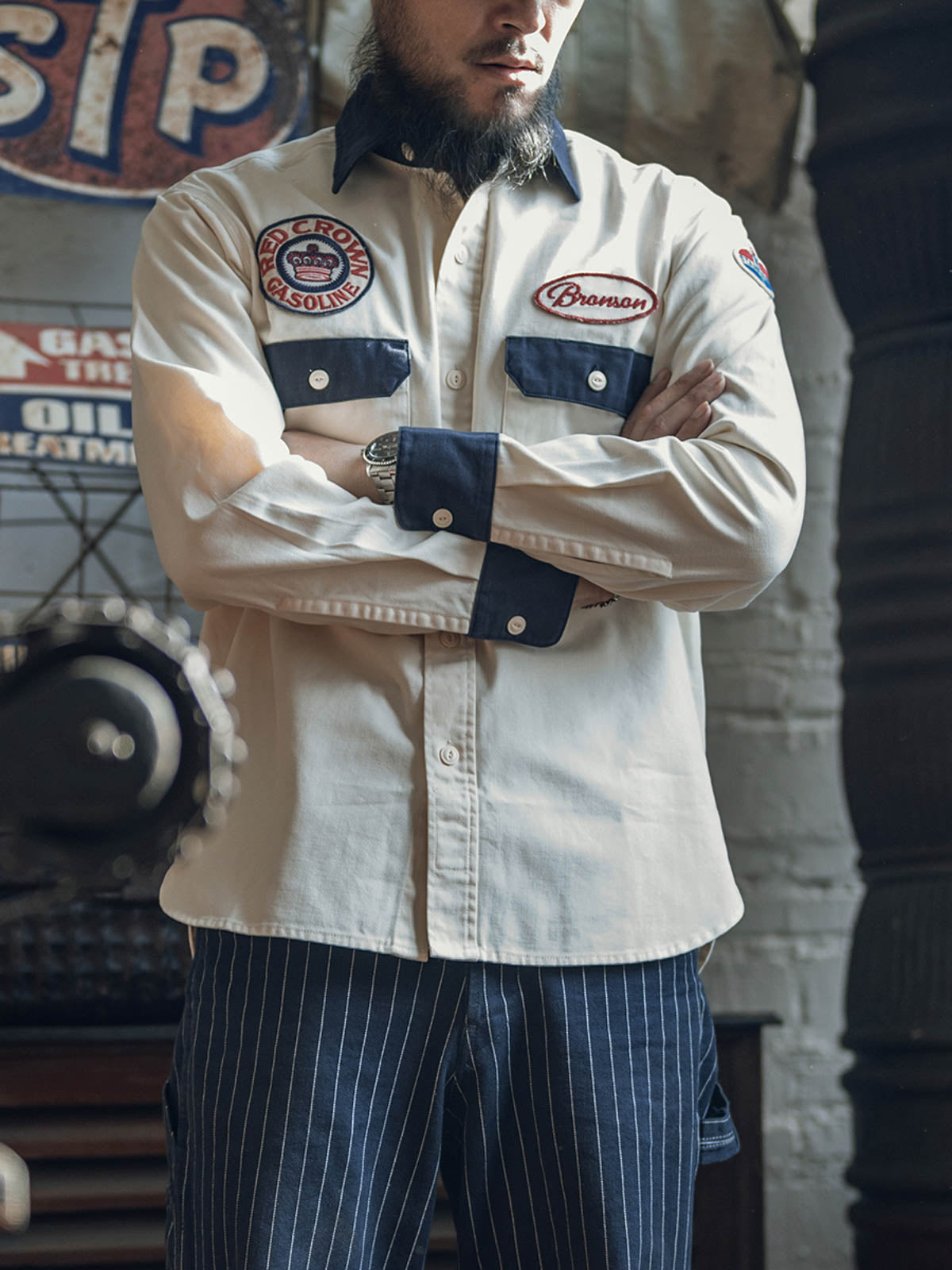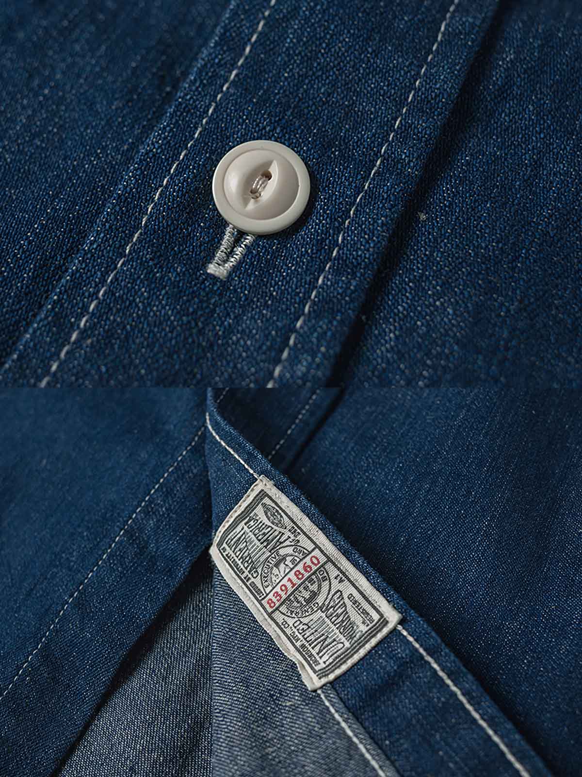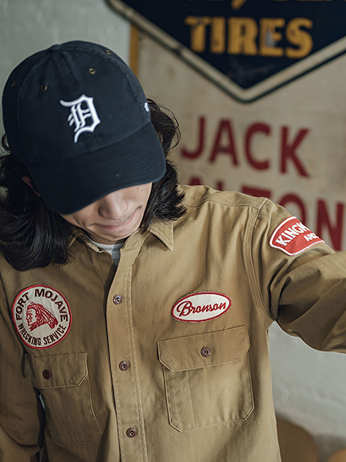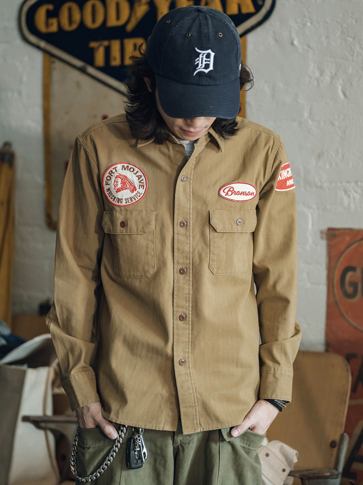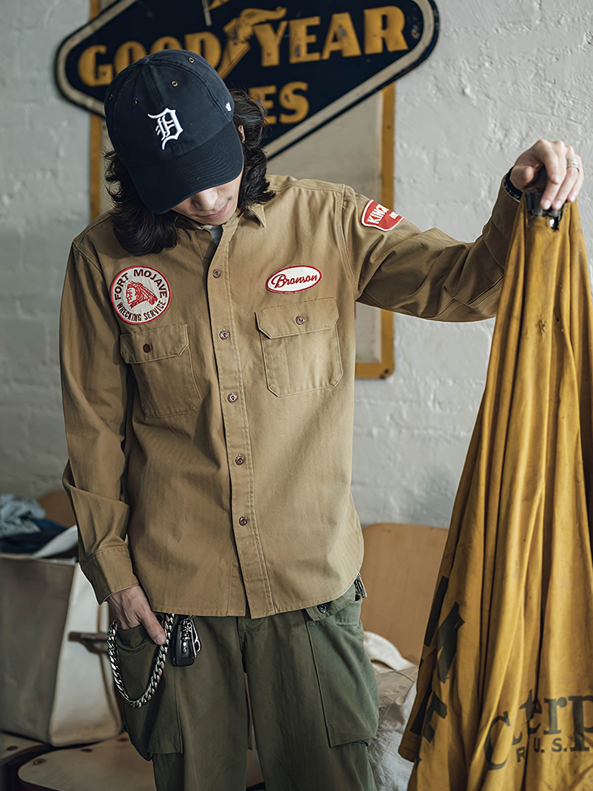 このワークシャツは、20世紀中頃のアメリカのガソリンステーション従業員のユニフォームからインスピレーションを得てデザインされました。特徴的な会社のロゴやシンボルが施された従業員の制服から着想を得て、クラシックなデニム素材と鮮やかな刺繍パッチを用い、その時代のワークウェアスタイルを再現しています。