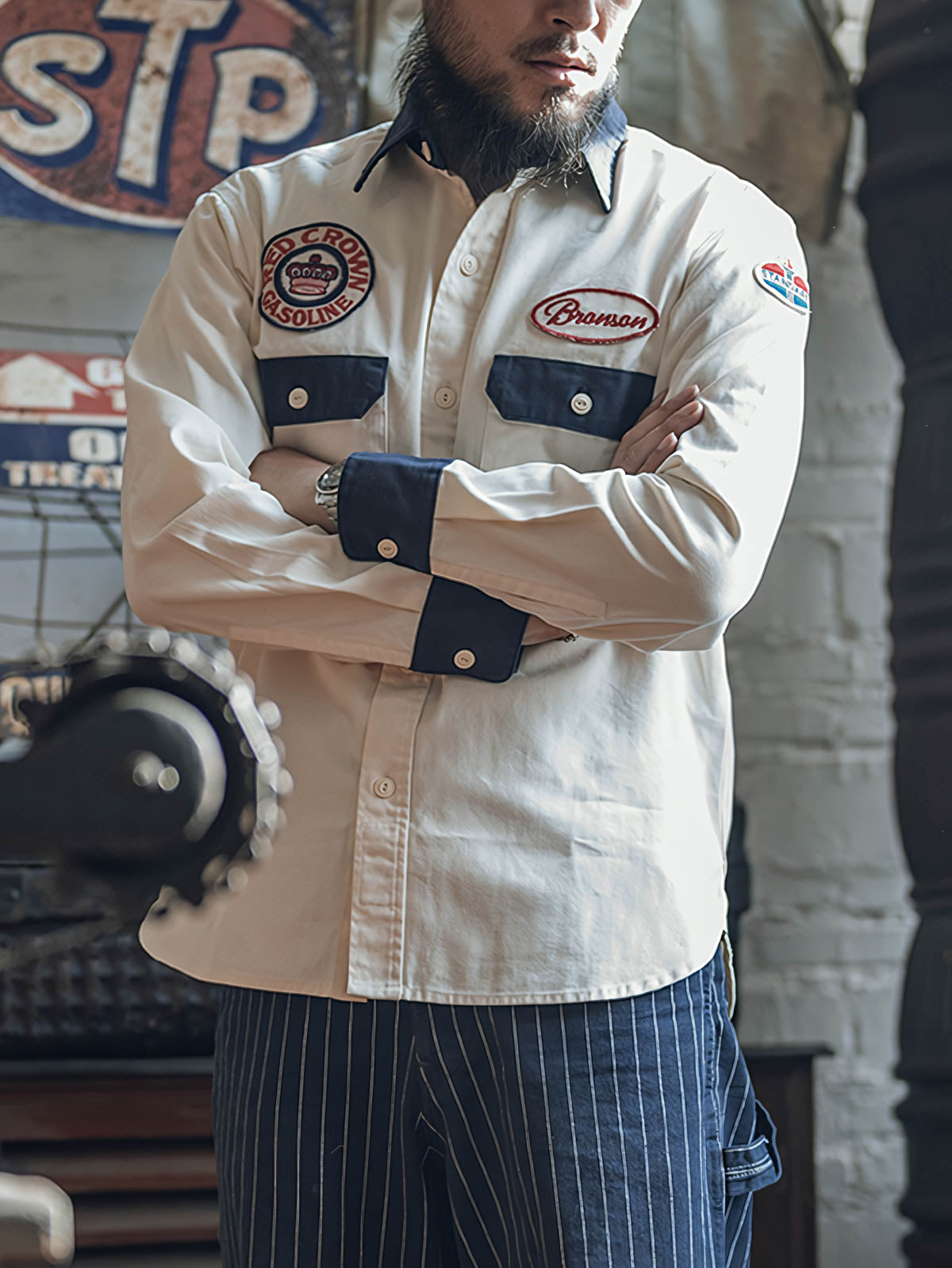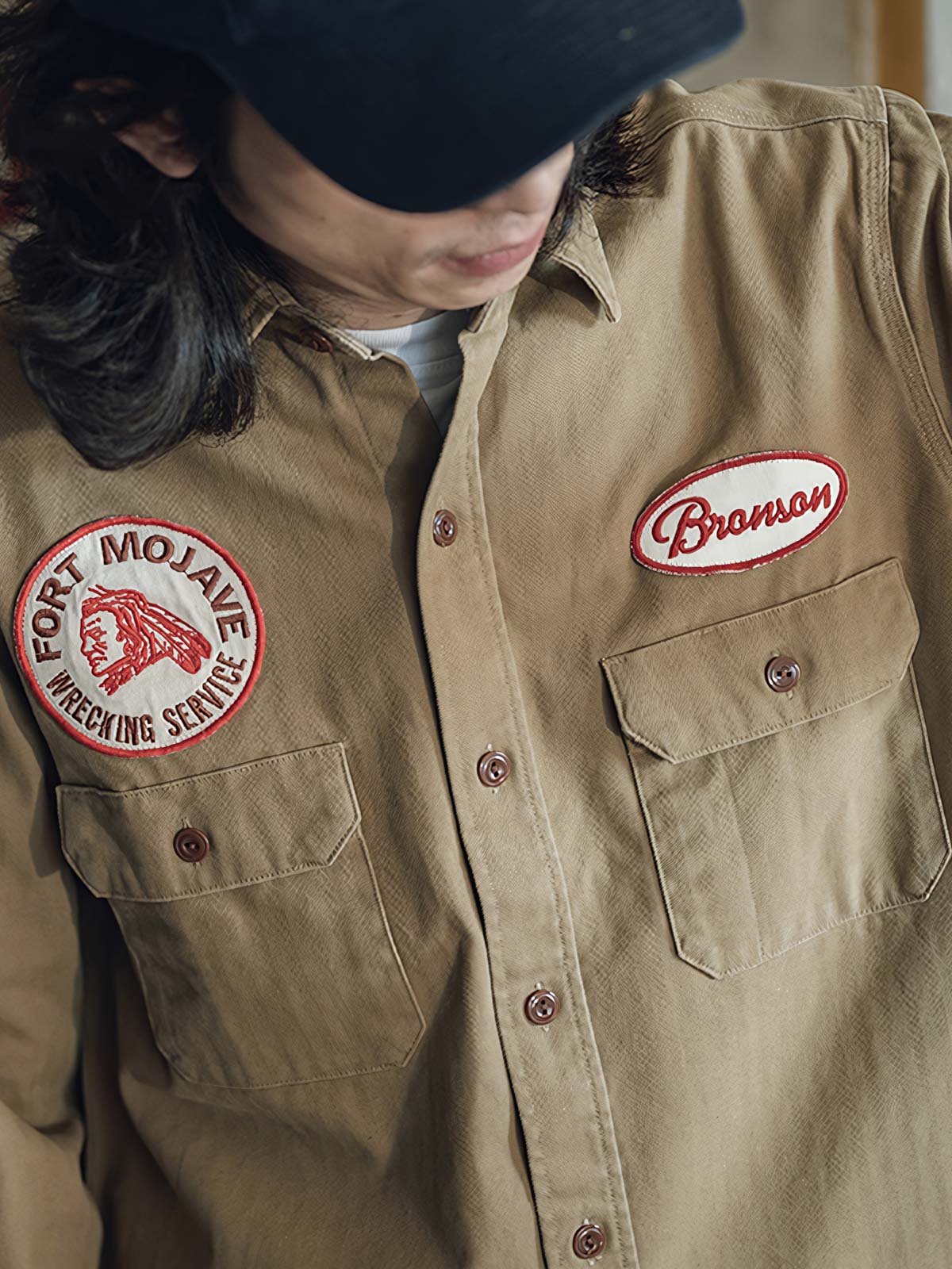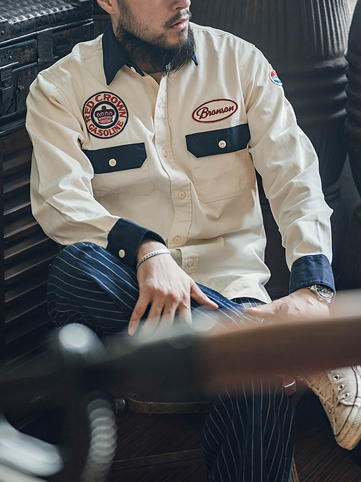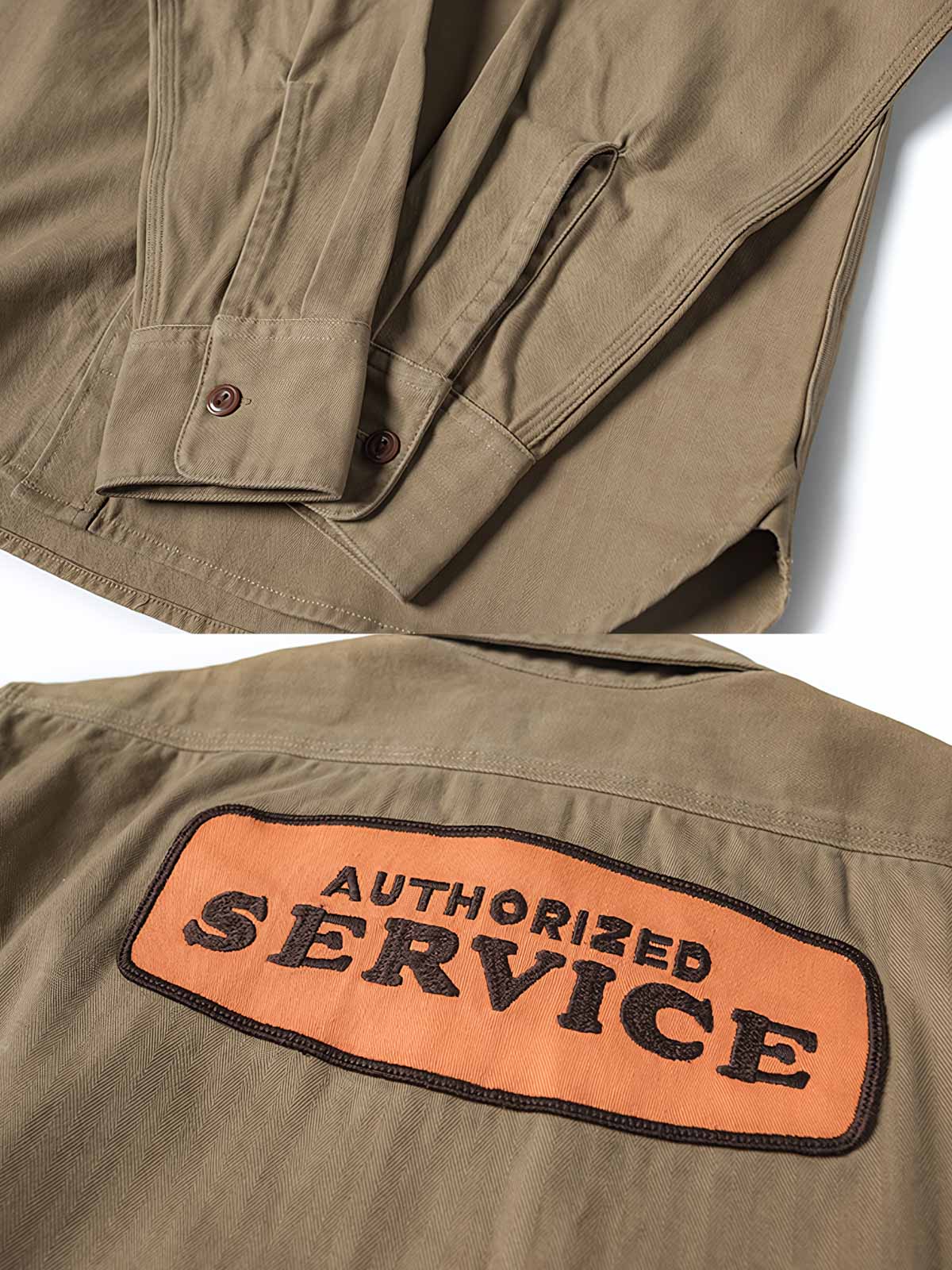 このワークシャツは、20世紀中頃のアメリカのガソリンステーション従業員のユニフォームからインスピレーションを得てデザインされました。特徴的な会社のロゴやシンボルが施された従業員の制服から着想を得て、クラシックなデニム素材と鮮やかな刺繍パッチを用い、その時代のワークウェアスタイルを再現しています。