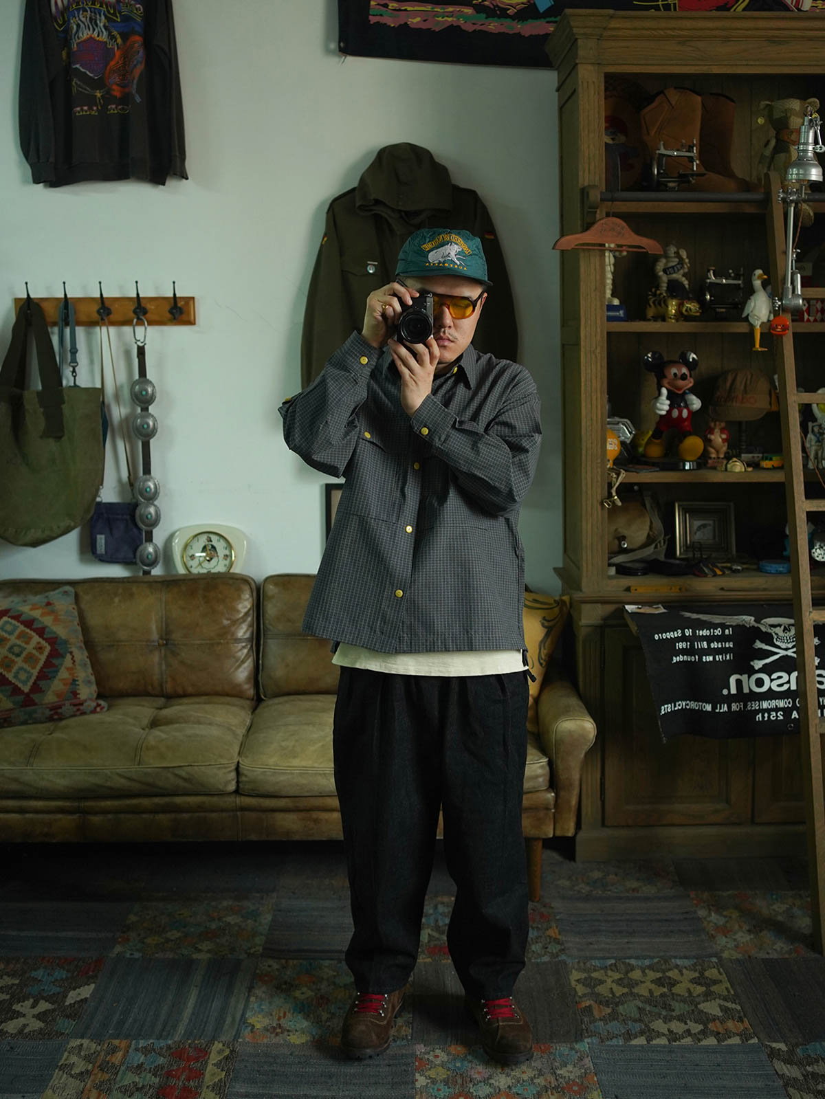 ナイロン混紡素材とヴィンテージチェックデザインで、機能性とレトロな美学を兼ね備えたルーズフィットハンティングシャツ。