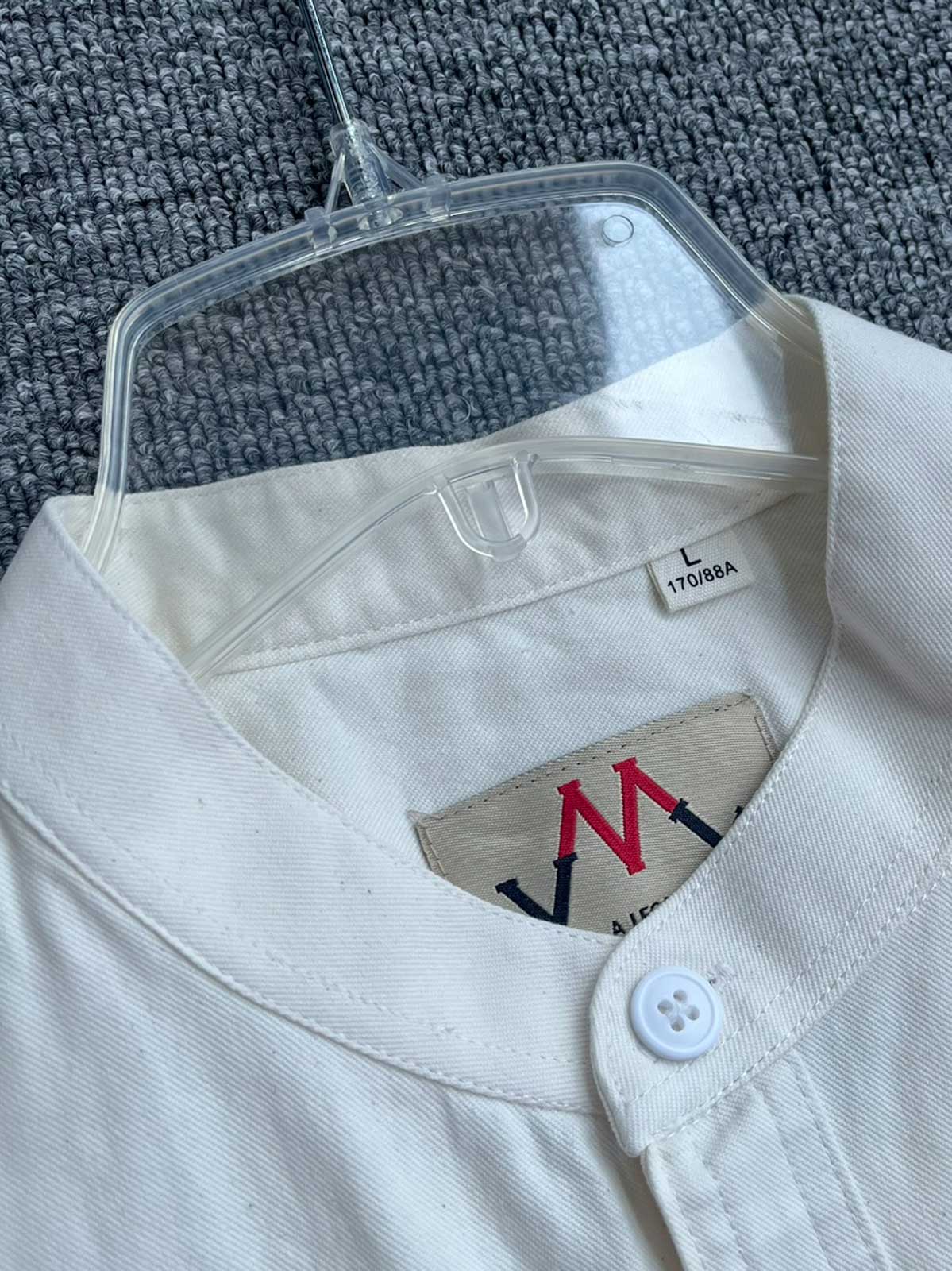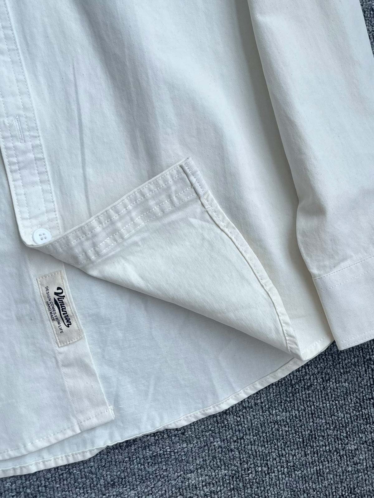 シンプルな立襟デザインと片側ポケットが特徴の100%コットンシャツで、実用性とスタイルを両立。