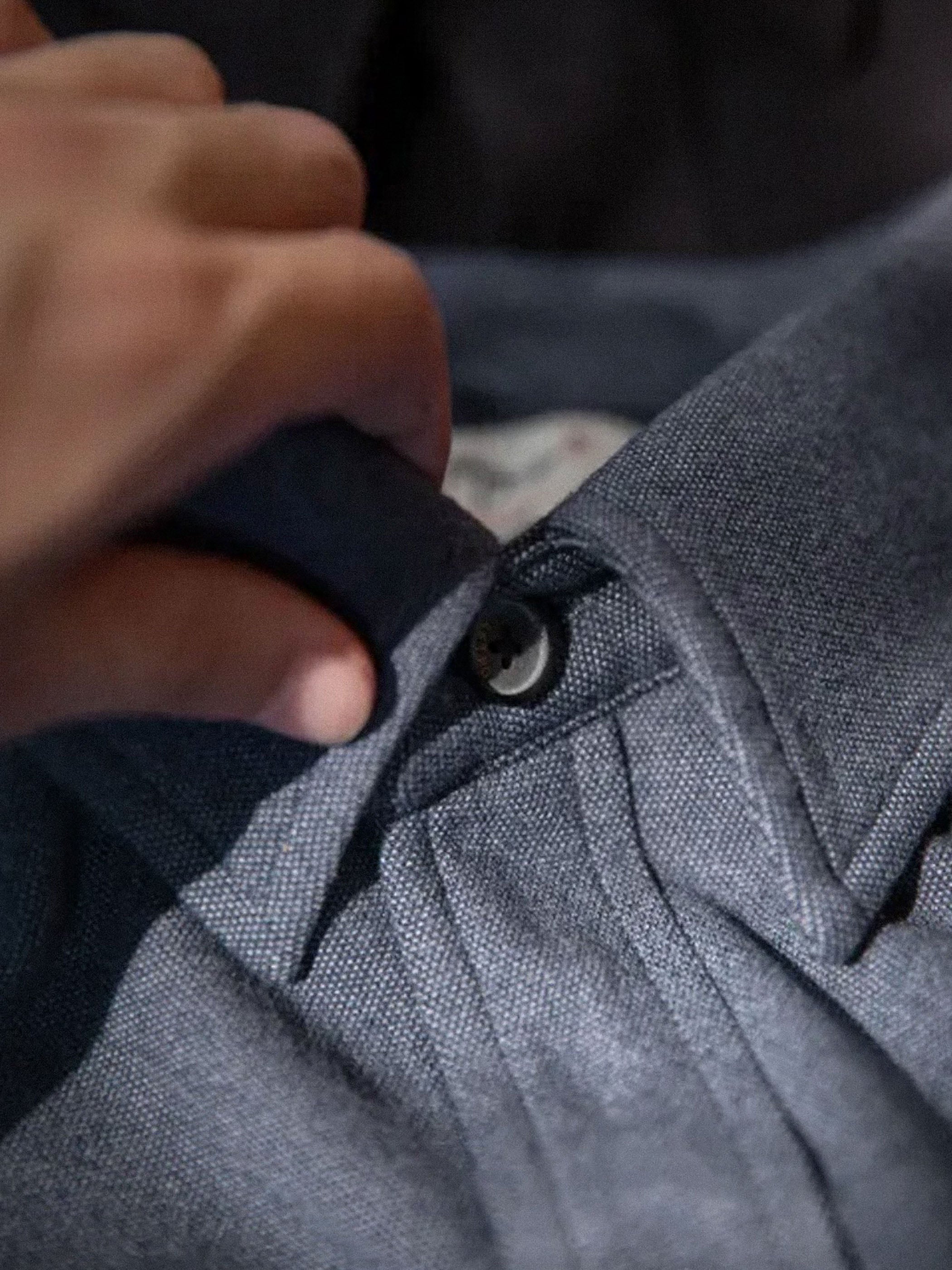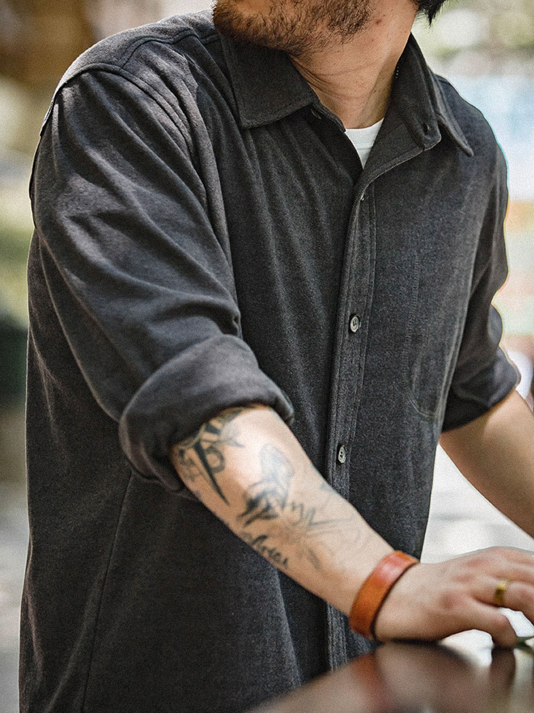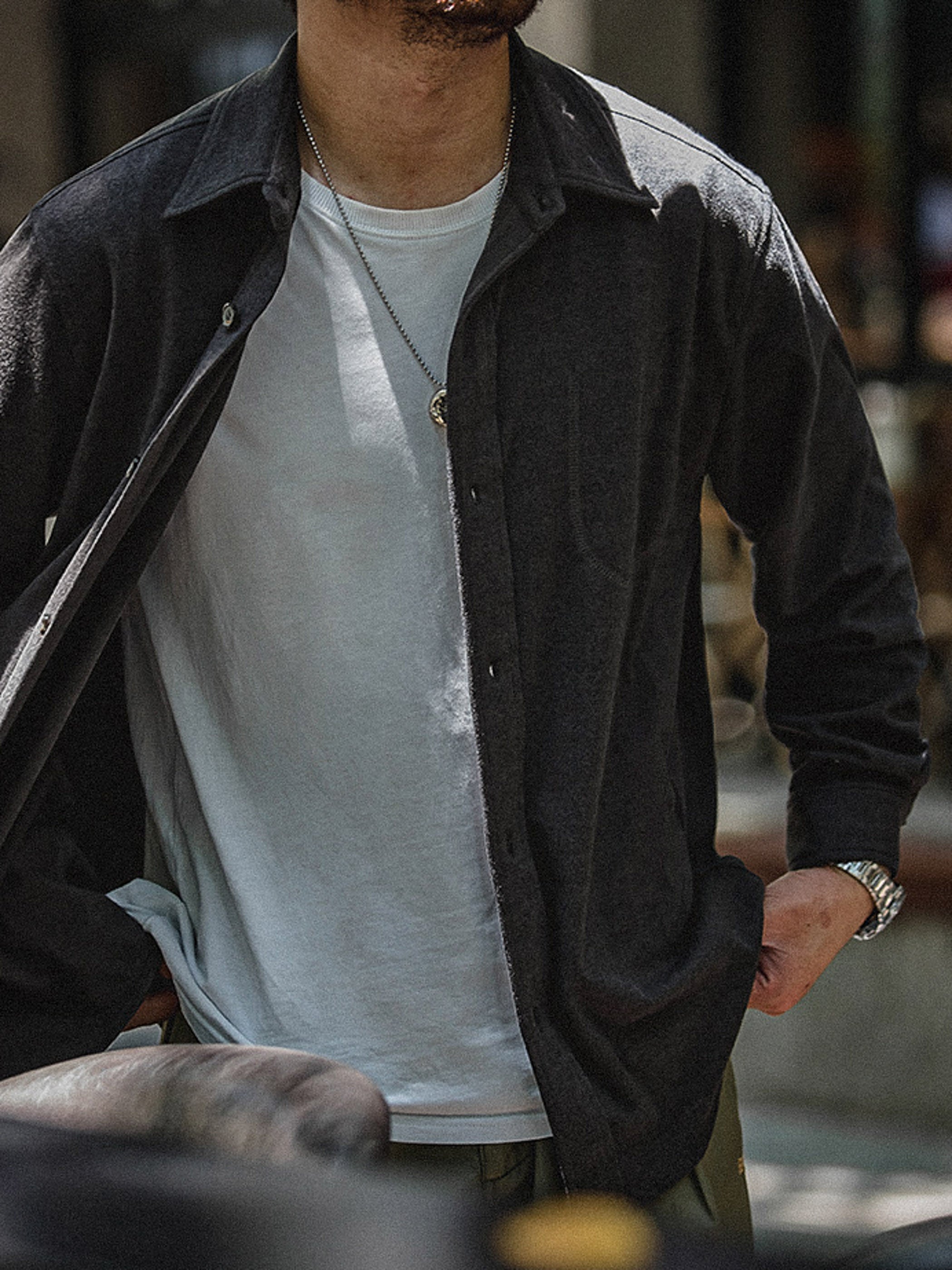 このシャツのデザインは重ね着に適しており、着用者に多様なコーディネートの可能性をもたらします。正しい肩のカッティングを採用しており、肩のラインがより滑らかでスタイリッシュに見えるようにしています。胸元にはU字型のステッチを施し、ボタンで襟を固定するデザインになっております。