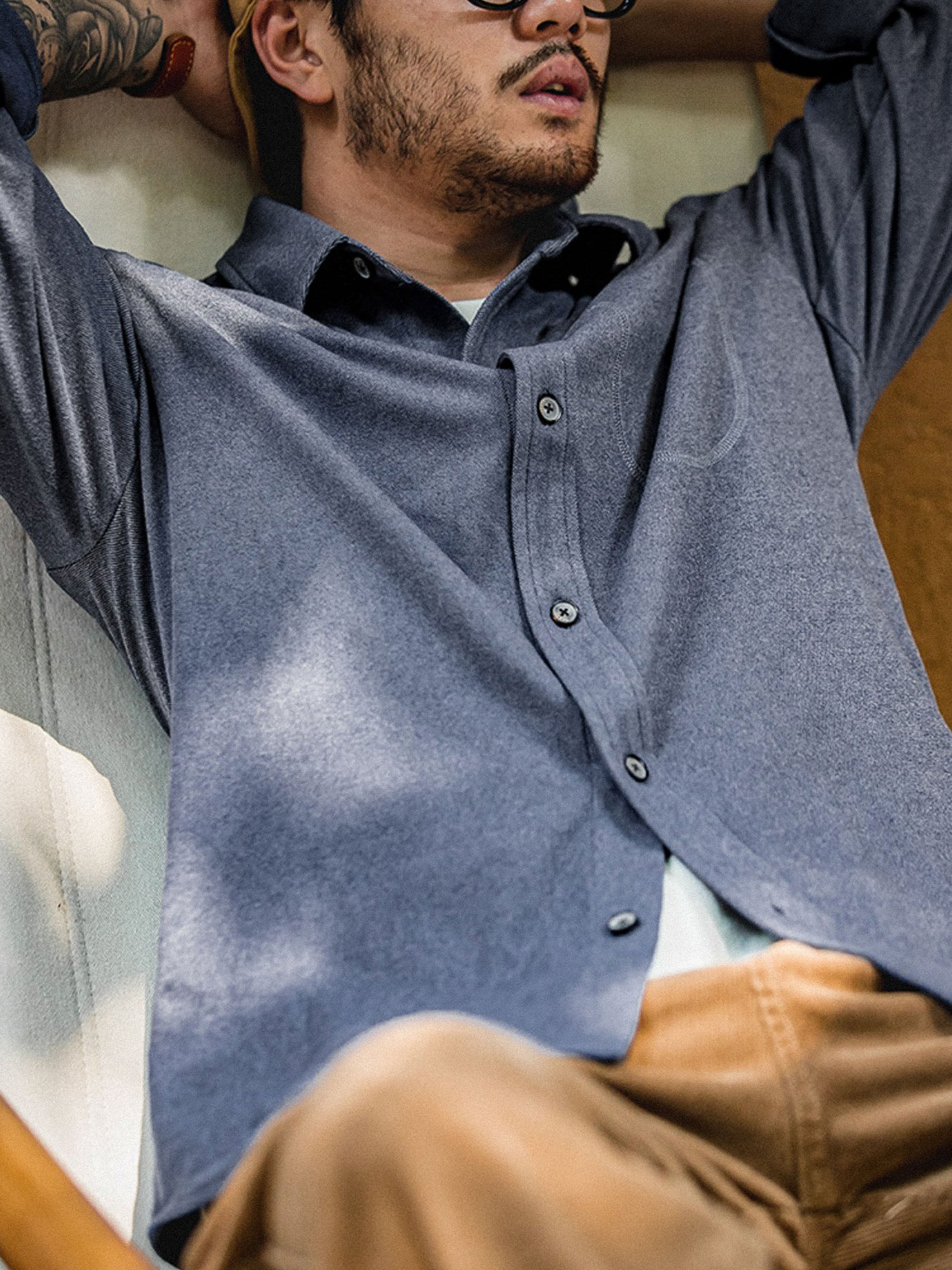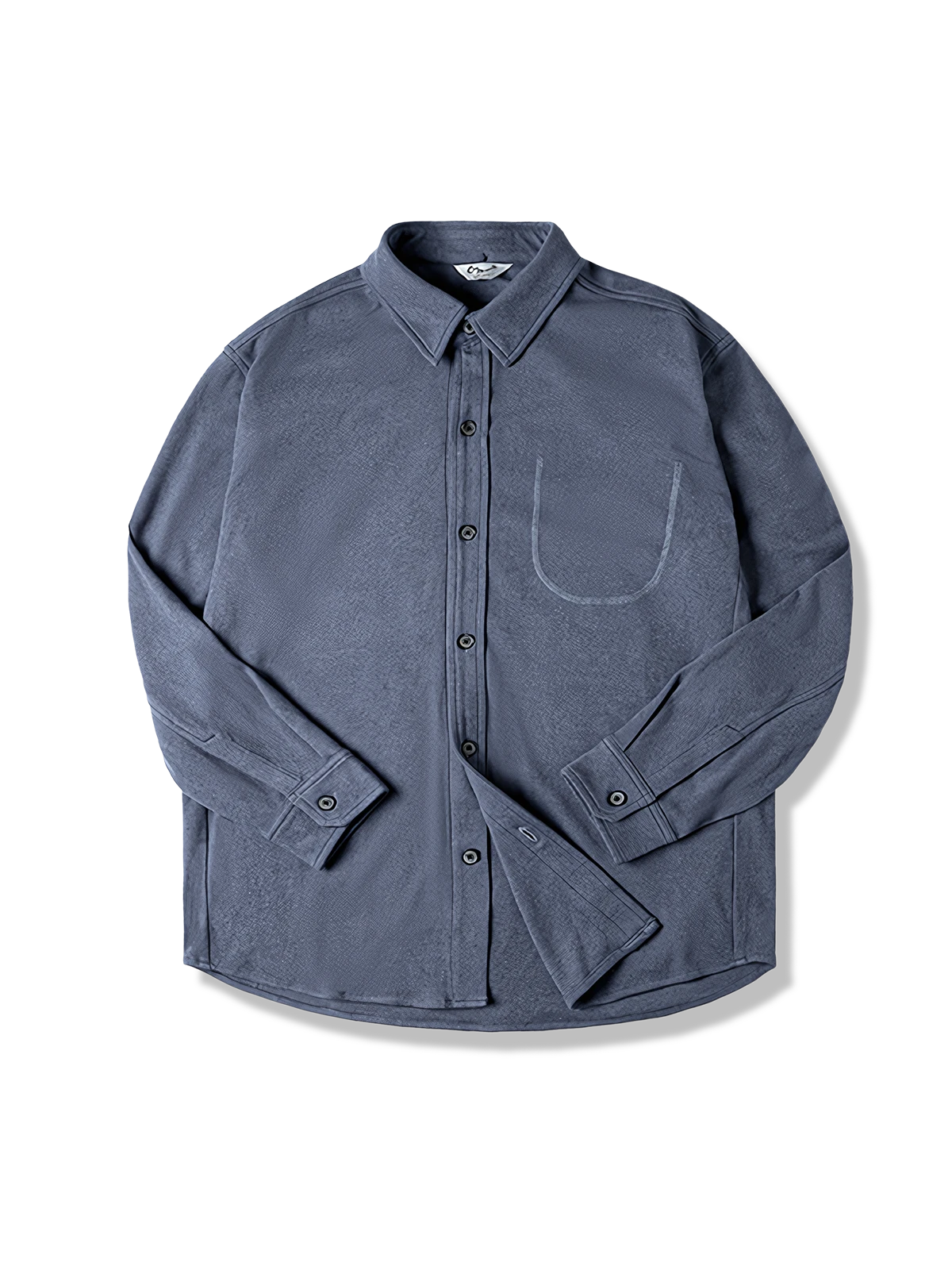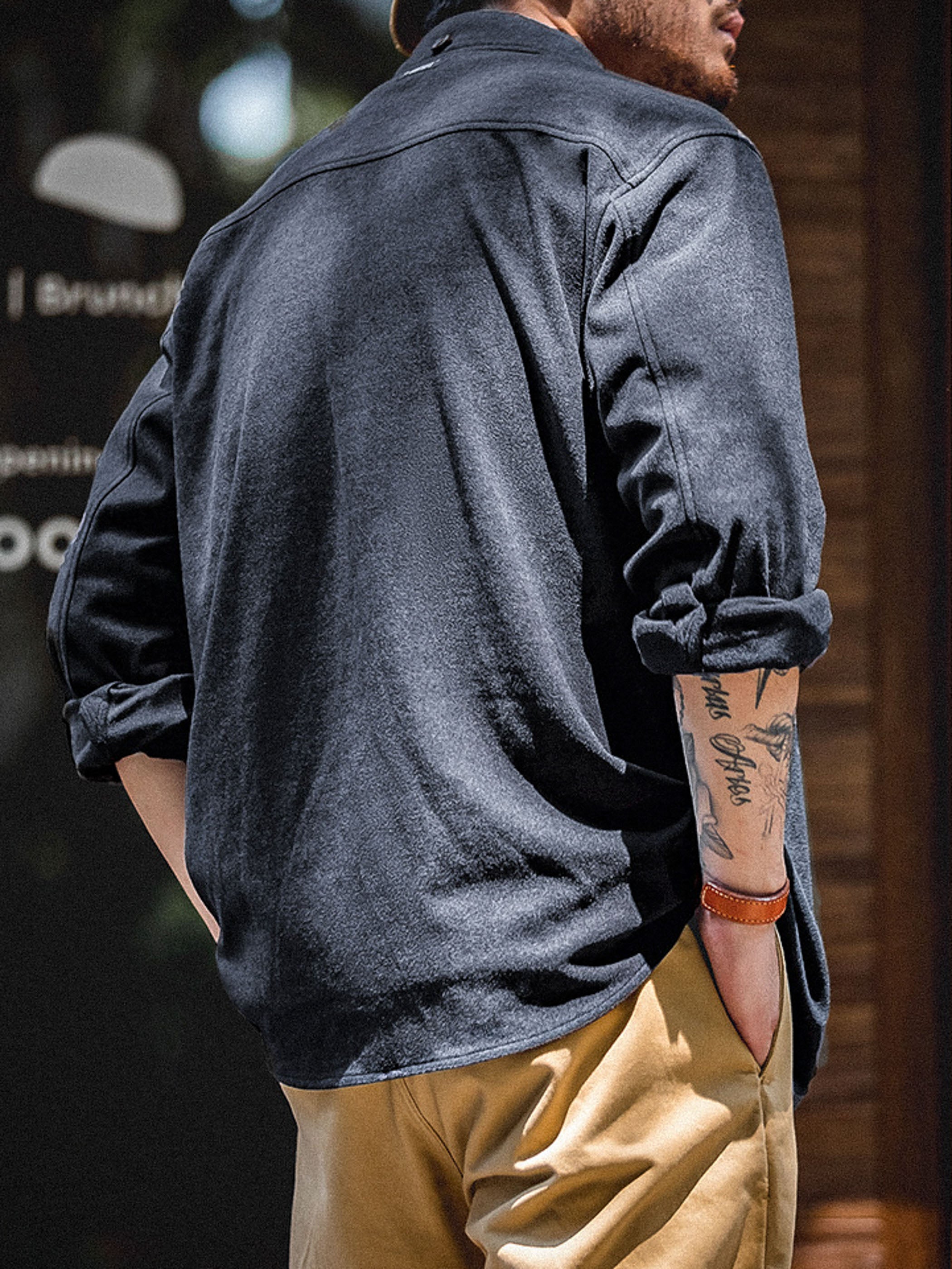 このシャツのデザインは重ね着に適しており、着用者に多様なコーディネートの可能性をもたらします。正しい肩のカッティングを採用しており、肩のラインがより滑らかでスタイリッシュに見えるようにしています。胸元にはU字型のステッチを施し、ボタンで襟を固定するデザインになっております。