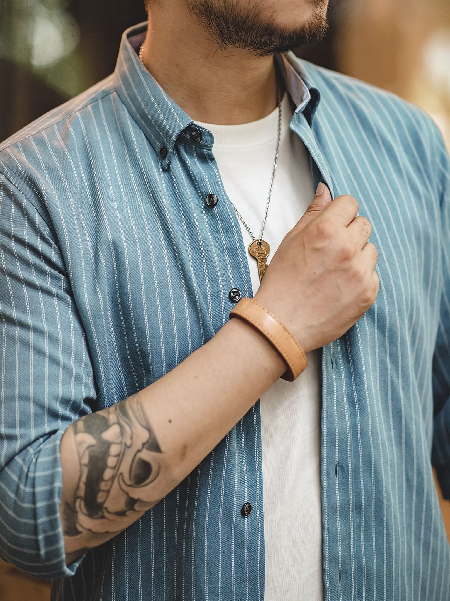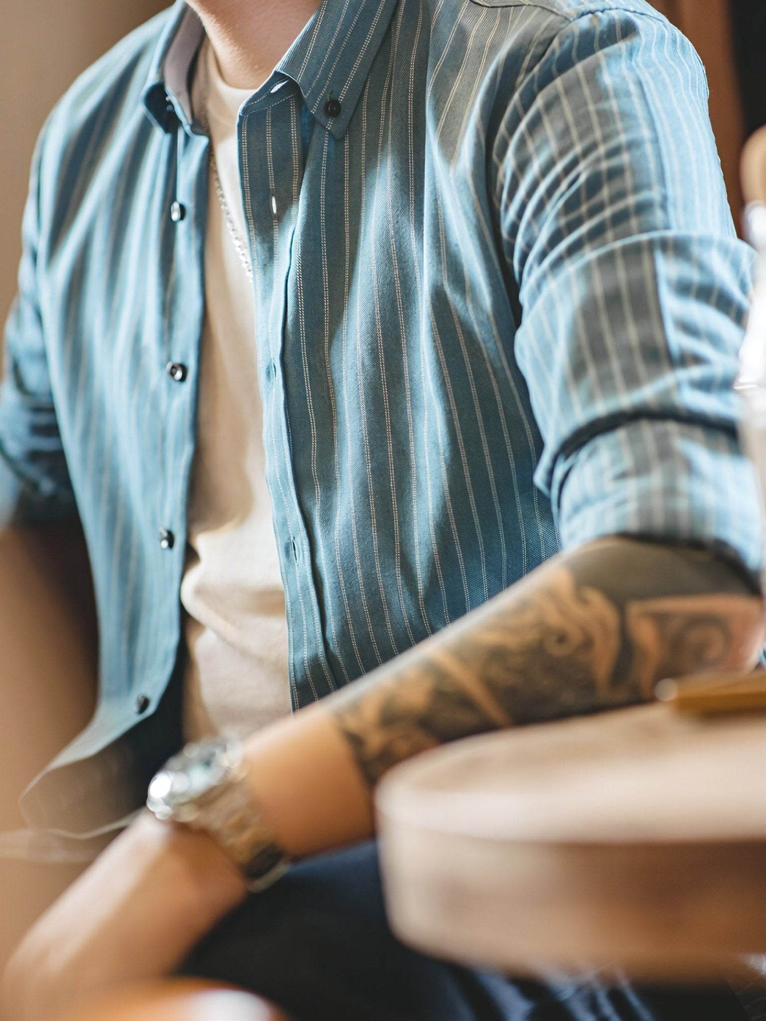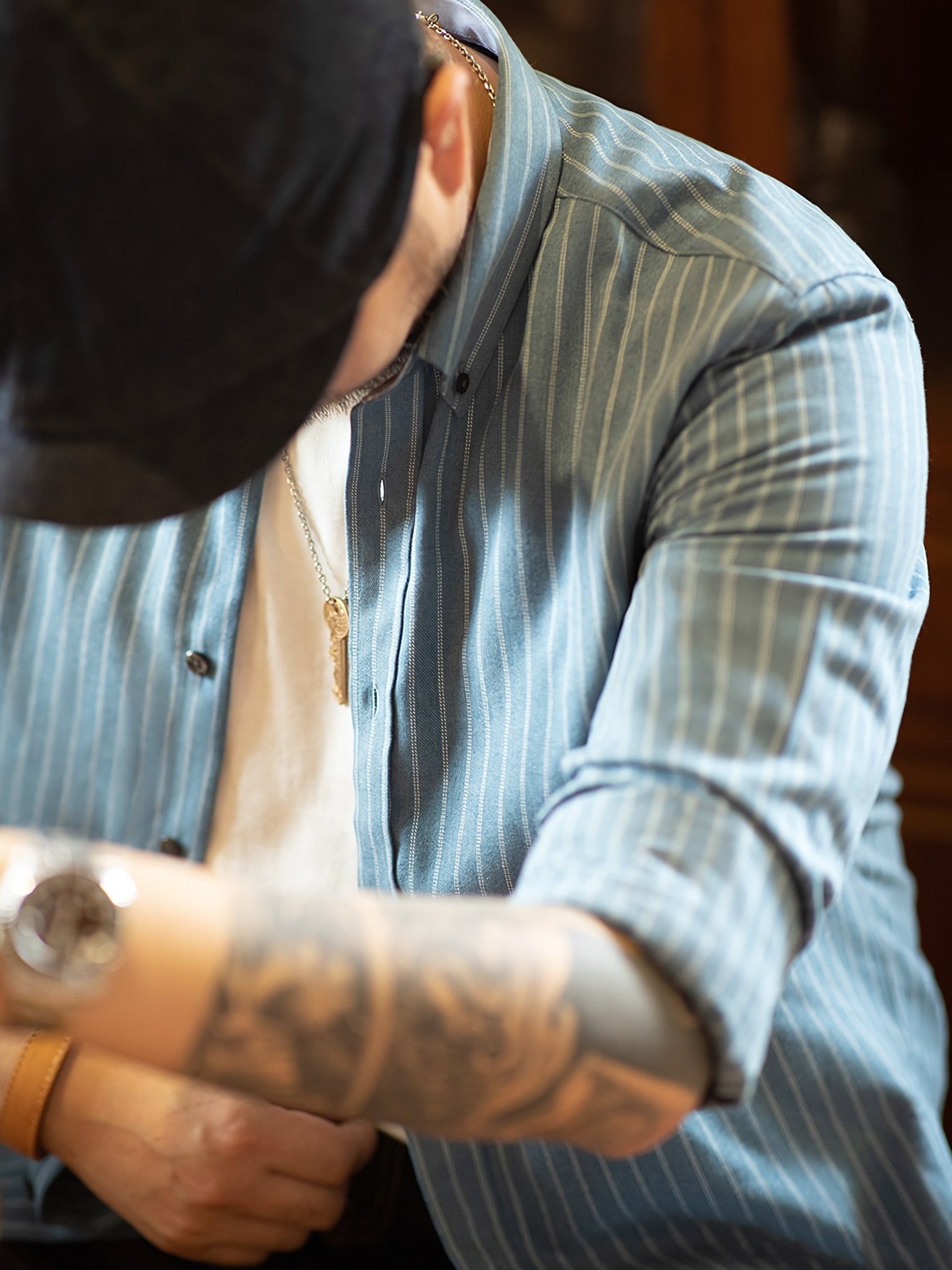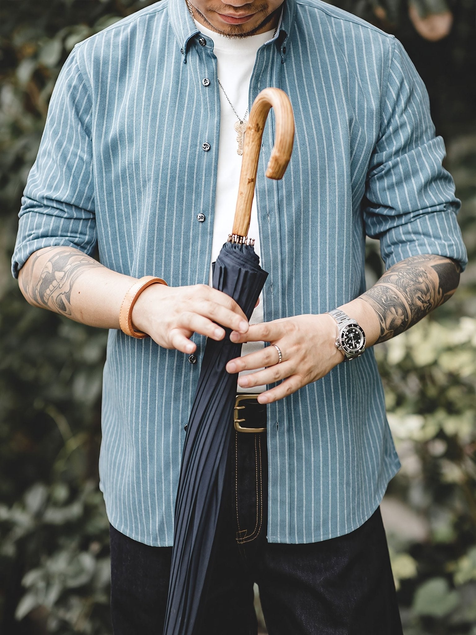 ボタンダウン仕様で、襟元がきちんと整って見えることがポイントです。また、袖口にはボタンがついており、調整が可能なので、自分に合ったフィット感で着用することができます。