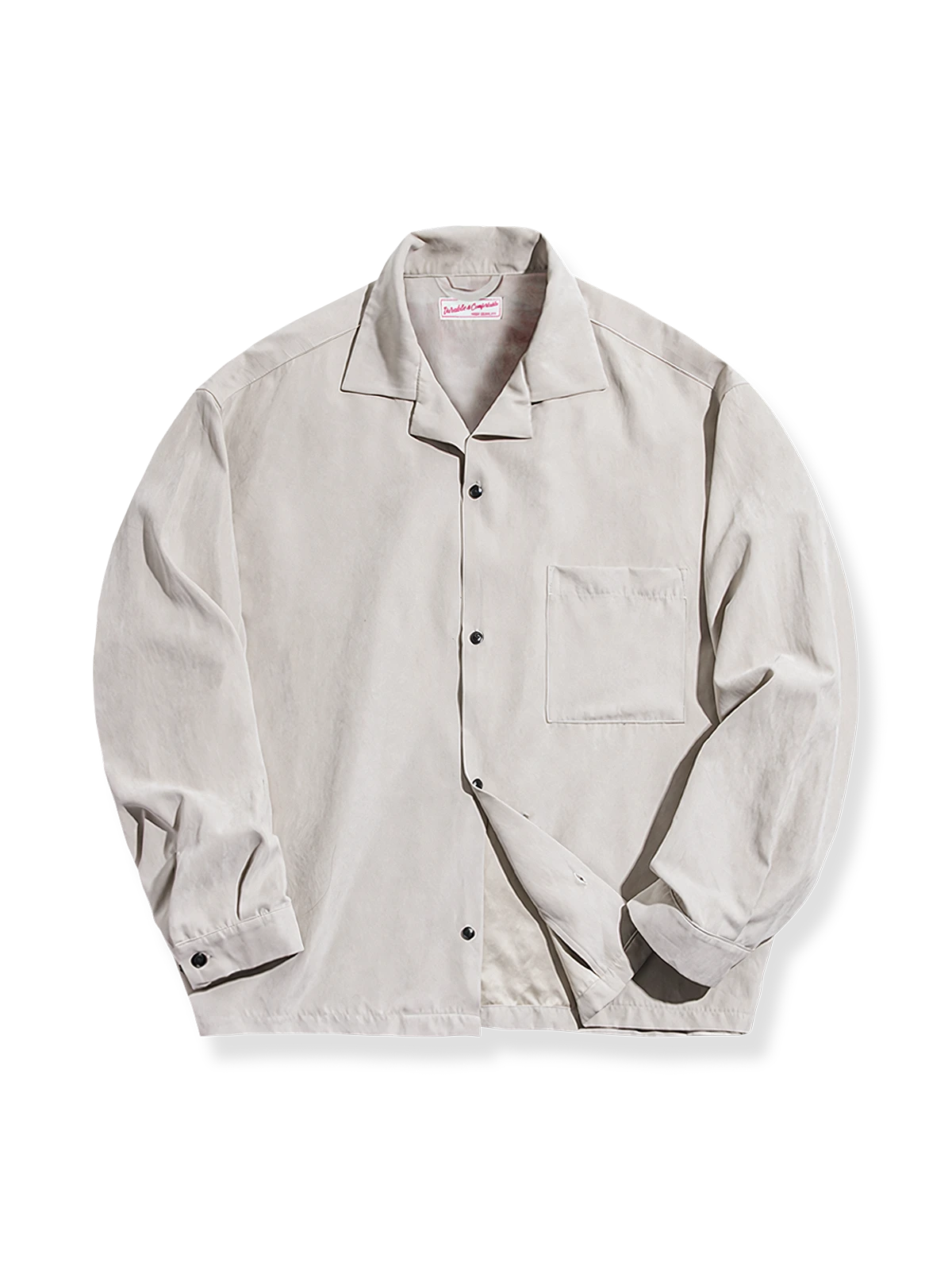 柔らかいポリエステル素材が桃の果皮のような質感を持ち、独特の風合いを生み出しています。しっかりとした綺麗なカットにより、どんなスタイルにもマッチするアイテムとなっています。
